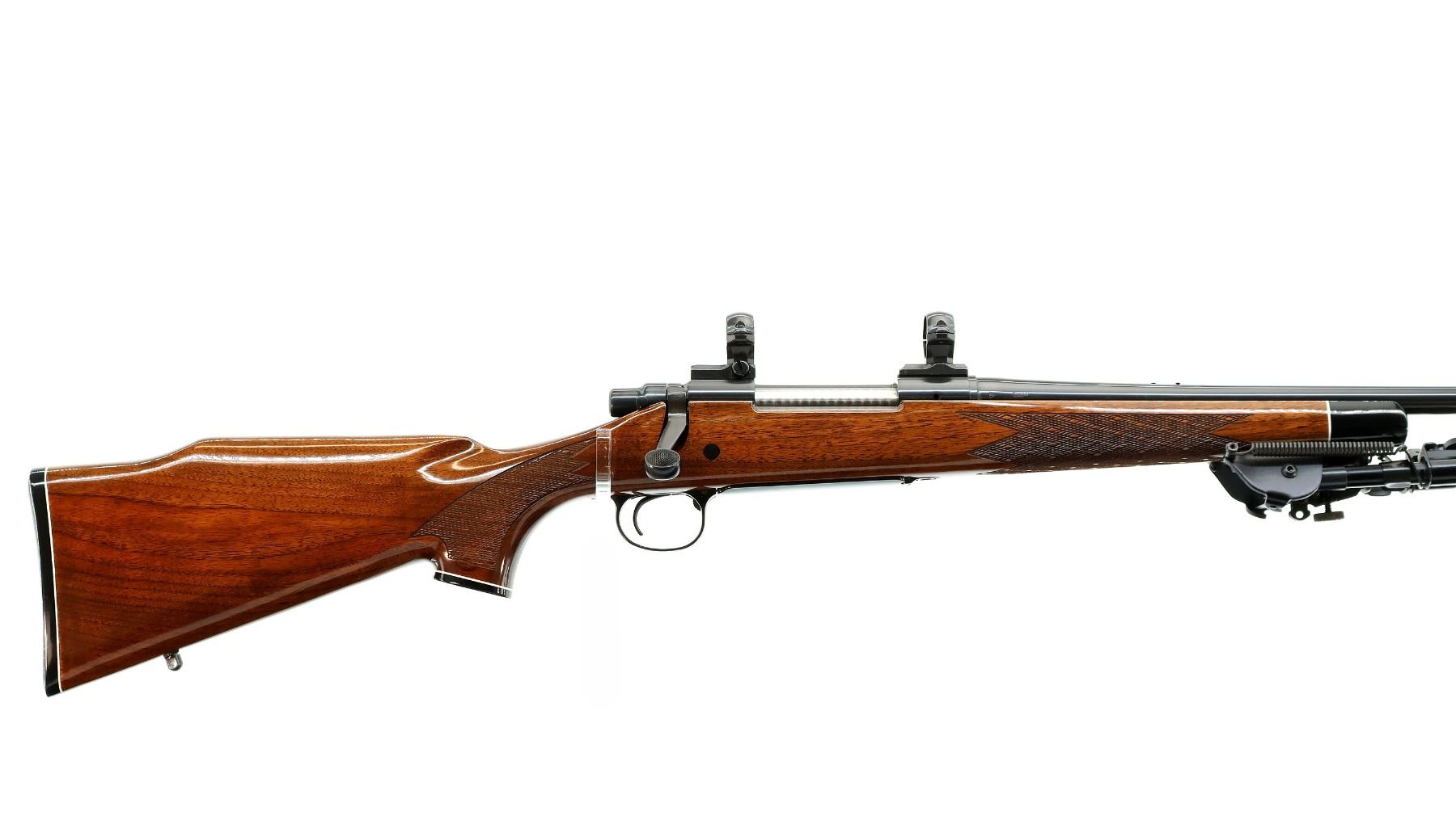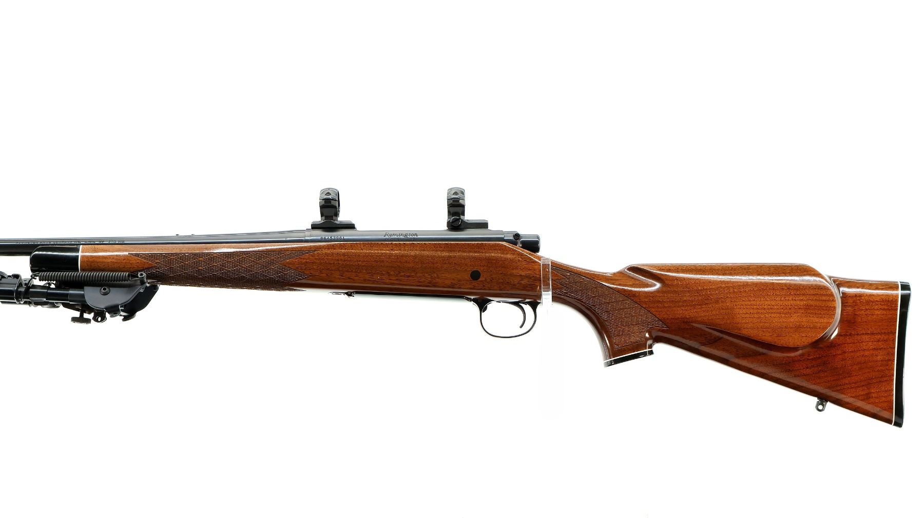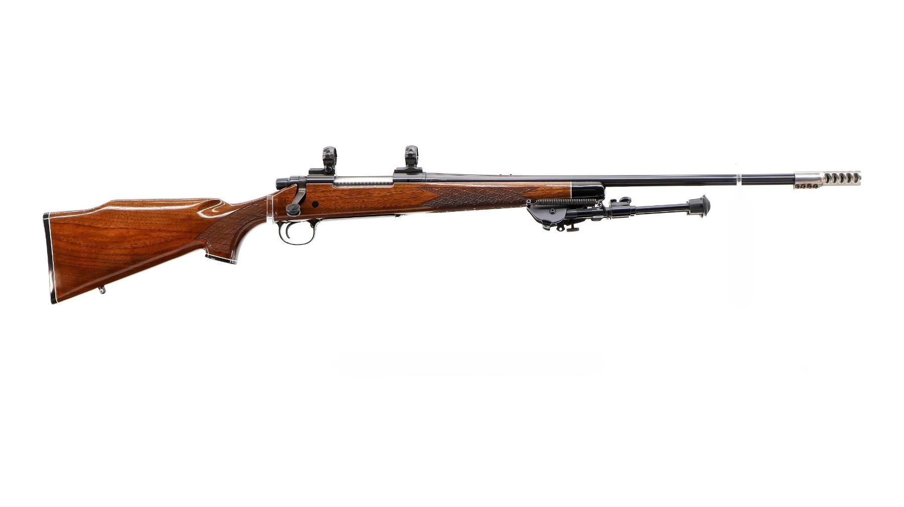Main Description: Missing front and rear sights, threaded holes present, polish blued finish, muzzle has a clamp on stainless ported brake installed, receiver drilled and tapped with two piece 1" millet rings, jeweled bolt with checkered knob. One piece gloss finish wood stock, black polymer forend and pistol grip caps, checkered forearm and pistol grip and black polymer butt plate. Cheek rest, hinged floor plate, swivel studs with Harris 1A2 Ultra Light adjustable folding bipod installed.