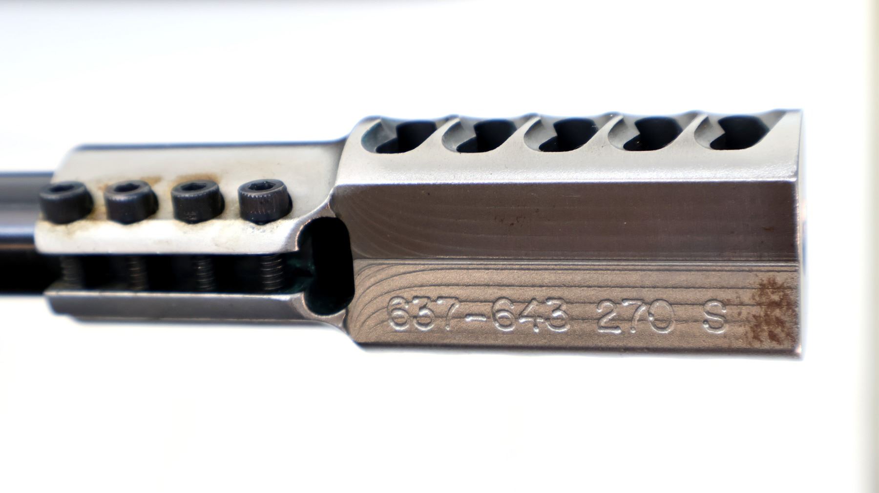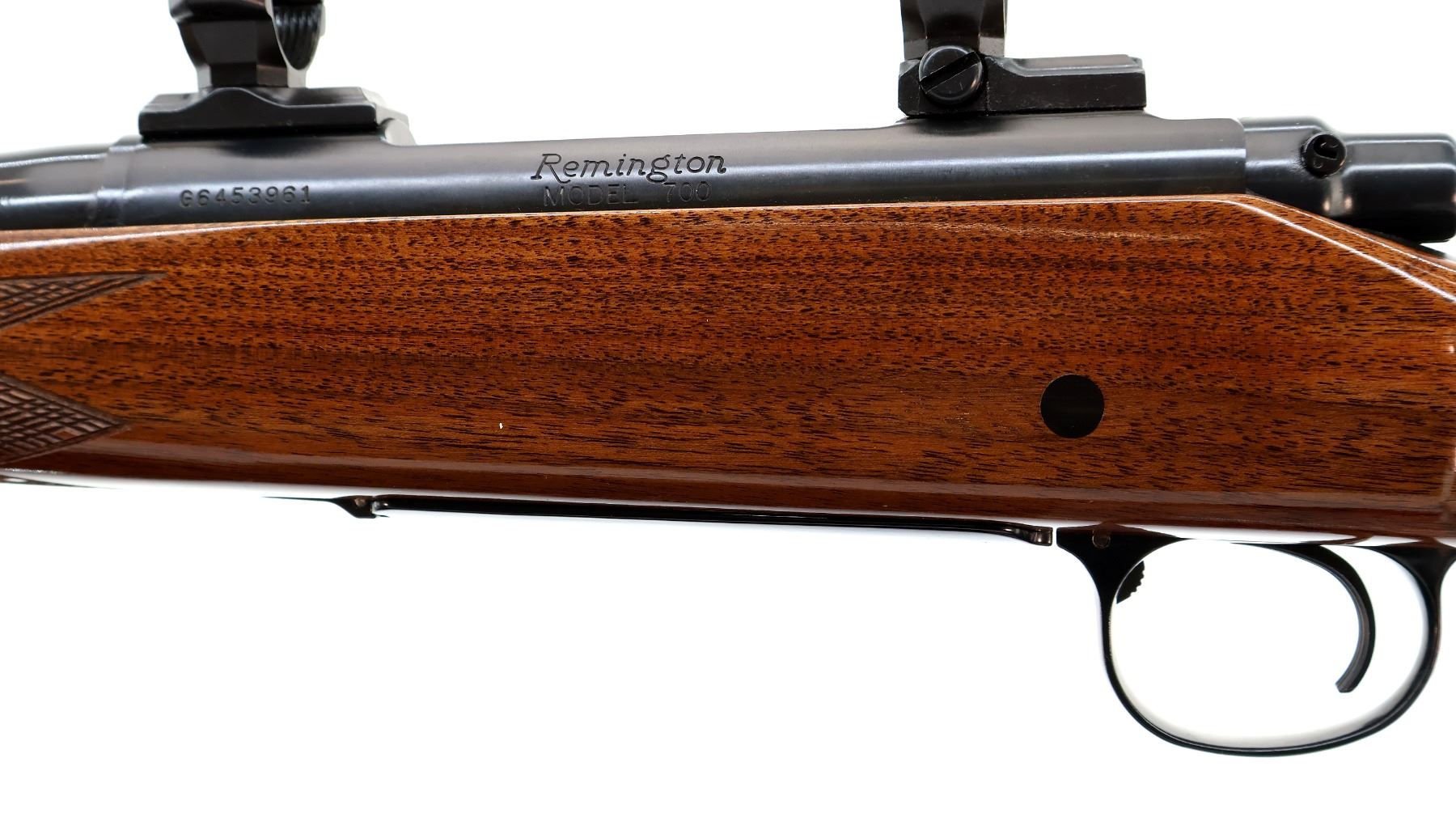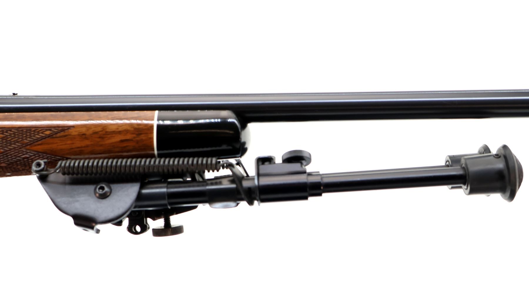 Main Description: Missing front and rear sights, threaded holes present, polish blued finish, muzzle has a clamp on stainless ported brake installed, receiver drilled and tapped with two piece 1" millet rings, jeweled bolt with checkered knob. One piece gloss finish wood stock, black polymer forend and pistol grip caps, checkered forearm and pistol grip and black polymer butt plate. Cheek rest, hinged floor plate, swivel studs with Harris 1A2 Ultra Light adjustable folding bipod installed.