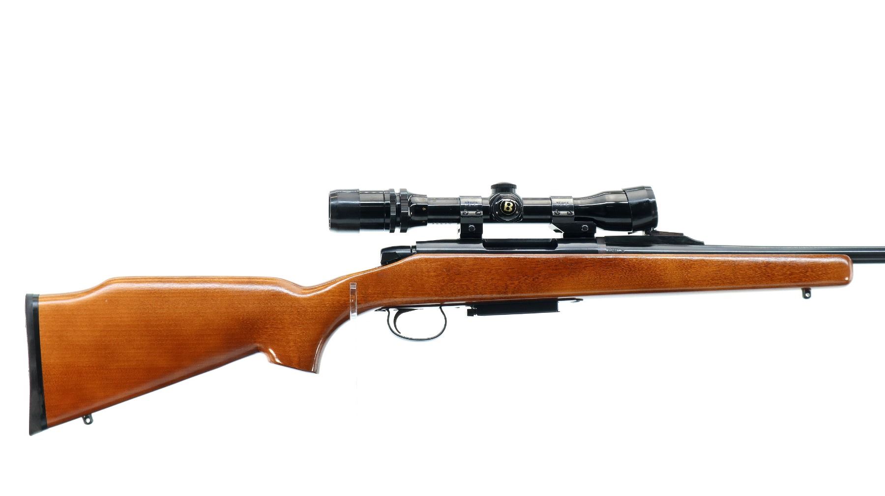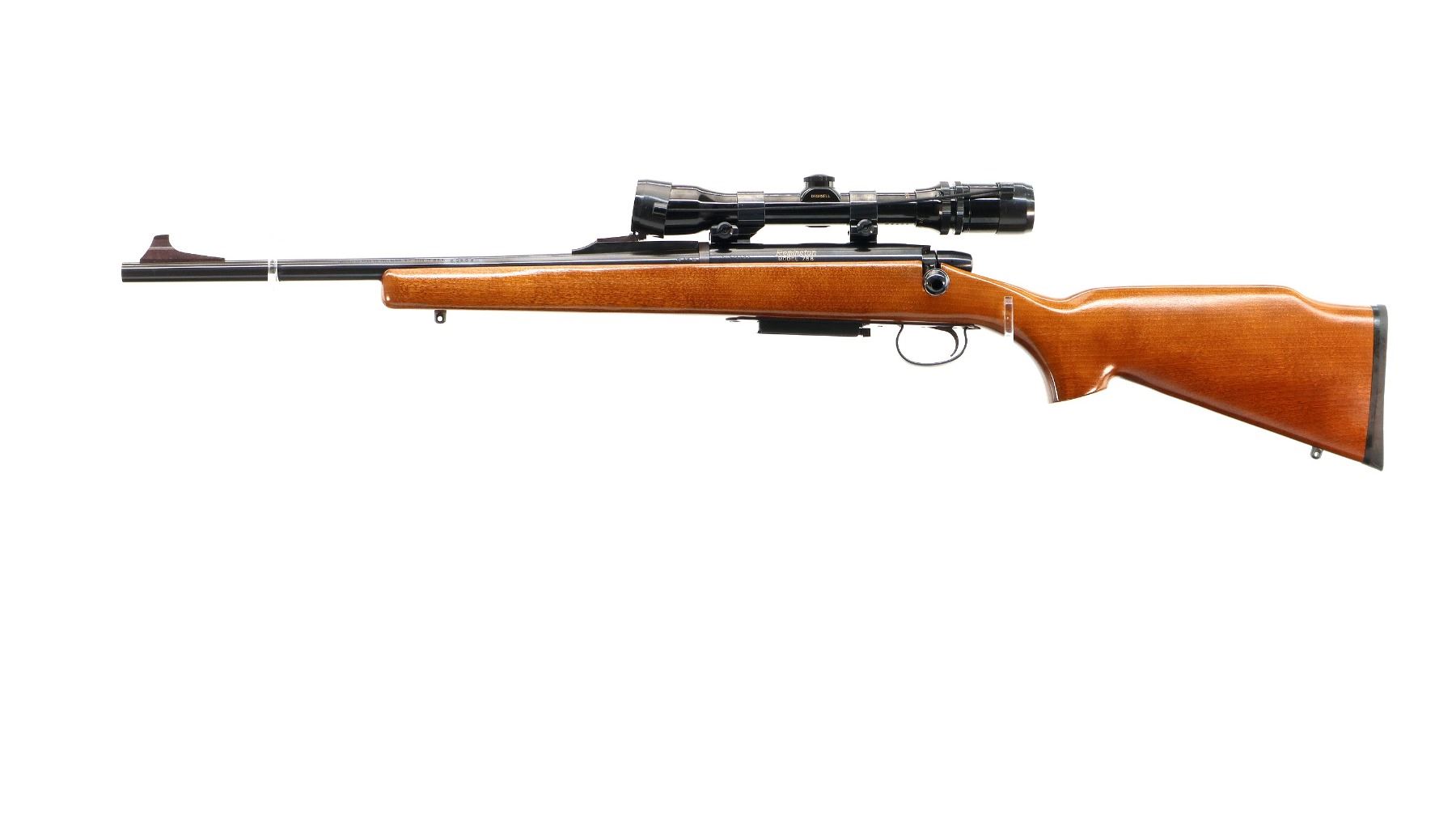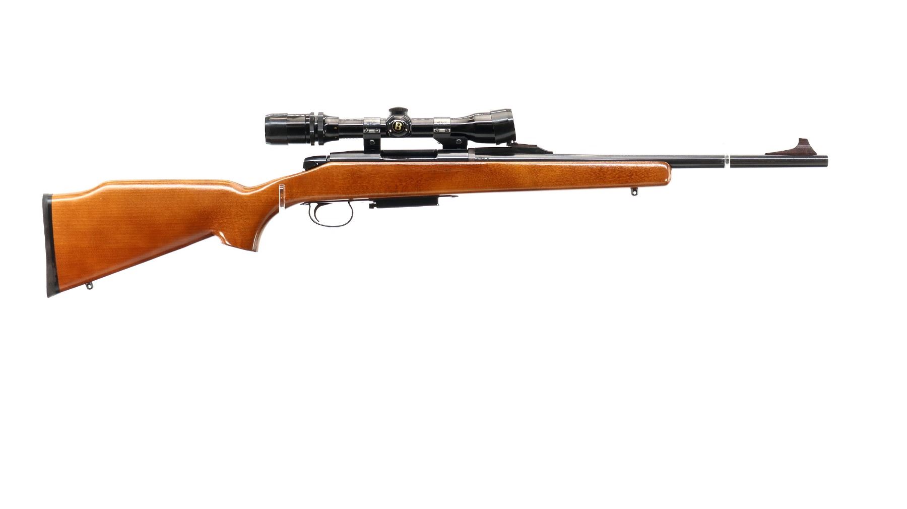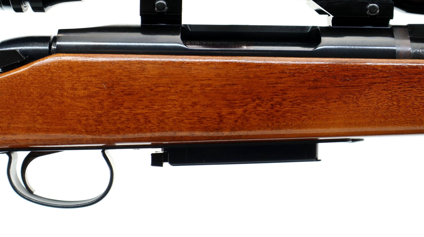 Main Description: Blade front sight with ramp, adjustable u notched rear sight, polish blued finish, rifle has been rechambered and stamped on left side of barrel, receiver drilled and tapped with Bushnell Scopechief VI 2.5-8x32 scope installed, clear optics with duplex reticle. Right hand ejection port, left hand bolt. One piece wood stock, pistol grip, raised comb, black rubber recoil pad, swivel studs.
