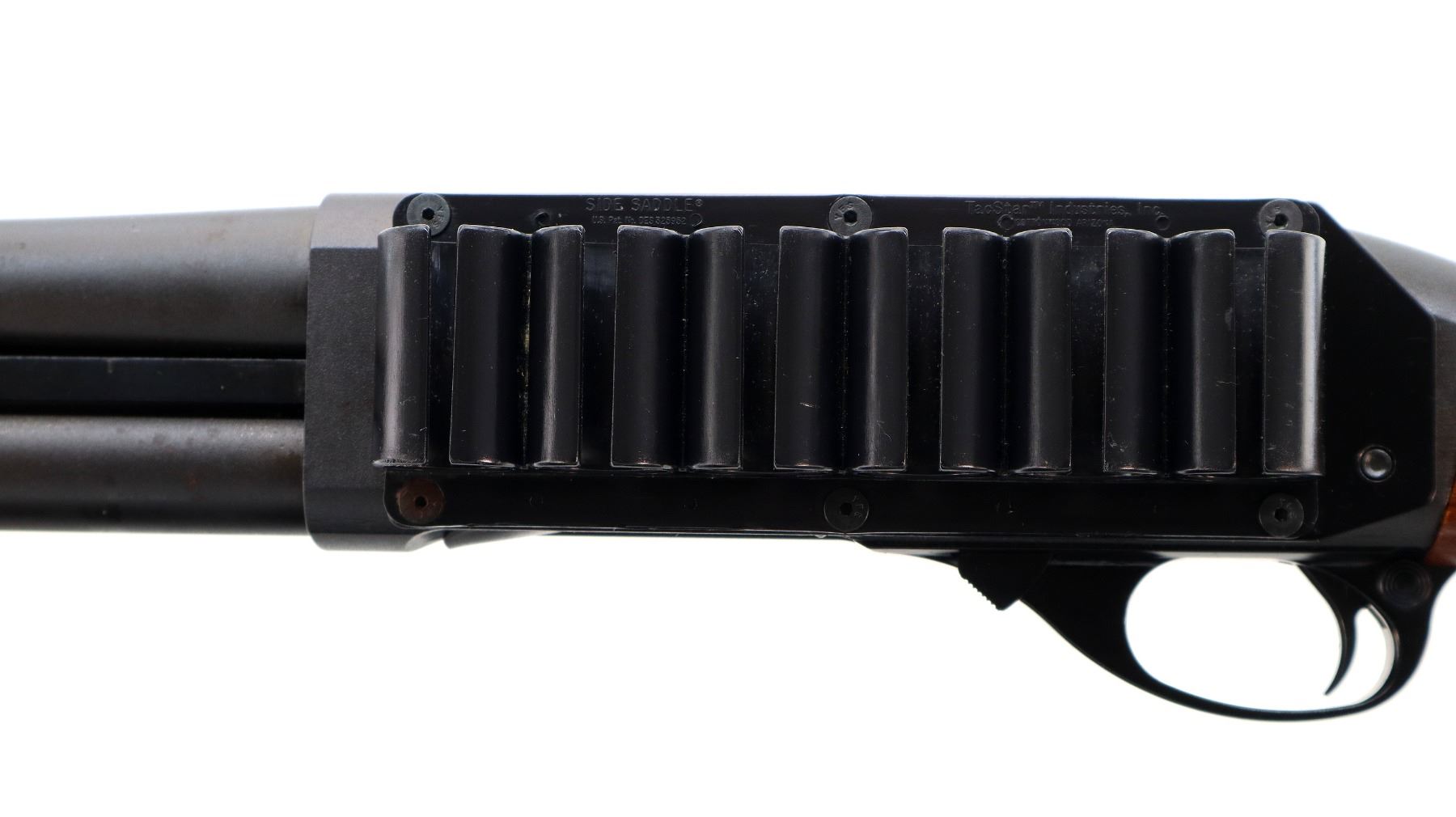 Main Description: Blade front sight with ramp, adjustable u notched rear sight, Parkerized metal finish, non-magnum receiver with TacStar 6 round sidesaddle installed. Two piece wood stocks, checkered forearm and pistol grip, black rubber recoil pad.