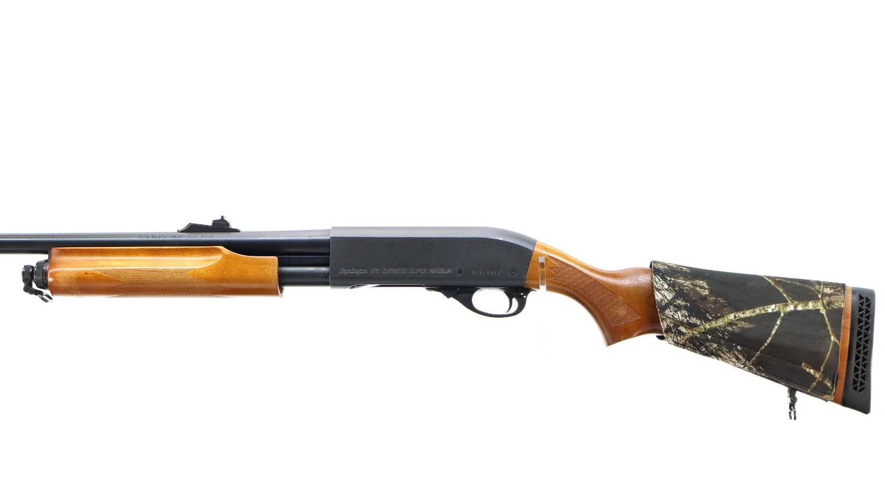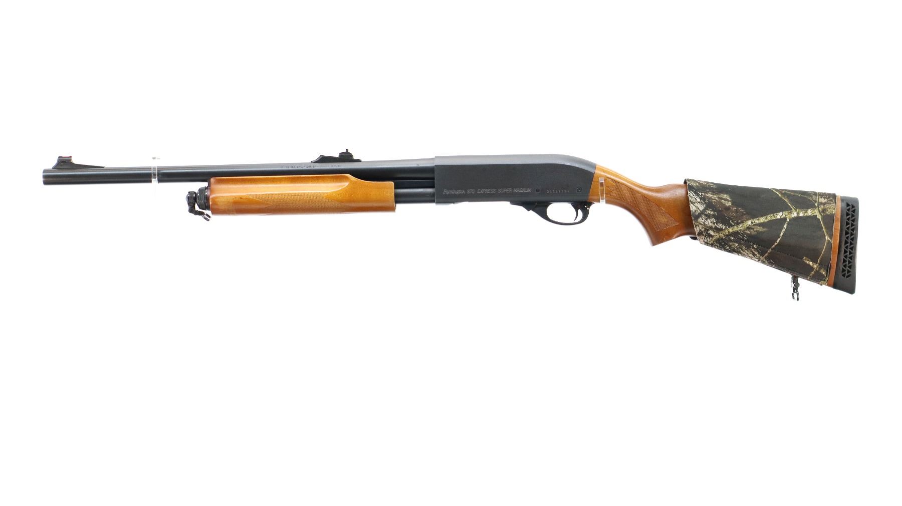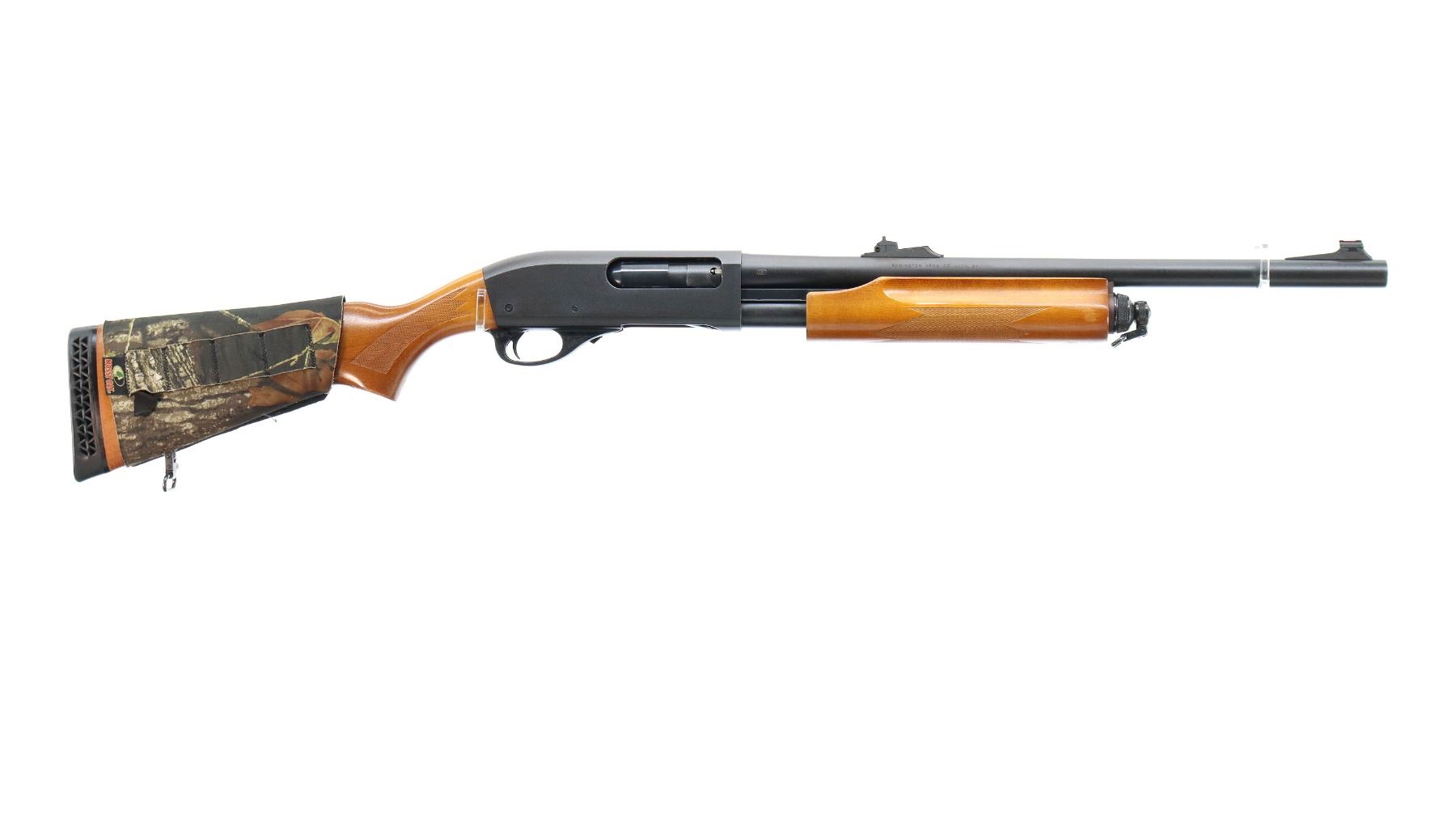 Main Description: Red fiber optic blade front side with ramp, adjustable u notched rear sight, Satin blued finish. Two piece wood stocks, finger grooved checkered forearm and pistol grip, wrap around 4 round camo shell holder, black vented rubber recoil pad, sling swivels, receiver will accept 12 G X 3 1/2" Shells with proper barrel.