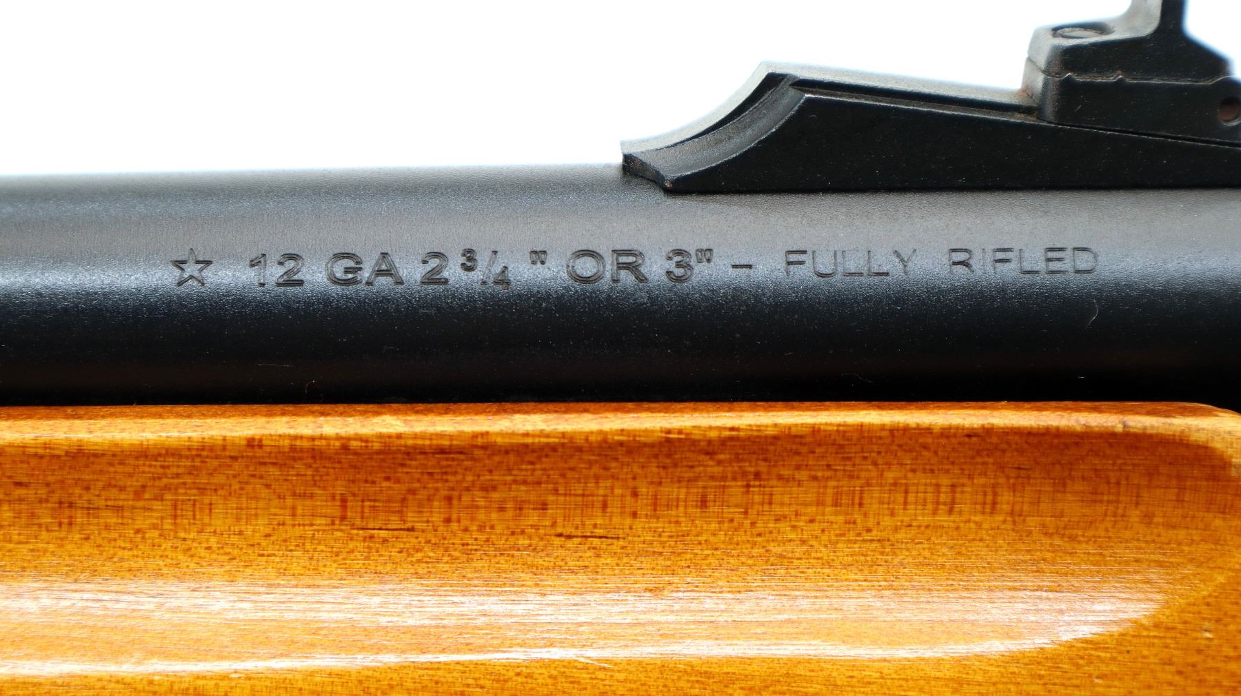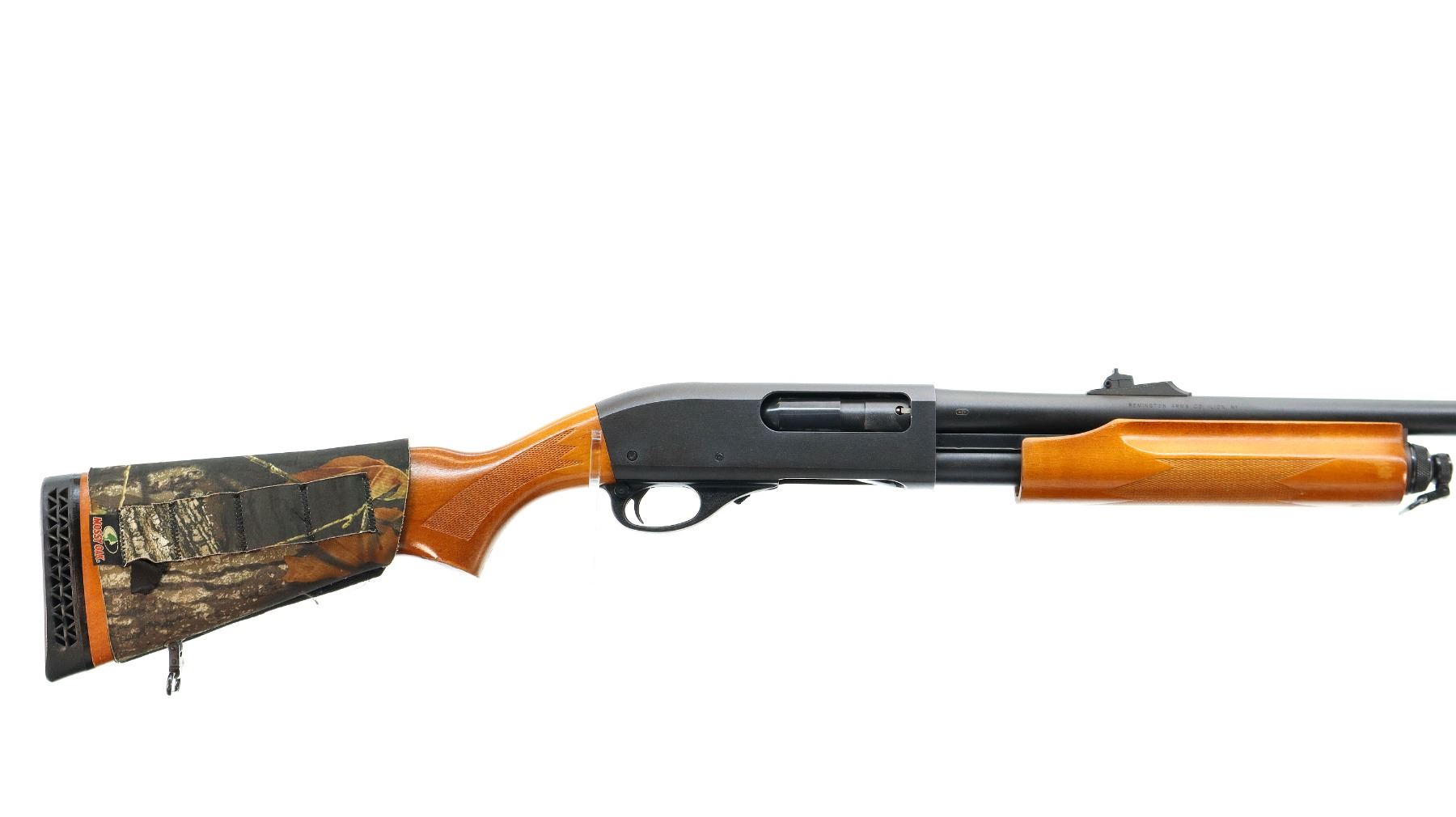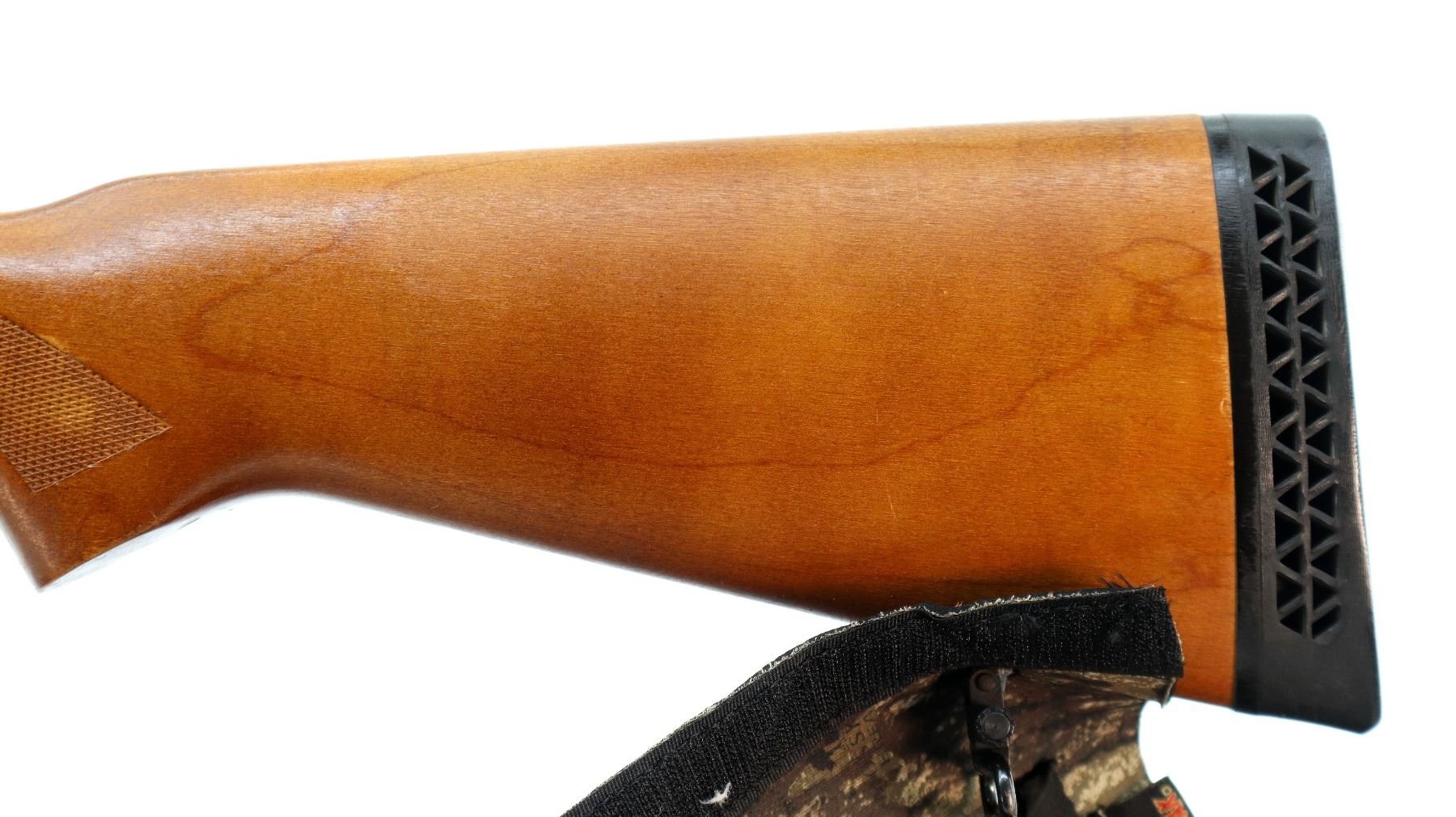 Main Description: Red fiber optic blade front side with ramp, adjustable u notched rear sight, Satin blued finish. Two piece wood stocks, finger grooved checkered forearm and pistol grip, wrap around 4 round camo shell holder, black vented rubber recoil pad, sling swivels, receiver will accept 12 G X 3 1/2" Shells with proper barrel.