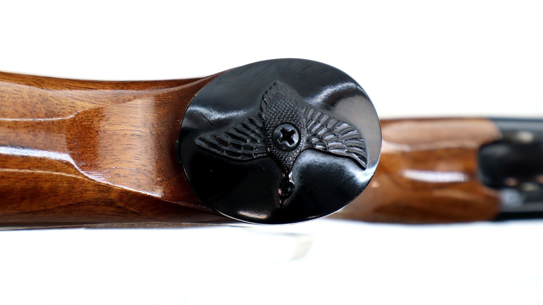 Main Description: Silver bead, blued finish, vent rib. Two piece wood stocks, finger grooved checkered forearm and pistol grip, black rubber recoil pad, grip cap, rear swivel stud only.