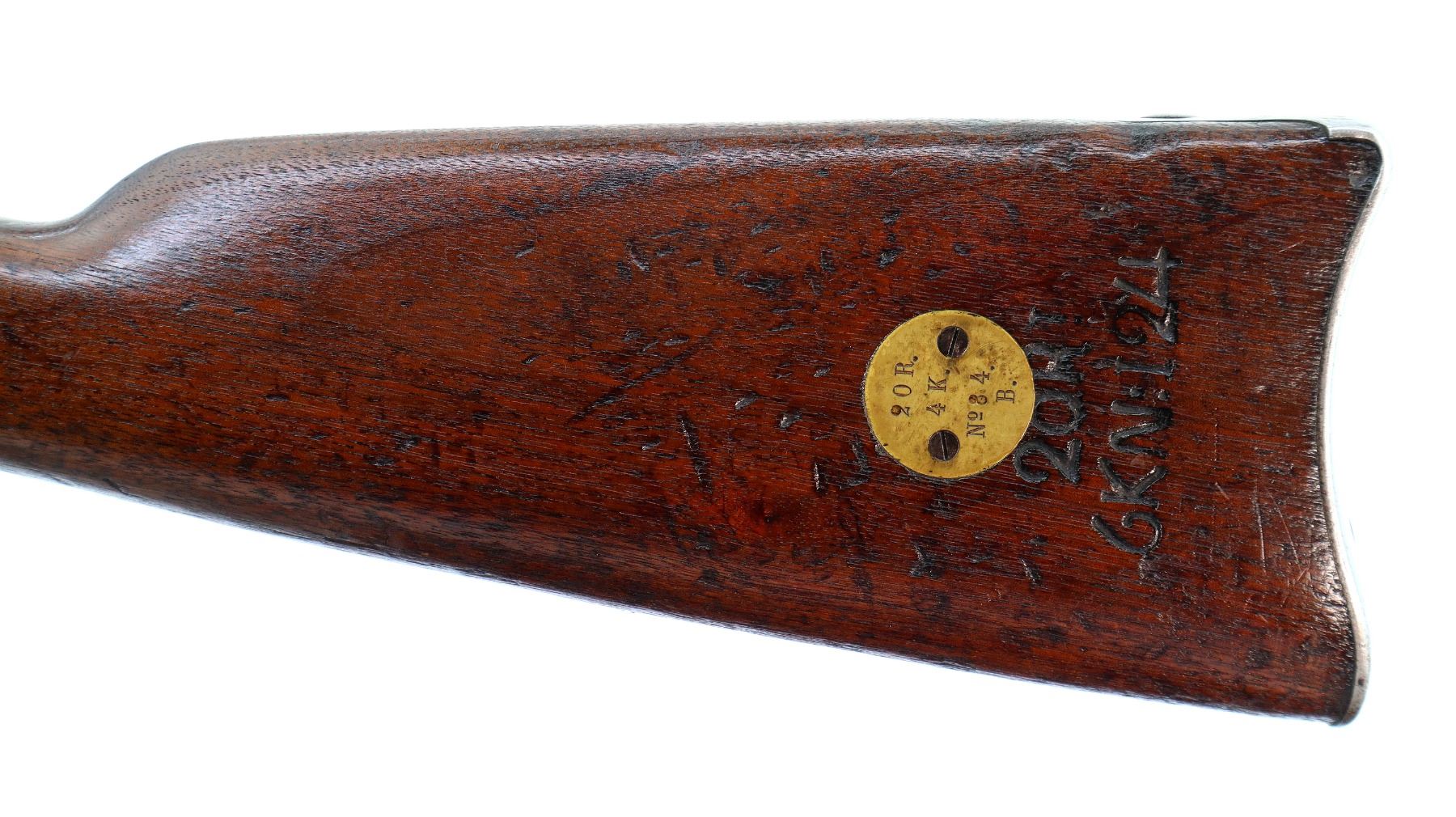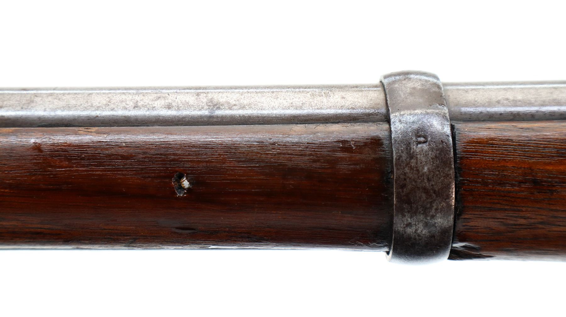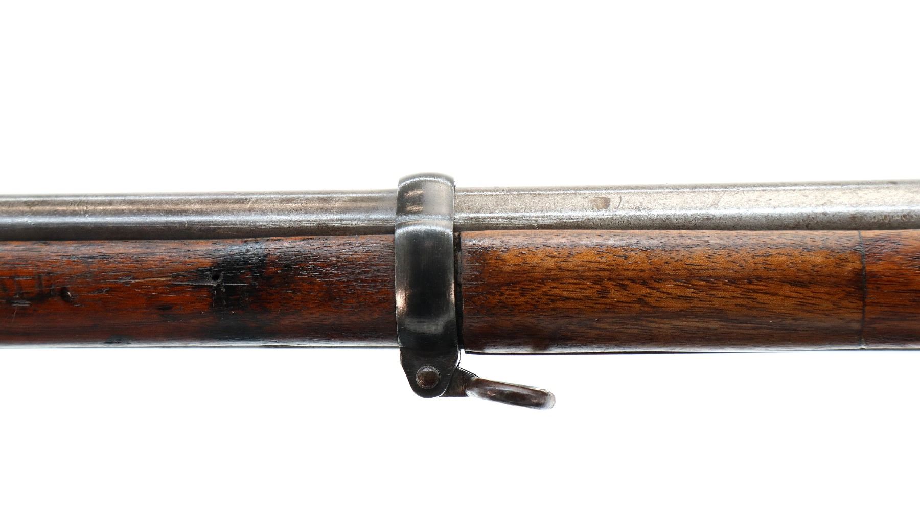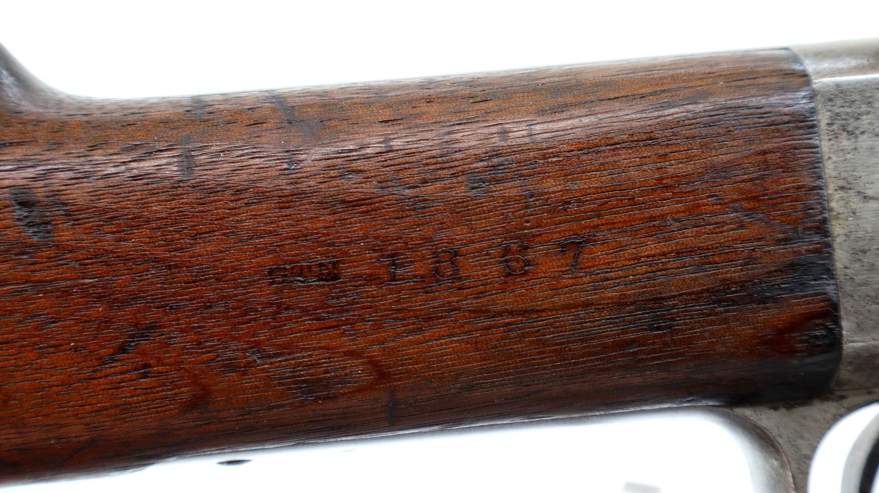 Main Description: Dated 1867, serial numbers mismatched. Blade front sight with ramp, adjustable u notched ladder rear sight, tapered round barrel, checkered spur hammer and opening lever, extractor is present. Two piece full military wood stocks, forearm is chipped and spliced together from two pieces, straight grip, smooth steel butt plate, brass stock disk and markings on left side, missing rear swivel hole is present, has the front swivel and cleaning rod.