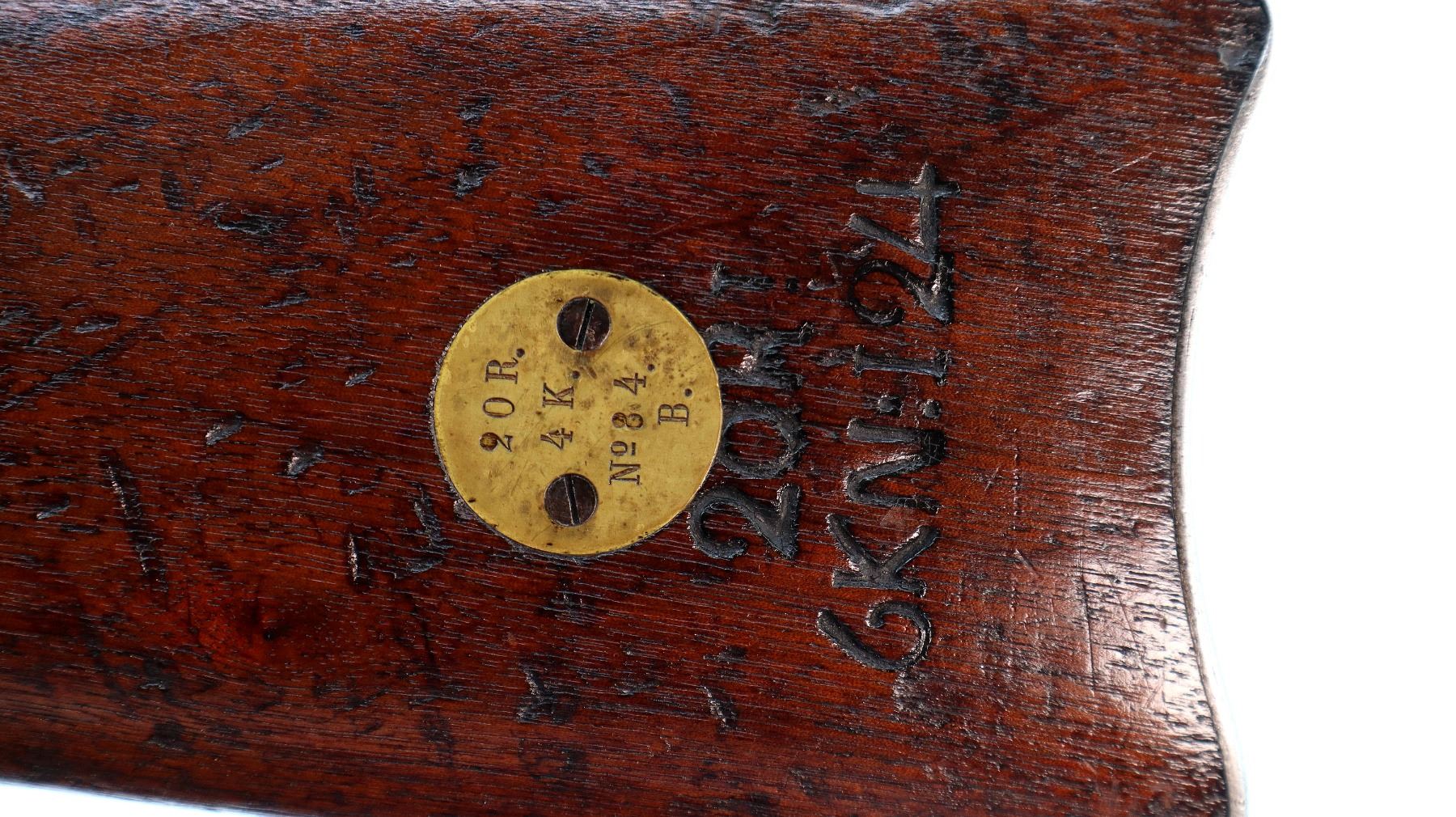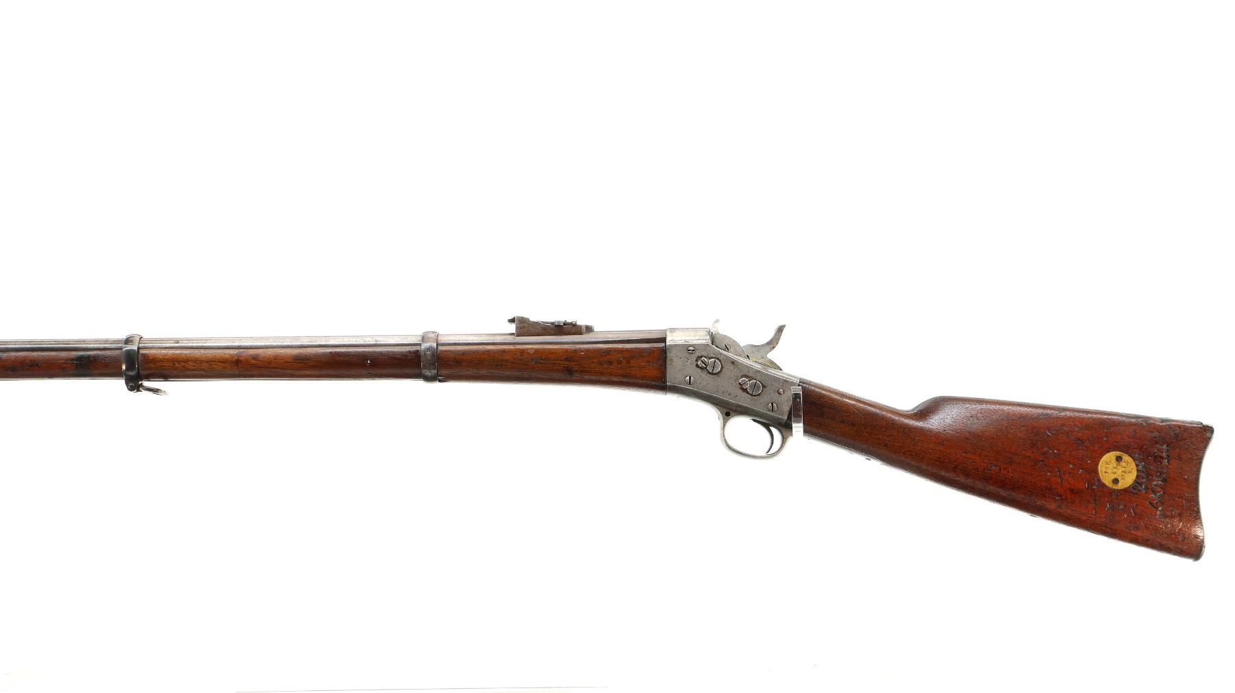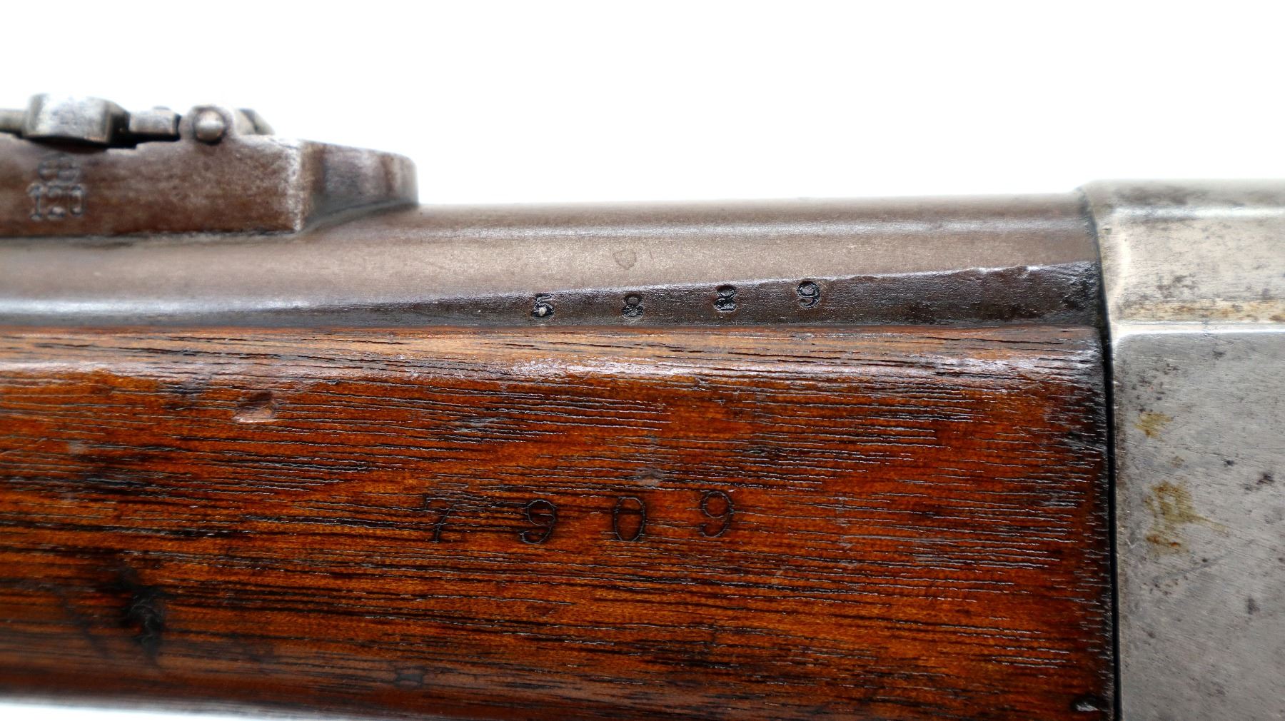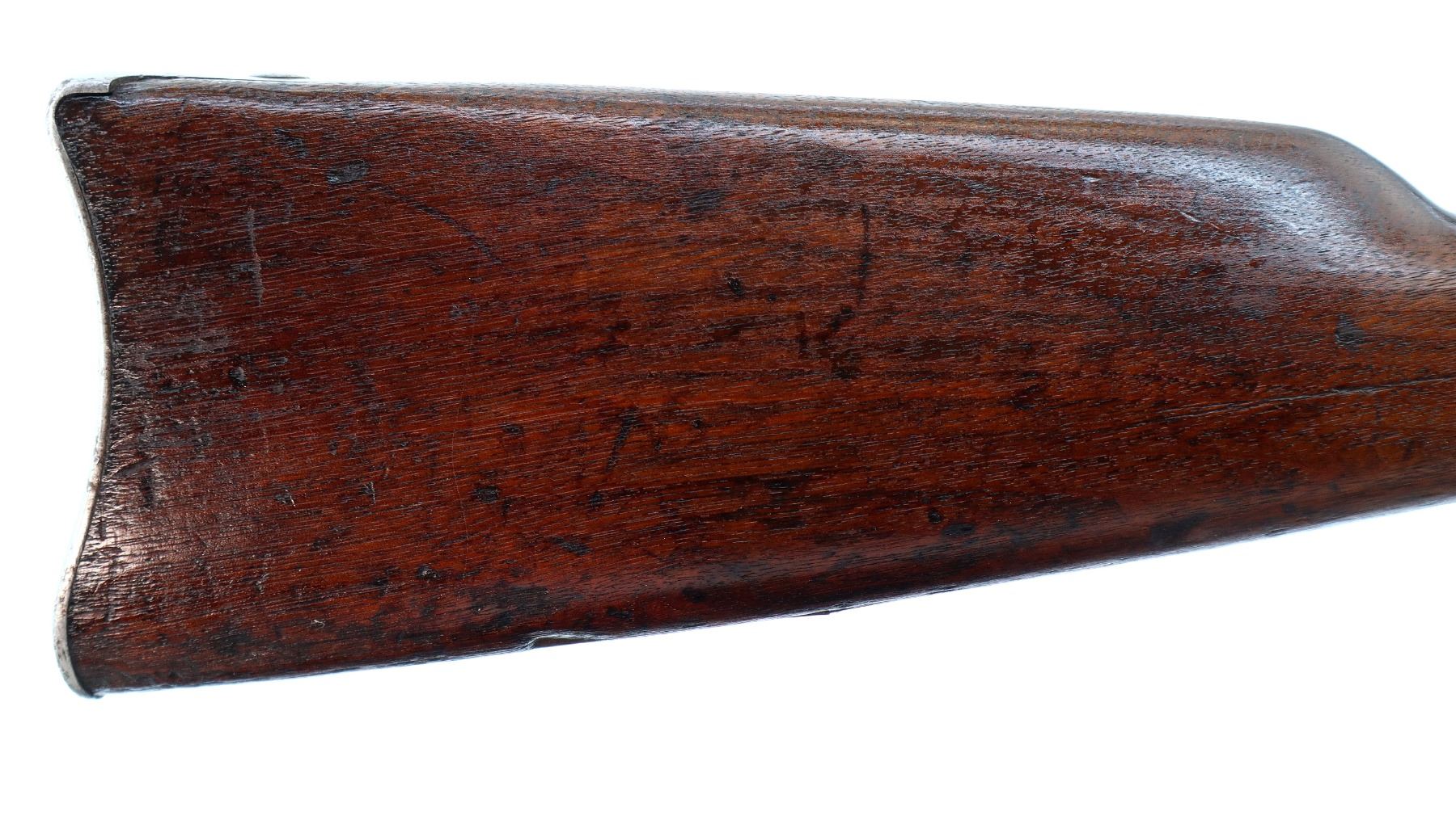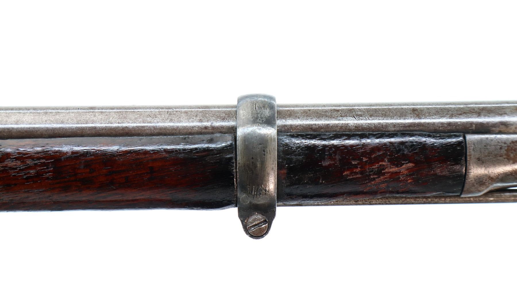 Main Description: Dated 1867, serial numbers mismatched. Blade front sight with ramp, adjustable u notched ladder rear sight, tapered round barrel, checkered spur hammer and opening lever, extractor is present. Two piece full military wood stocks, forearm is chipped and spliced together from two pieces, straight grip, smooth steel butt plate, brass stock disk and markings on left side, missing rear swivel hole is present, has the front swivel and cleaning rod.