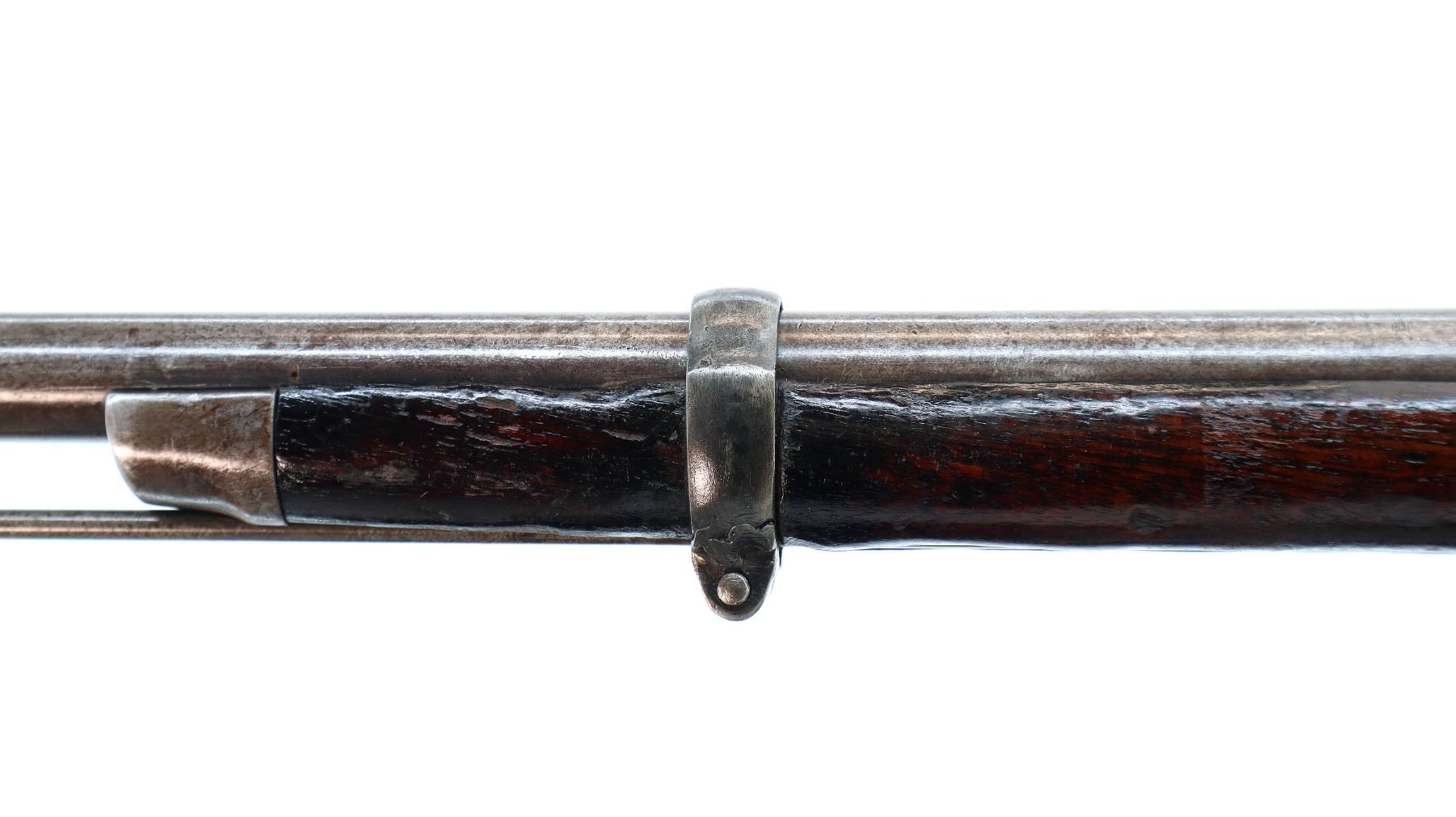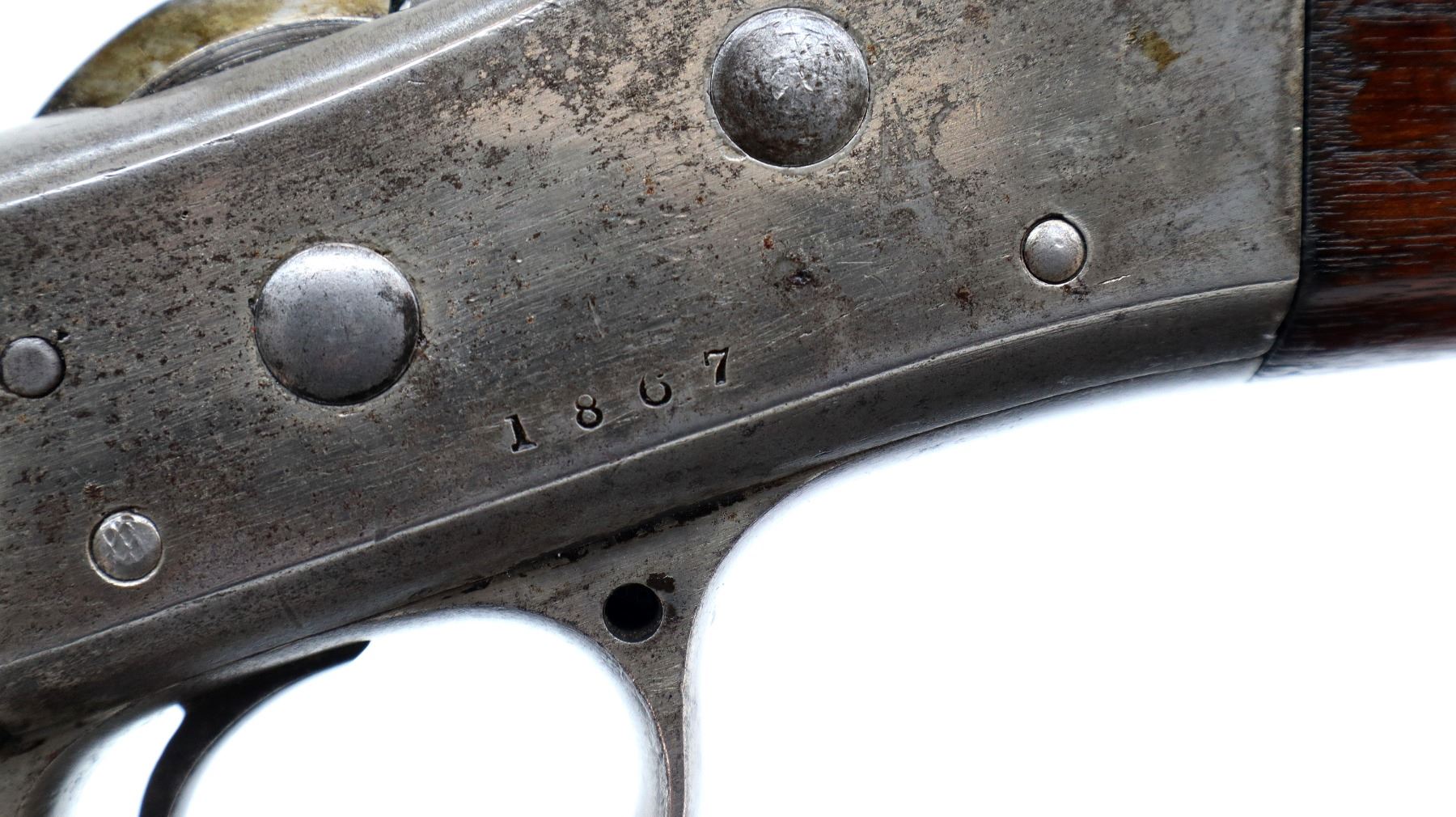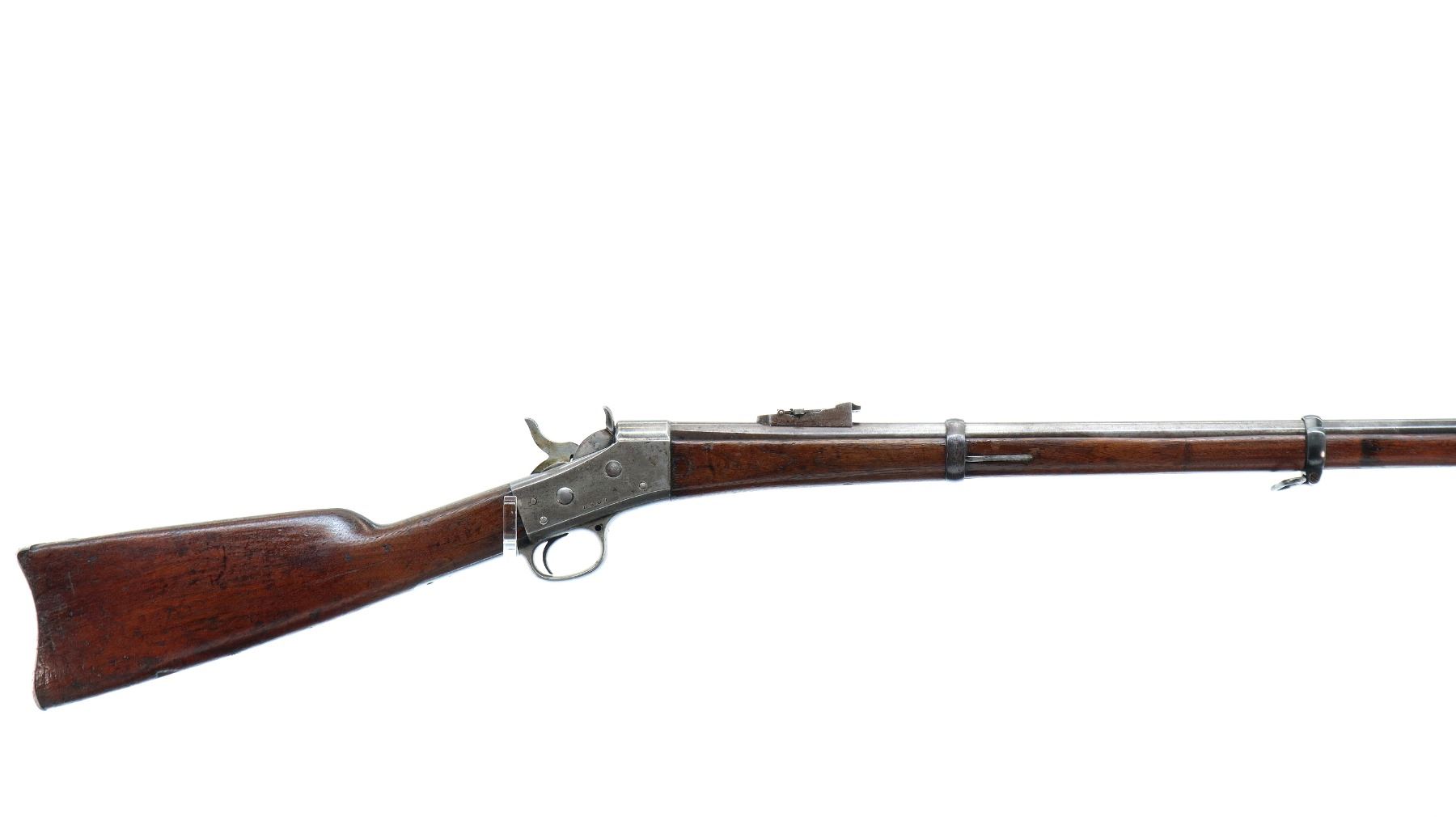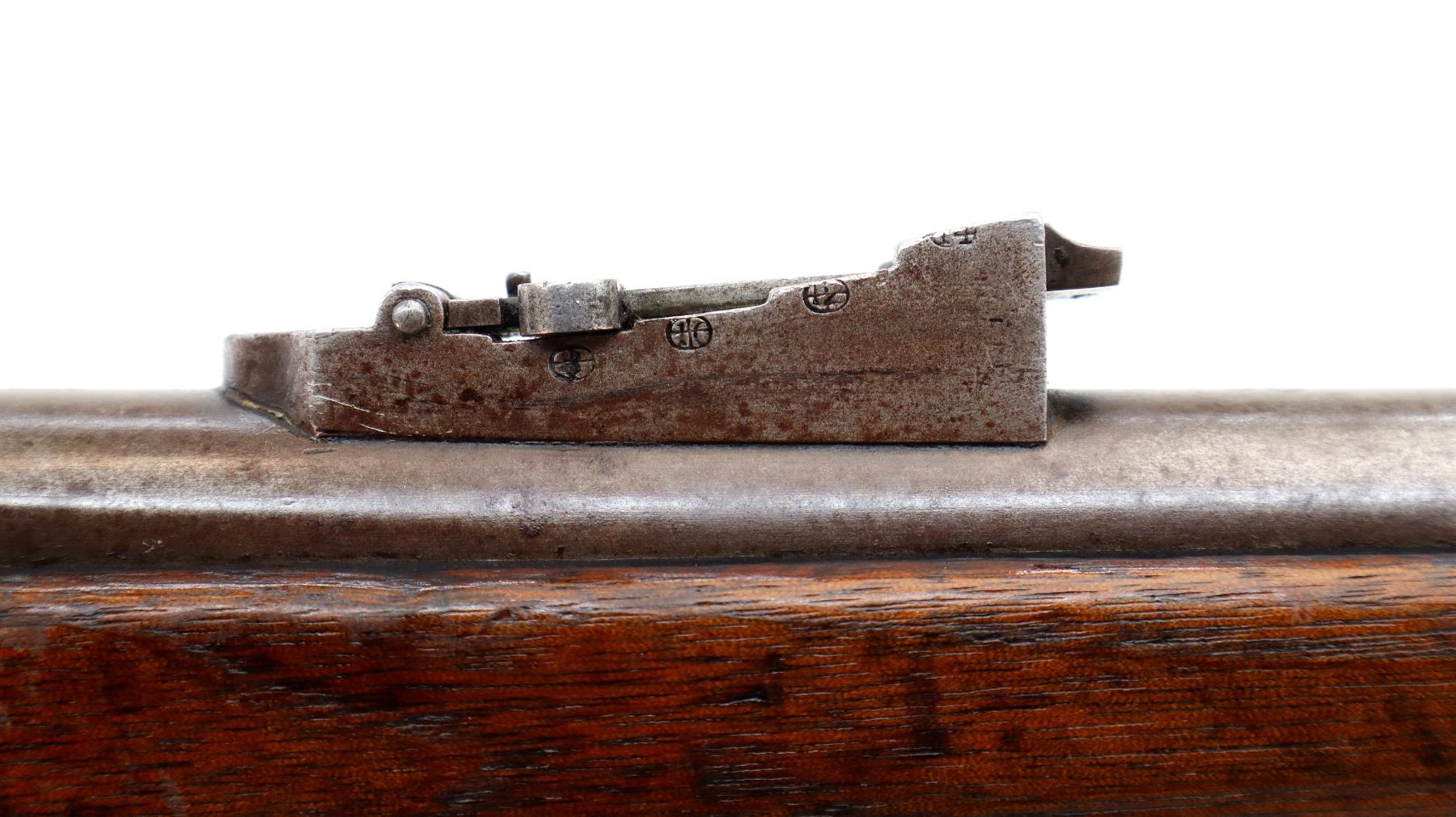 Main Description: Dated 1867, serial numbers mismatched. Blade front sight with ramp, adjustable u notched ladder rear sight, tapered round barrel, checkered spur hammer and opening lever, extractor is present. Two piece full military wood stocks, forearm is chipped and spliced together from two pieces, straight grip, smooth steel butt plate, brass stock disk and markings on left side, missing rear swivel hole is present, has the front swivel and cleaning rod.