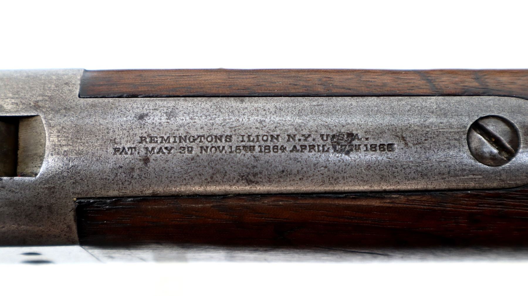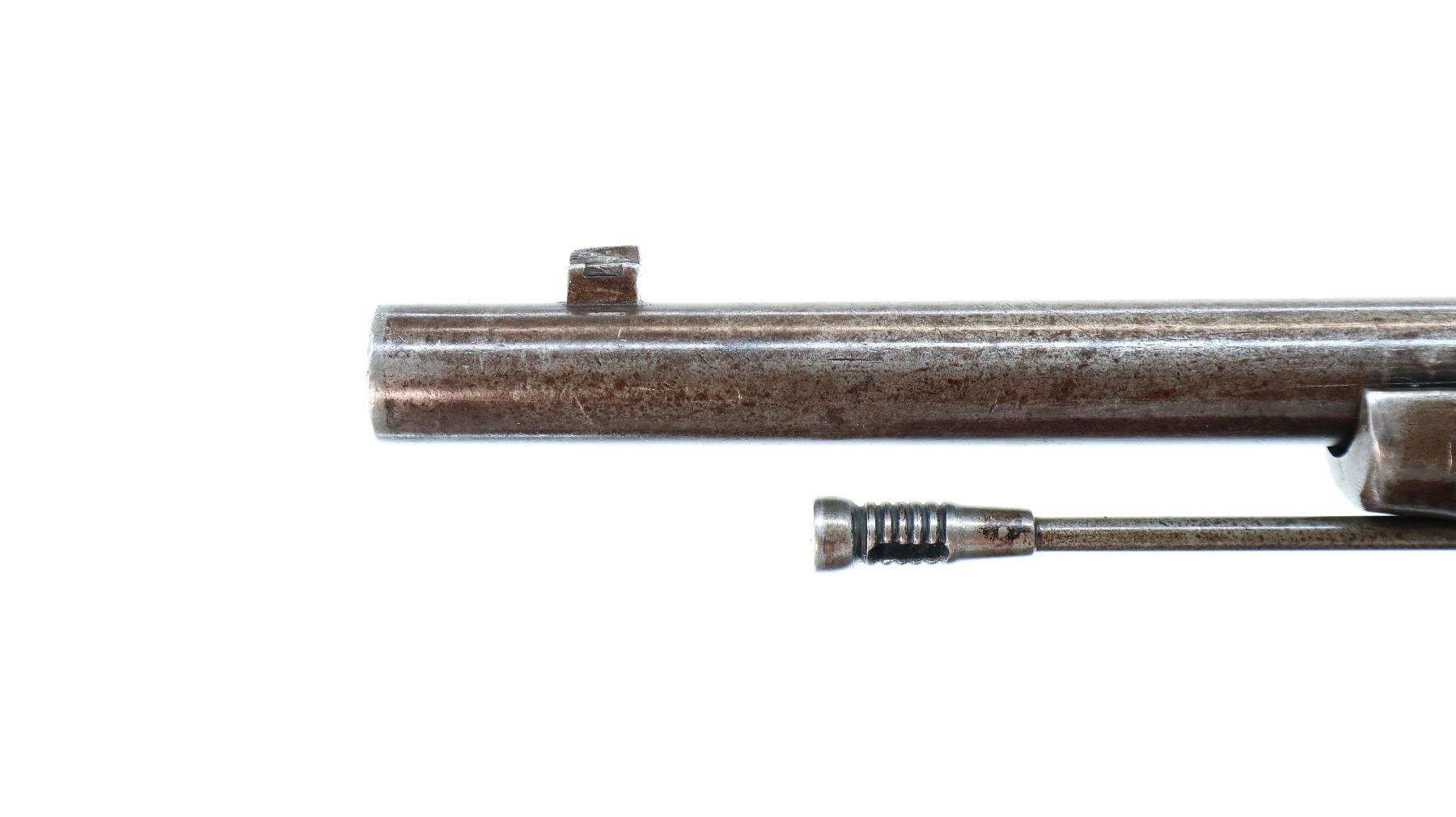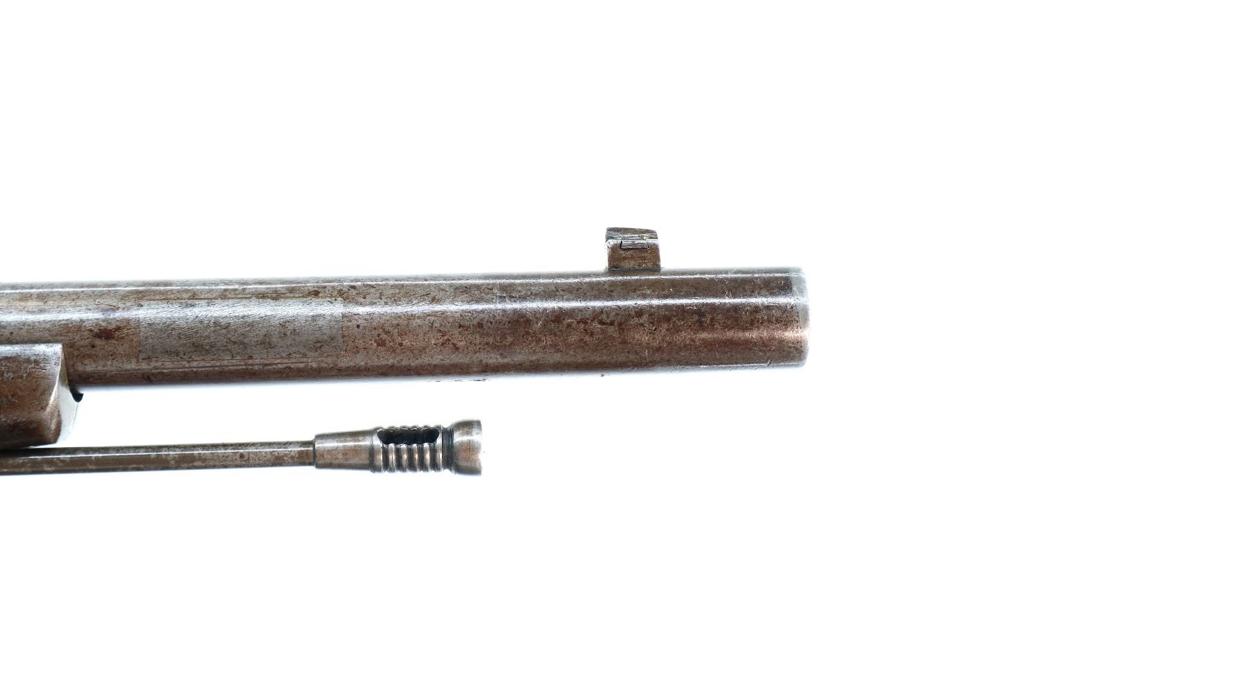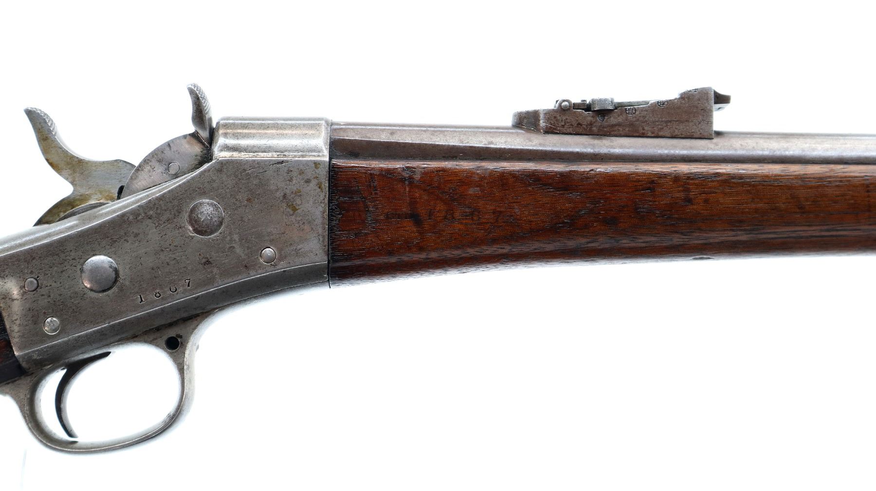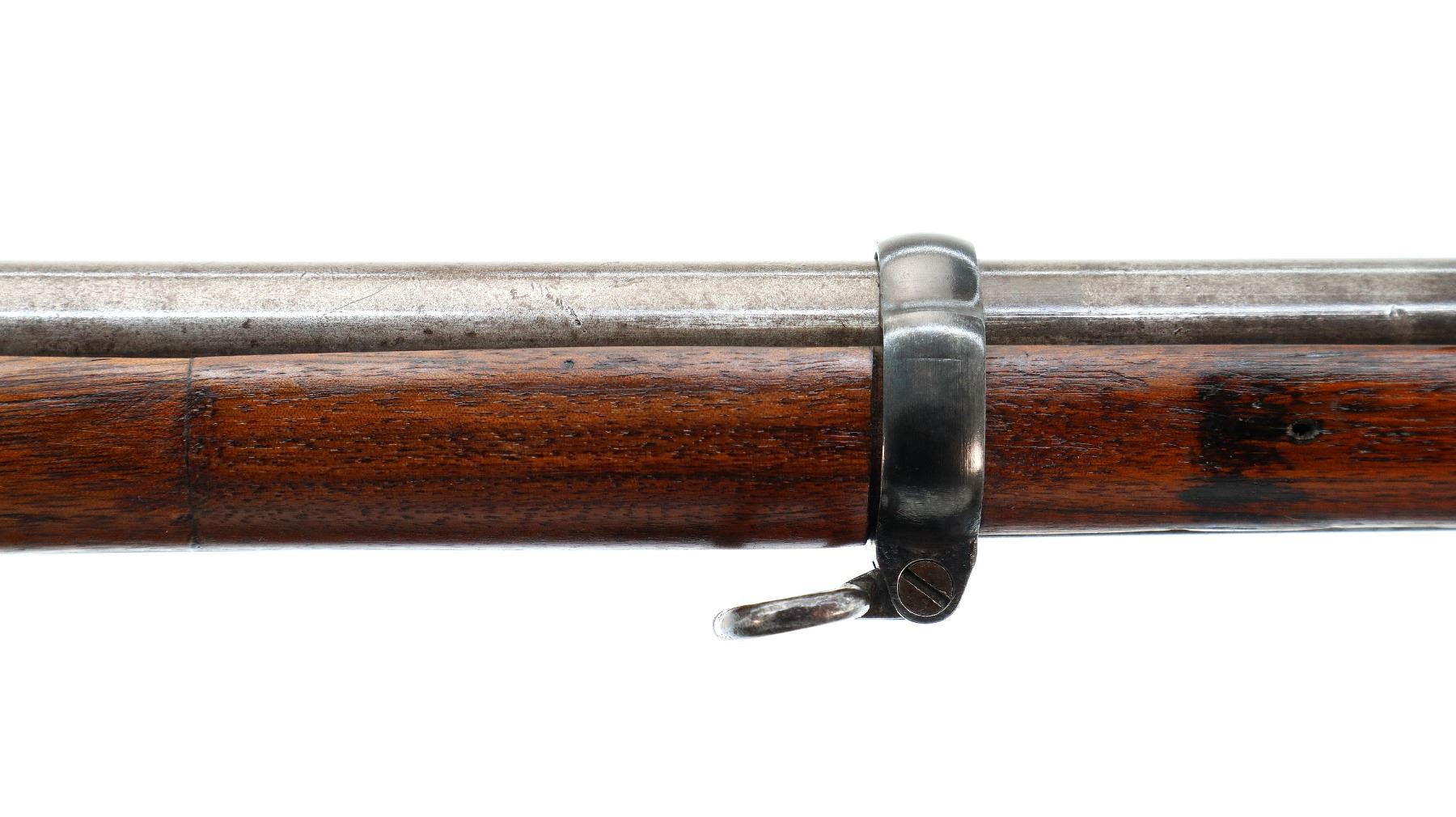 Main Description: Dated 1867, serial numbers mismatched. Blade front sight with ramp, adjustable u notched ladder rear sight, tapered round barrel, checkered spur hammer and opening lever, extractor is present. Two piece full military wood stocks, forearm is chipped and spliced together from two pieces, straight grip, smooth steel butt plate, brass stock disk and markings on left side, missing rear swivel hole is present, has the front swivel and cleaning rod.