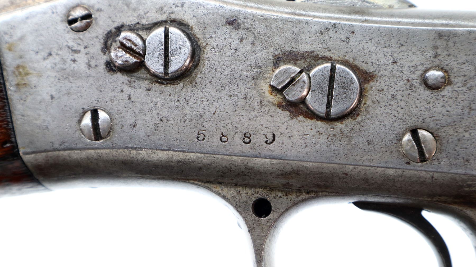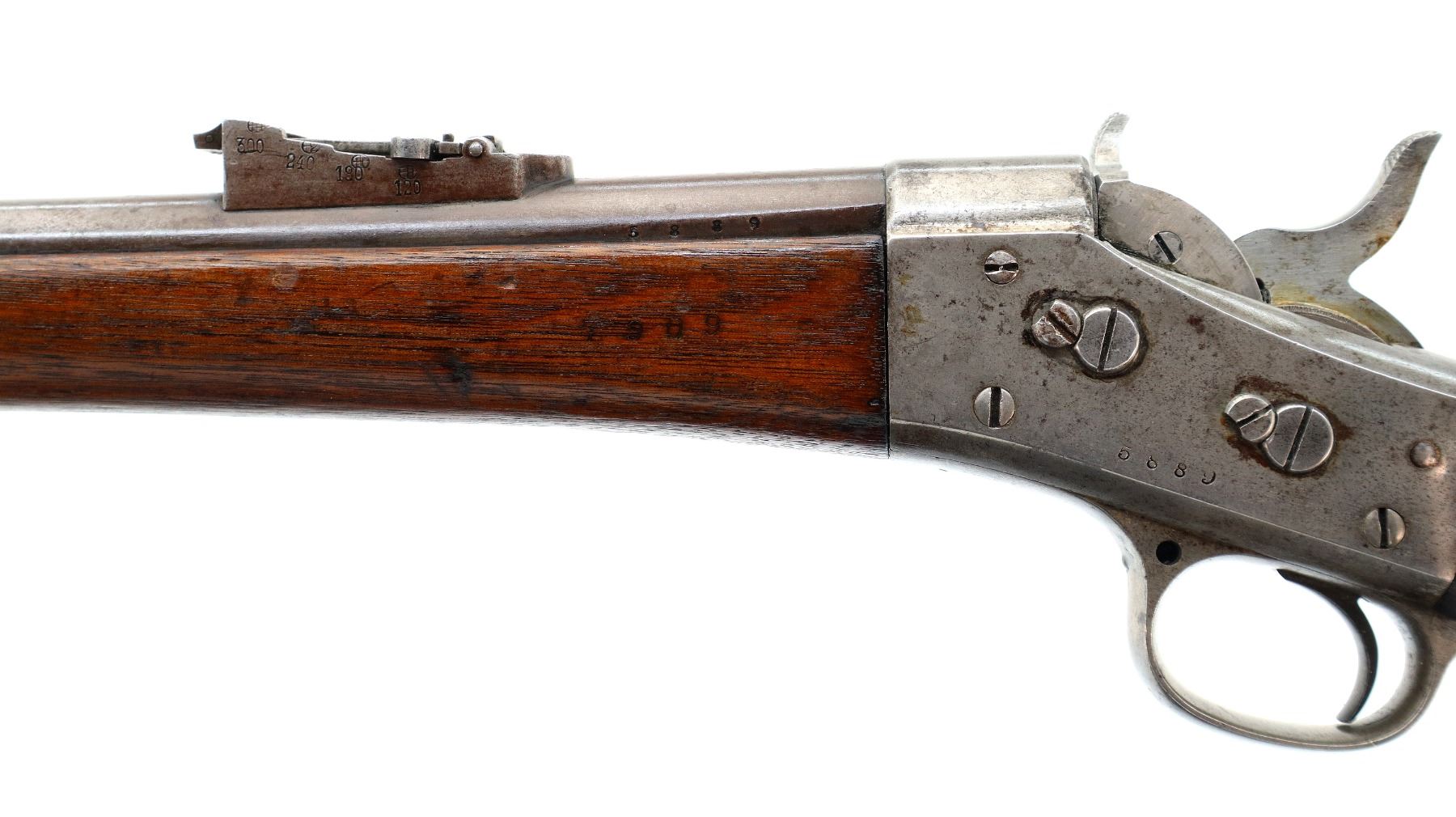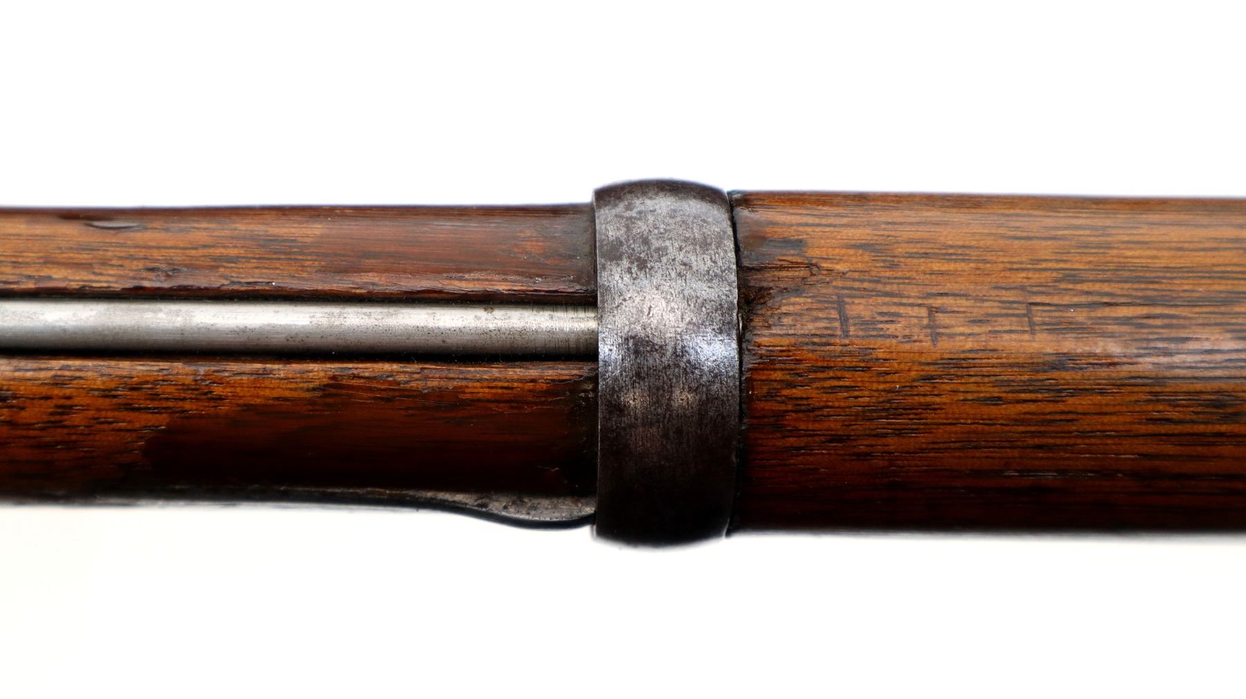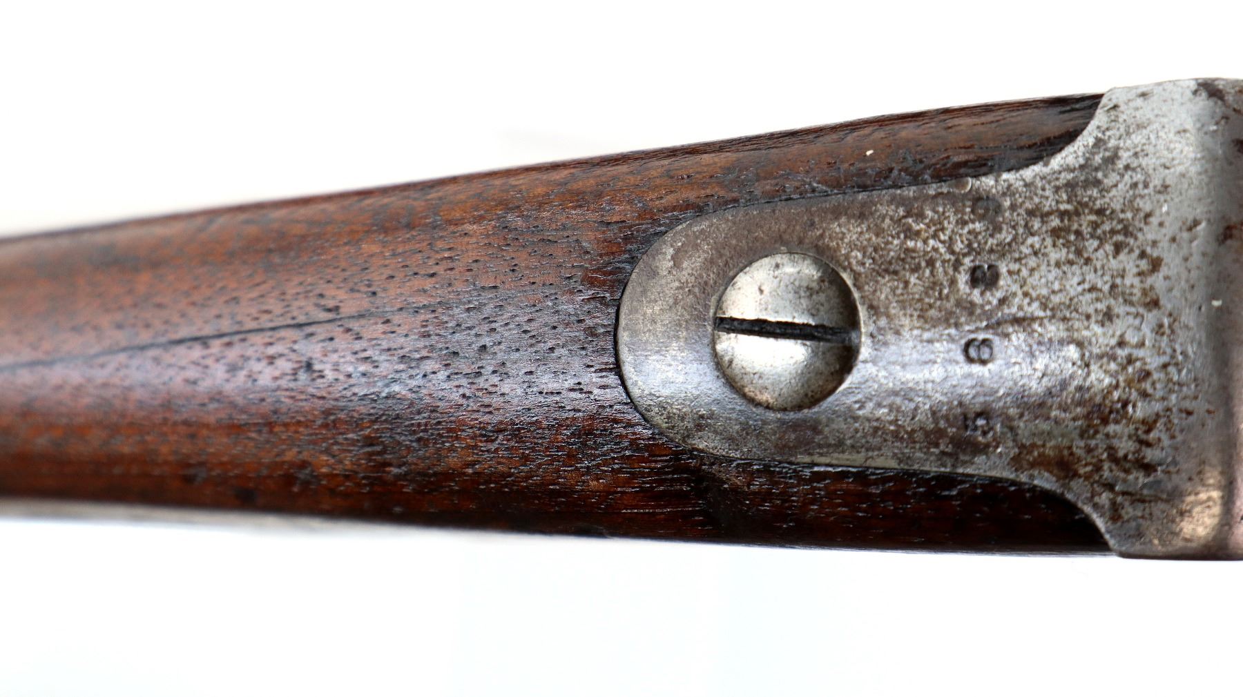 Main Description: Dated 1867, serial numbers mismatched. Blade front sight with ramp, adjustable u notched ladder rear sight, tapered round barrel, checkered spur hammer and opening lever, extractor is present. Two piece full military wood stocks, forearm is chipped and spliced together from two pieces, straight grip, smooth steel butt plate, brass stock disk and markings on left side, missing rear swivel hole is present, has the front swivel and cleaning rod.