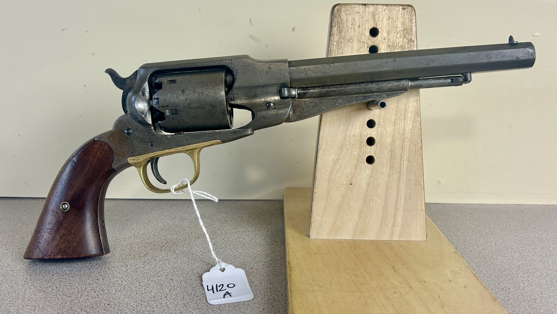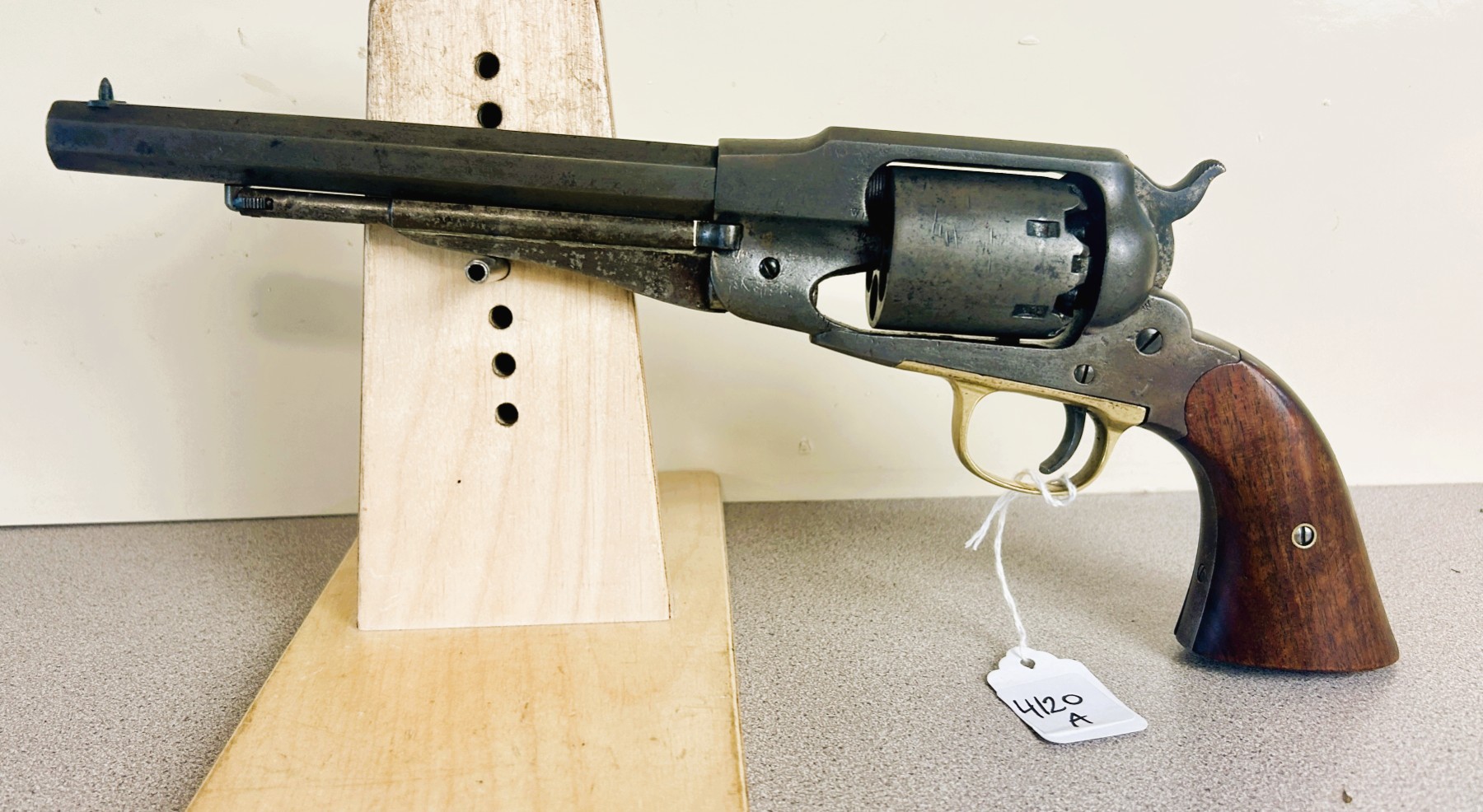 CONDITION: G-VG OVERALL FOR AGE. PATINA THROUGHOUT. BORE IS G, CLEAN WITH GOOD RIFLING. INDEXES & LOCKS UP WELL. SPECS: .44 CAL CAP & BALL SINGLE ACTION REVOLVER. 8 IN BARREL. INSPECTOR MARKS THROUGHOUT INCLUDING W, C, L & A. CANADIAN ANTIQUE CLASS, NO PAL REQUIRED. EXTRAS: NONE. SERIAL: ON BARREL 65709 & ON GRIP 64348.
