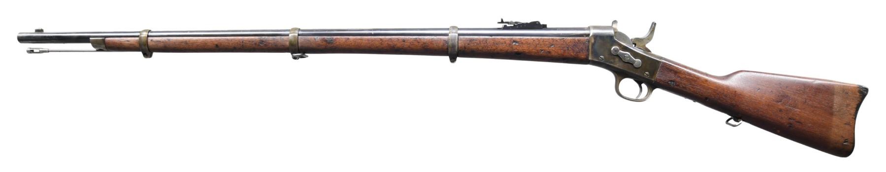 RIFLE. Cal. 43 Spanish. S# 1536. Bbl. 35 1/4". Ladder rear sight graduated to 1,000 meters. Stud type front sight. Receiver has three line Remington address on the tang. Serial number on the right side. Bbl. is marked on the left side above the wood line "B". No bayonet lug is fitted. Ramrod is present. Unmarked walnut stock set. Bottom swivels. Forend is retained by three clamping bands. Flat base breech block. Rotary extractor. CONDITION: stock set has moderate wear, scratches & handling marks throughout, having been lightly refinished. Area of buttstock around buttplate has notably thin finish, likely due to environmental issues and improper storage. Action retains a good deal of its original color case-hardened finish. Hammer & breech block were bright returning to patina. Pins have been polished & show small dents. Bbl. shows 70% of its original blue w/ wear, scattered fine pitting & small scratches. Near excellent bright shiny bore w/ sharp lands. (01-27392/RW). ANTIQUE. $300-500.