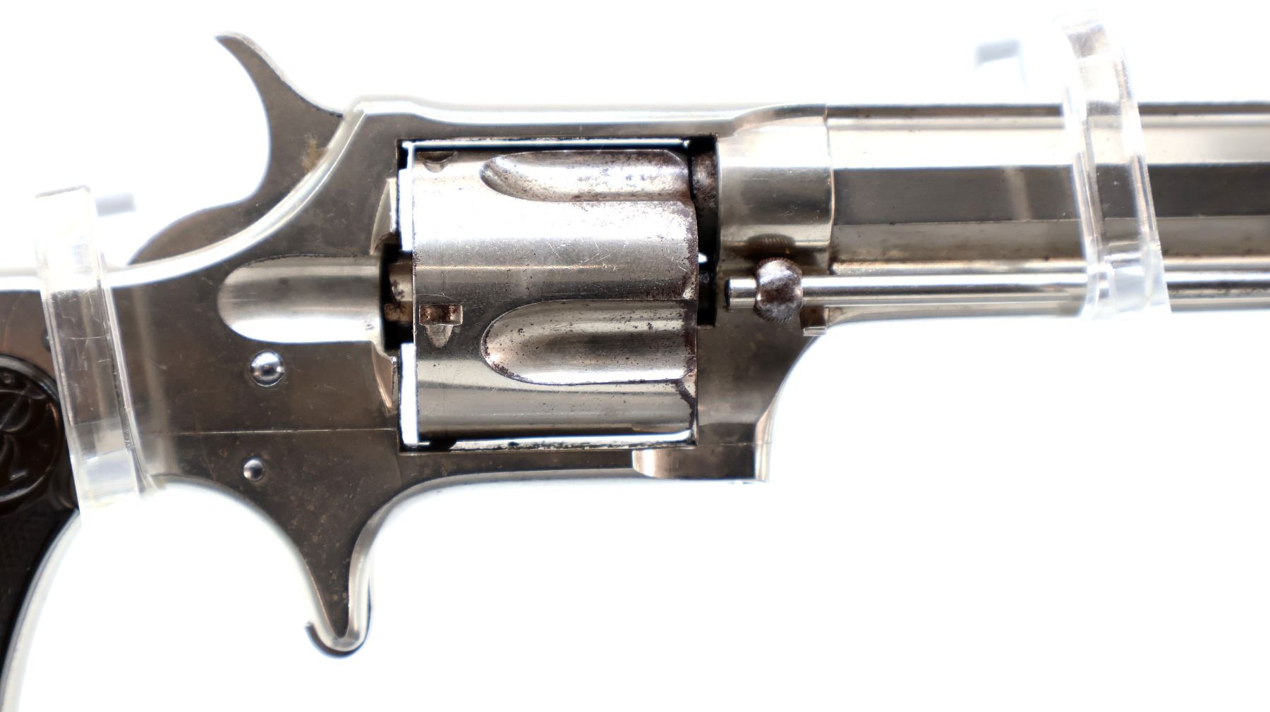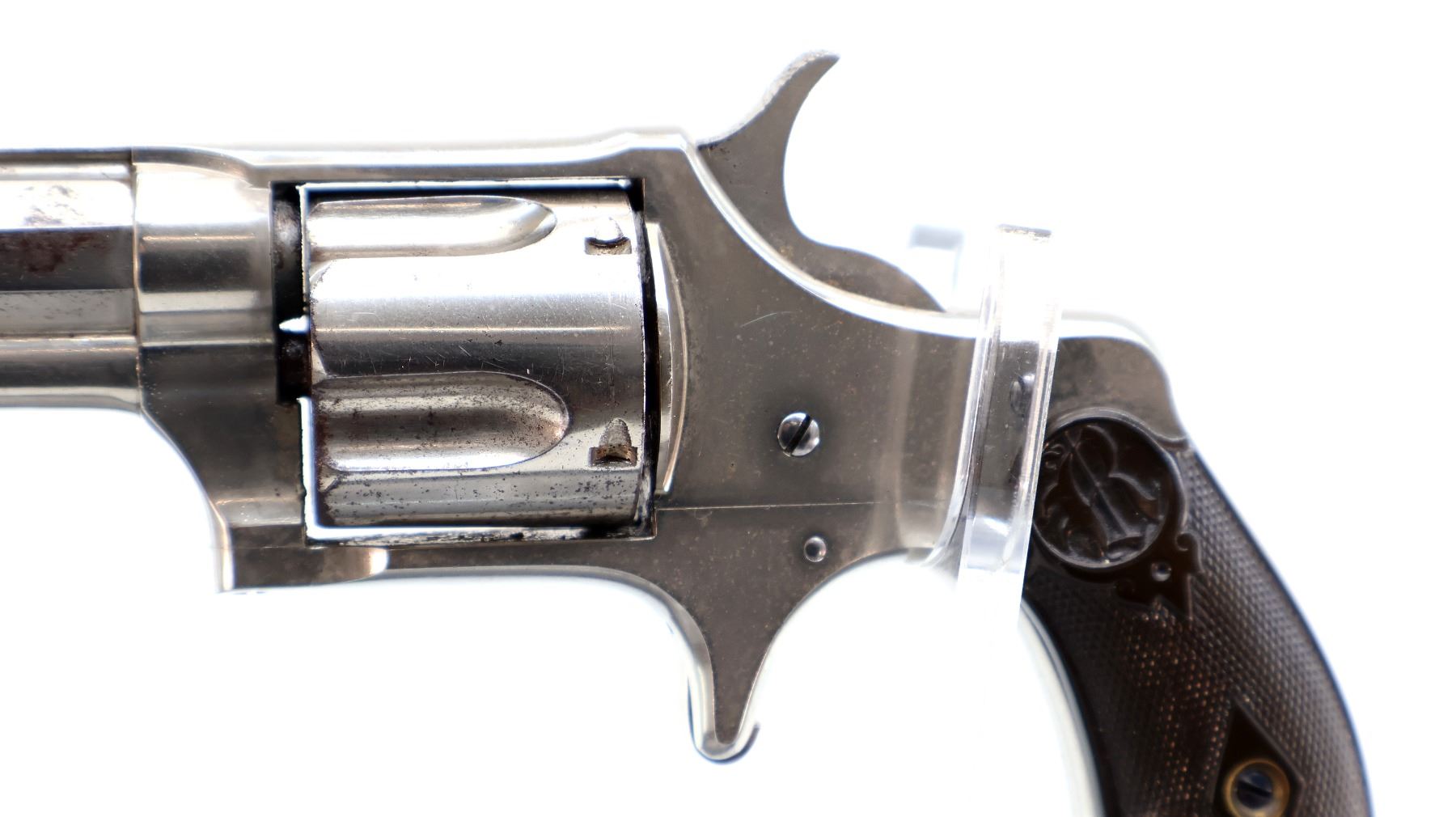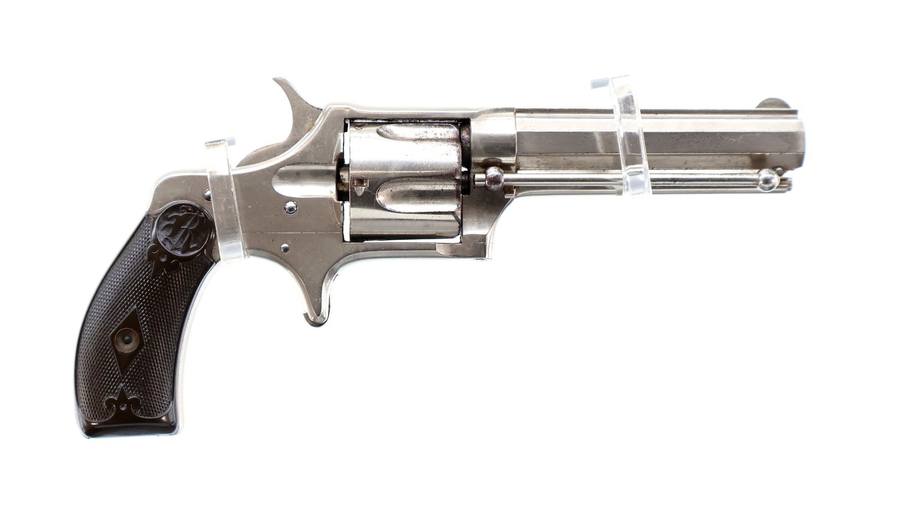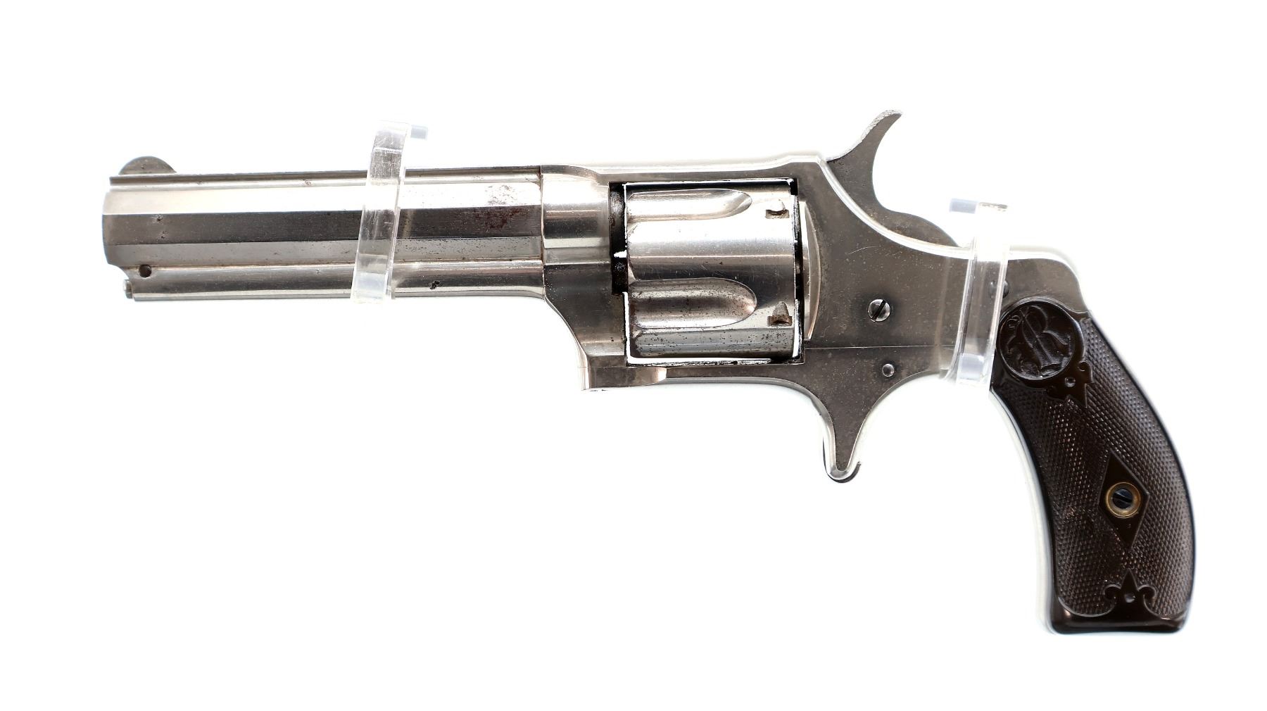 Main Description: Functions mechanically as designed. Blade front sight, fixed u notched rear sight, Nickel finish, octagon barrel with raised rib, fluted cylinder, loading groove on right side of frame, checkered spur hammer and smooth trigger. Two piece checkered brown polymer grips, ejector rod on right side of barrel