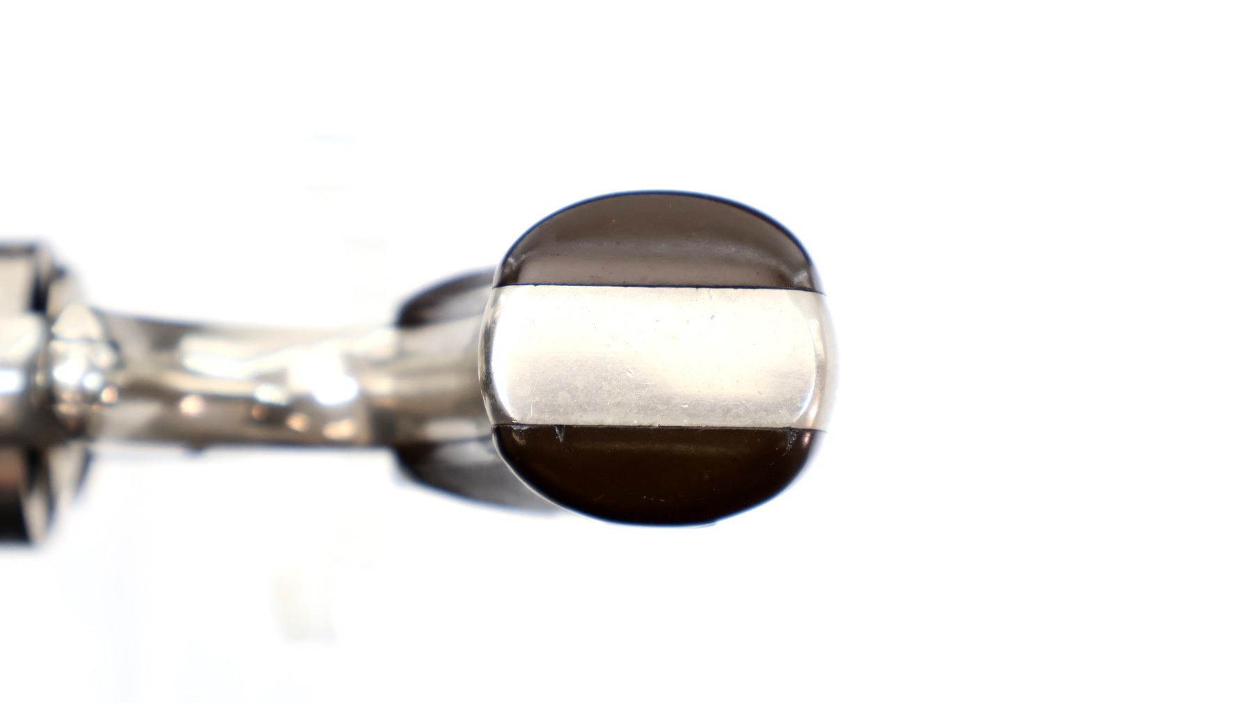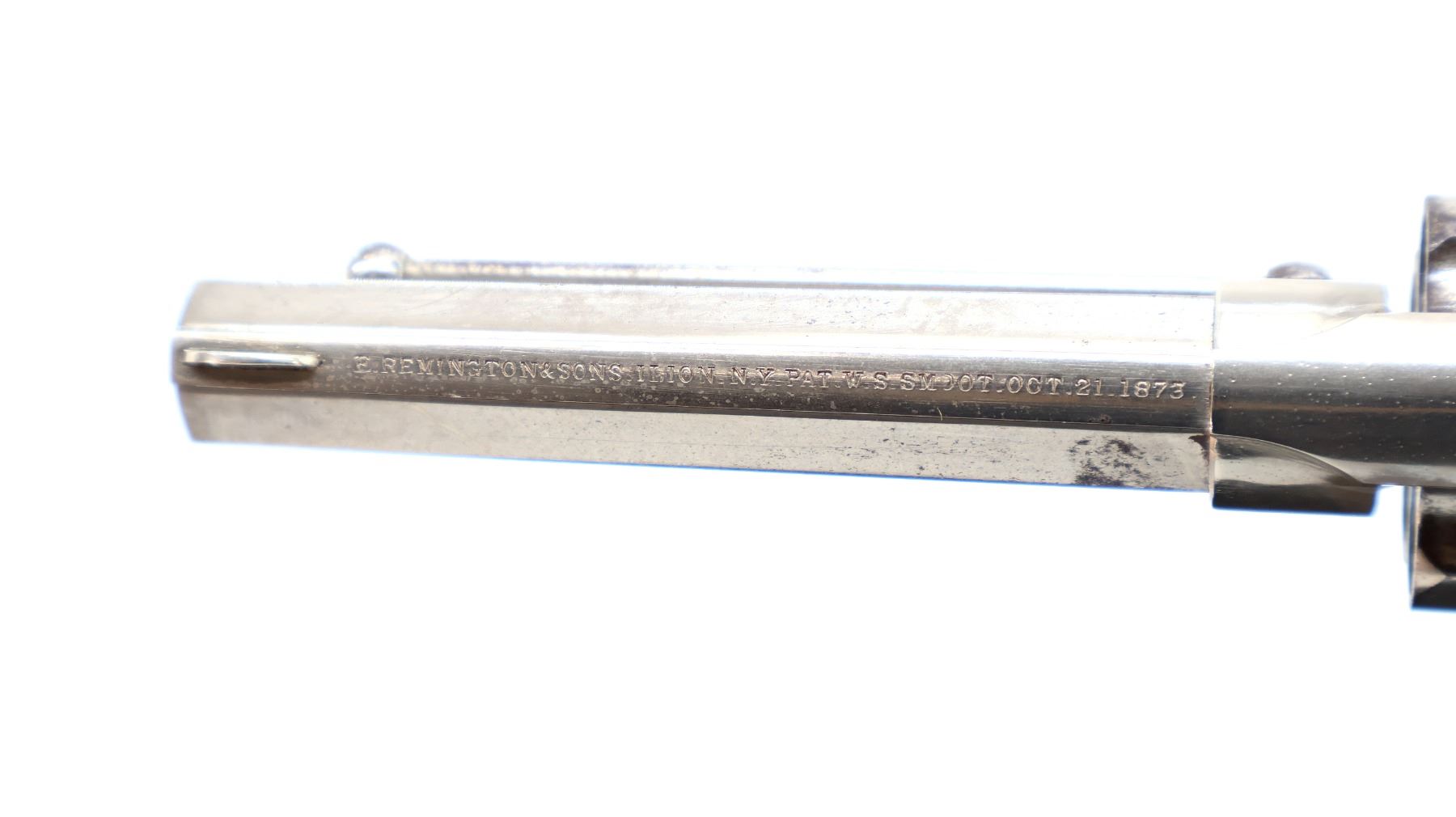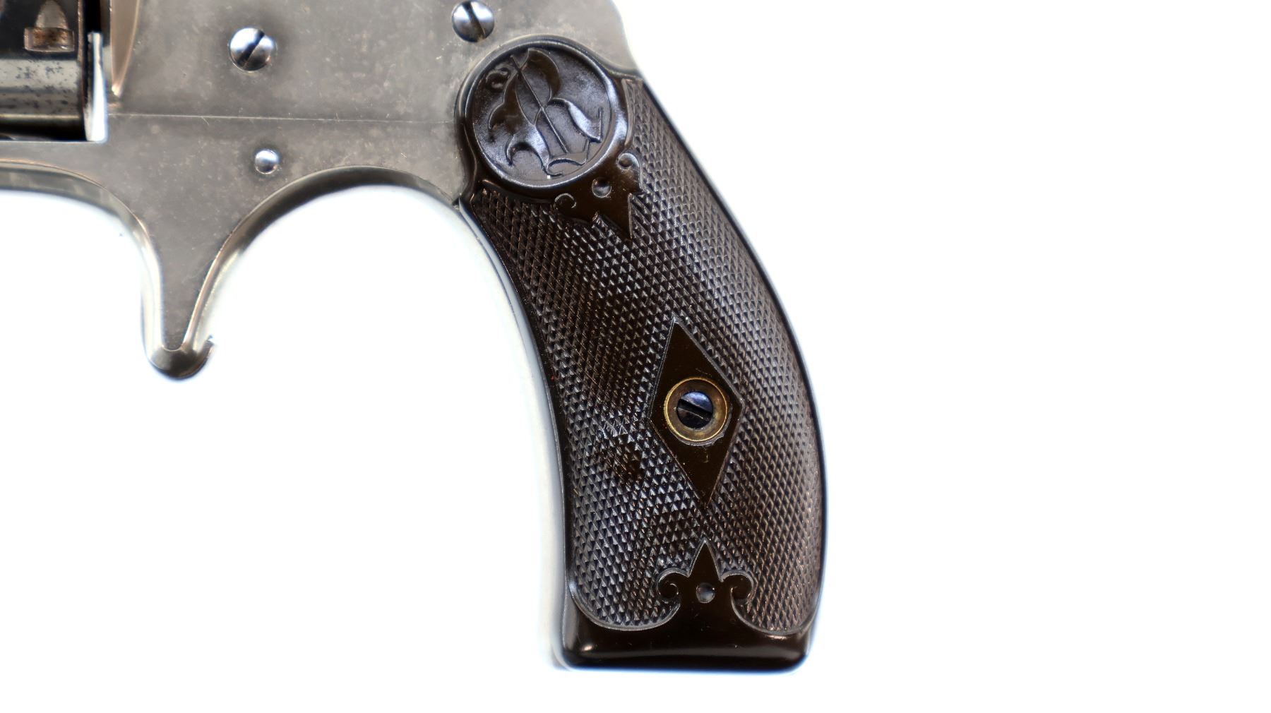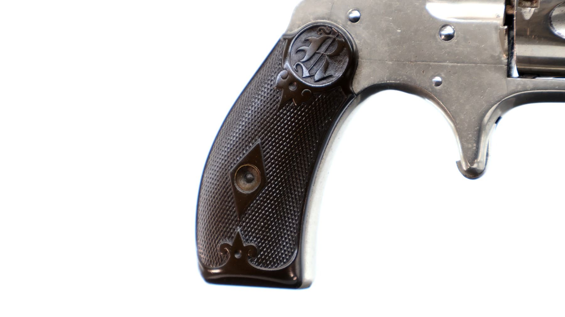 Main Description: Functions mechanically as designed. Blade front sight, fixed u notched rear sight, Nickel finish, octagon barrel with raised rib, fluted cylinder, loading groove on right side of frame, checkered spur hammer and smooth trigger. Two piece checkered brown polymer grips, ejector rod on right side of barrel