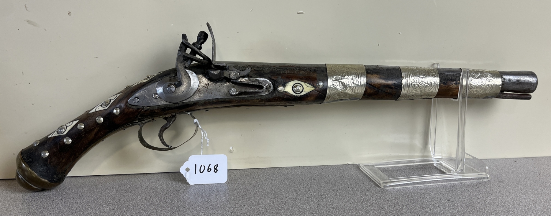 CONDITION: F OVERALL. HOMEMADE REPLICA, NOT A FUNCTIONING FIREARM. SPECS: HAMMER COCKS, HAMMER AND TRIGGER WORKS, FRIZZEN NON-FUNCTIONAL, LOCK APPEARS TO BE HOMEMADE, NO TOUCH HOLE. EXTRAS: NONE. S/N: NONE