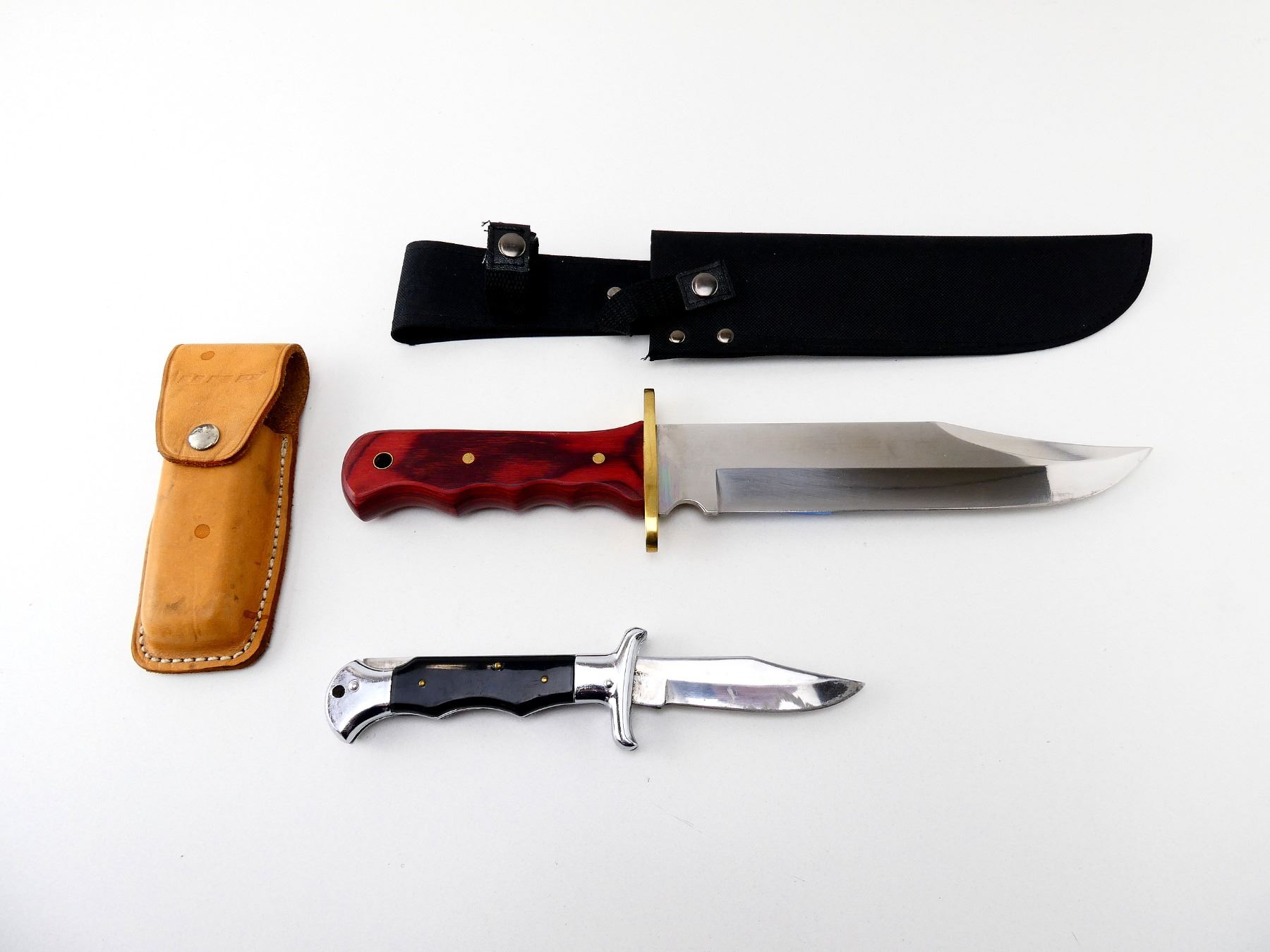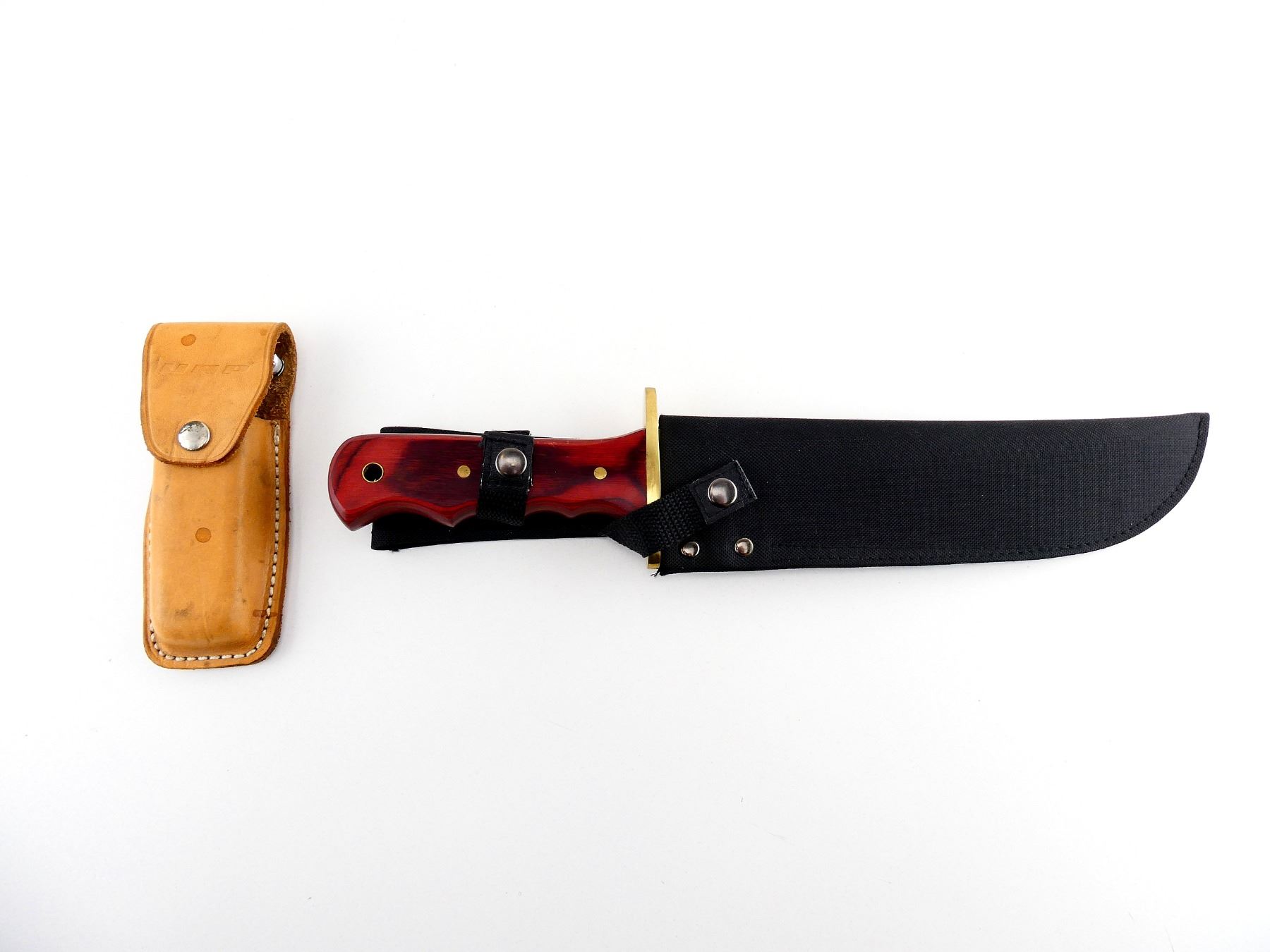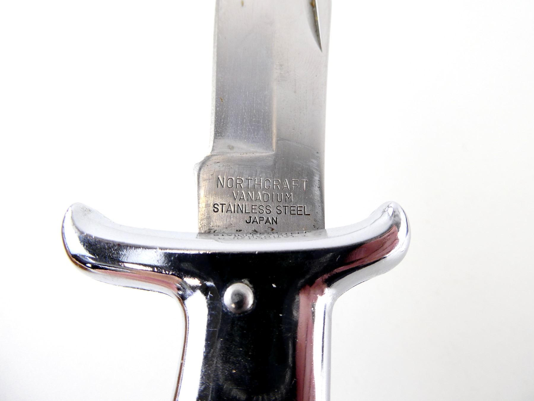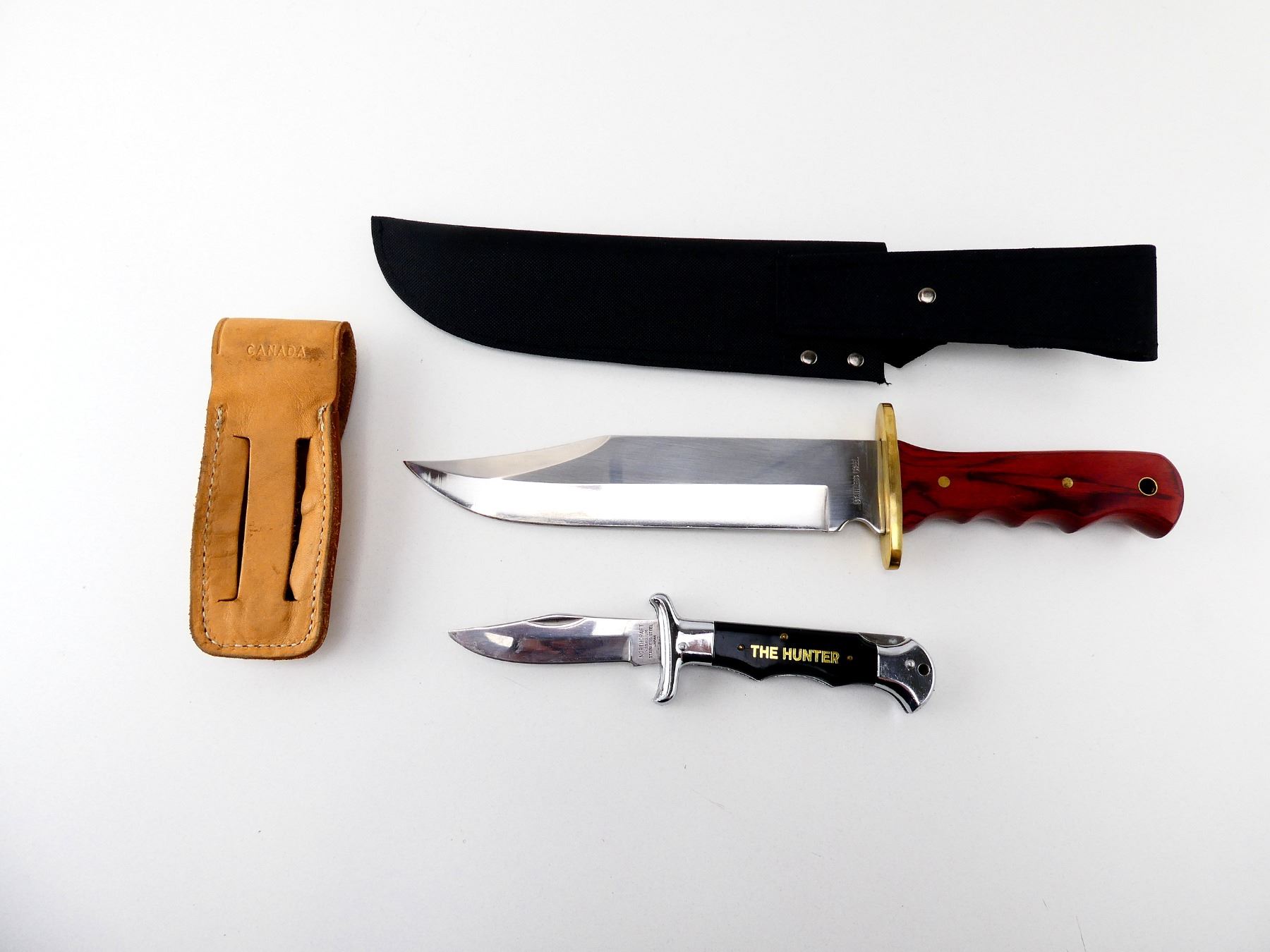 LOT INCLUDES; (1) REPRODUCTION BOWIE KNIFE, STAINLESS STEEL BLADE, MARKED "STAINLESS STEEL", MICARTA HANDLE, UNMARKED, SHOWS WEAR & TEAR / USE MARKS, BLADE OVERALL LENGTH APPROX. 8 5/8", OVERALL LENGTH APPROX. 14", WITH SYNTHETIC SHEATH & (1) NORTHCRAFT "THE HUNTER" FOLDING KNIFE, STAINLESS STEEL BLADE, MARKED "NORTHCRAFT", "VANADIUM", ETC., EPOXY HANDLE, MARKED "THE HUNTER", SHOWS WEAR & TEAR / USE MARKS, BLADE OVERALL LENGTH APPROX. 3 5/8", OVERALL LENGTH APPROX. 8.5", WITH BROWN LEATHER SHEATH, MARKED "UAP". SEE PHOTOS.