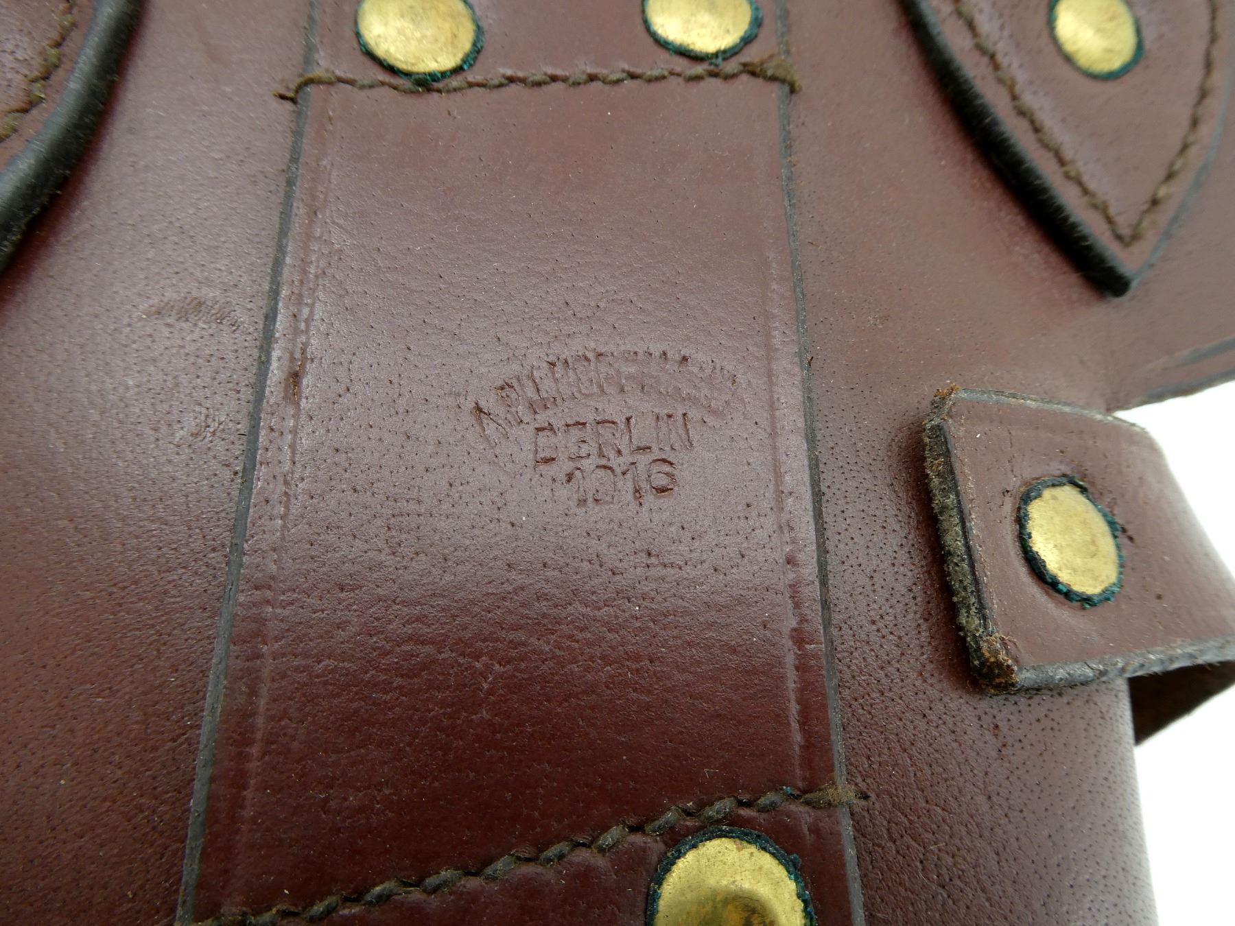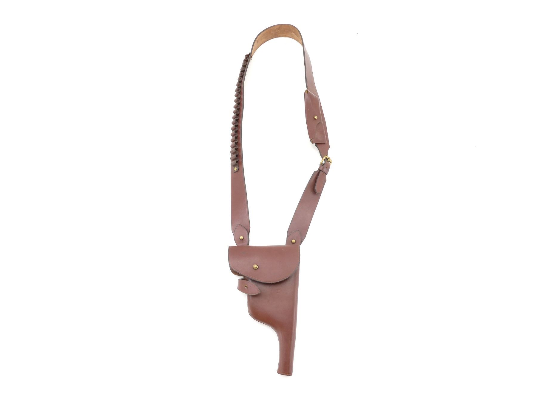 (1) BROWN LEATHER RIGHT HAND HOLSTER WITH BROWN LEATHER BANDOLIER ATTACHED, BRASS FITTINGS, FITS 7.63 MAUSER / 9MM LUGER CALIBERS, HOLDS 20 RNDS, MARKED: "BERLIN, 1916", ETC. SEE PHOTOS.