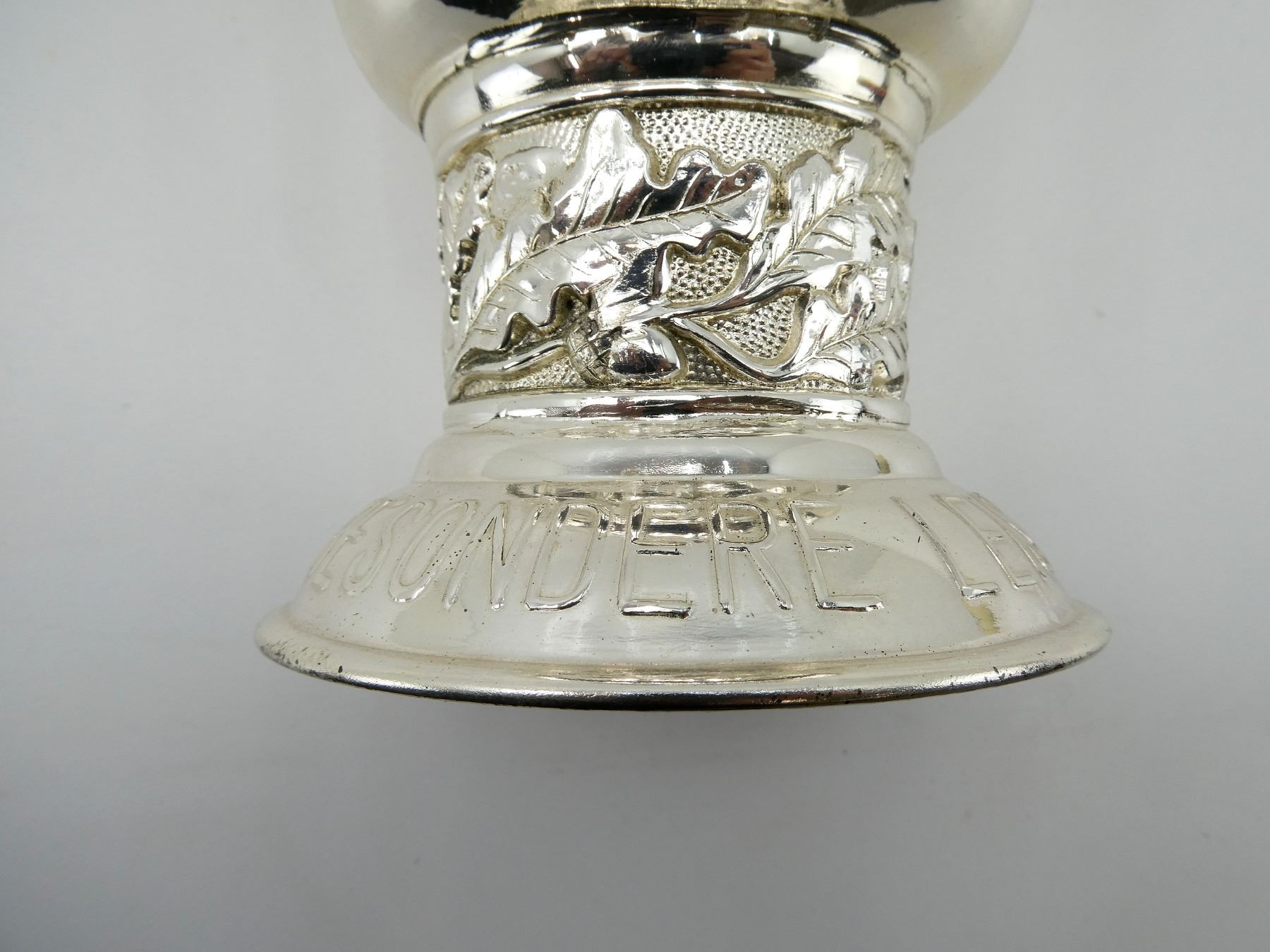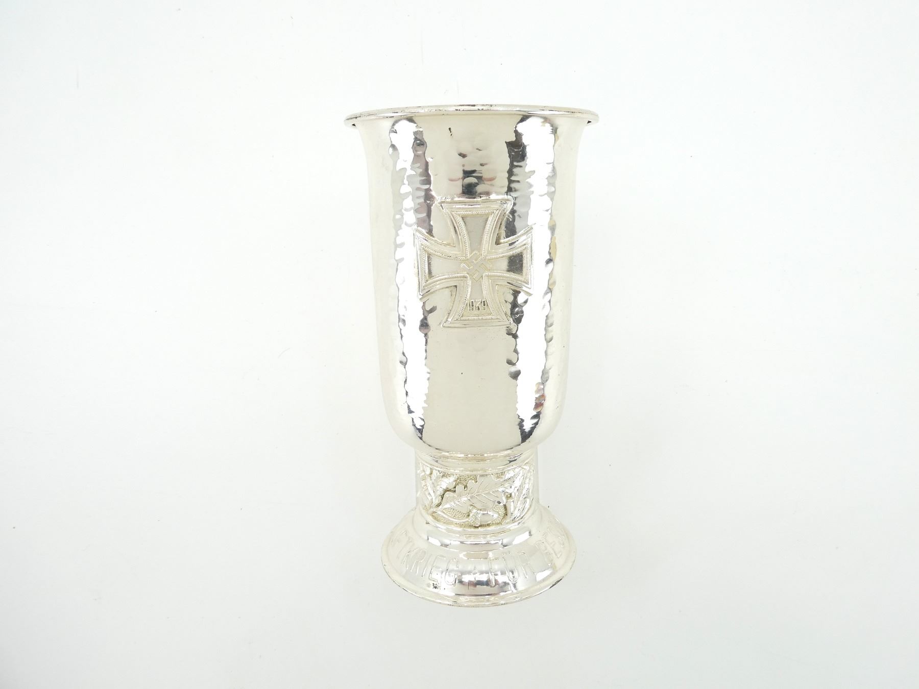 (1) REPRODUCTION LUFTWAFFE HONOUR GOBLET, POLISHED NON-MAGNETIC METAL GOBLET, TWO EAGLES FIGHTING EACH OTHER MOTIF AFFIXED TO GOBLET, IRON CROSS AFFIXED TO GOBLET, ACORN / OAK LEAVES DESIGN AROUND BOTTOM WITH PEBBLING IN BACKGROUND, MARKED: "FUR BESONDERE LEISTUNG IM LUFTKRIEG", TOP APPROX. 4" DIA., BOTTOM APPROX. 3 5/8" DIA. & OVERALL LENGTH APPROX. 7 5/8". SEE PHOTOS.