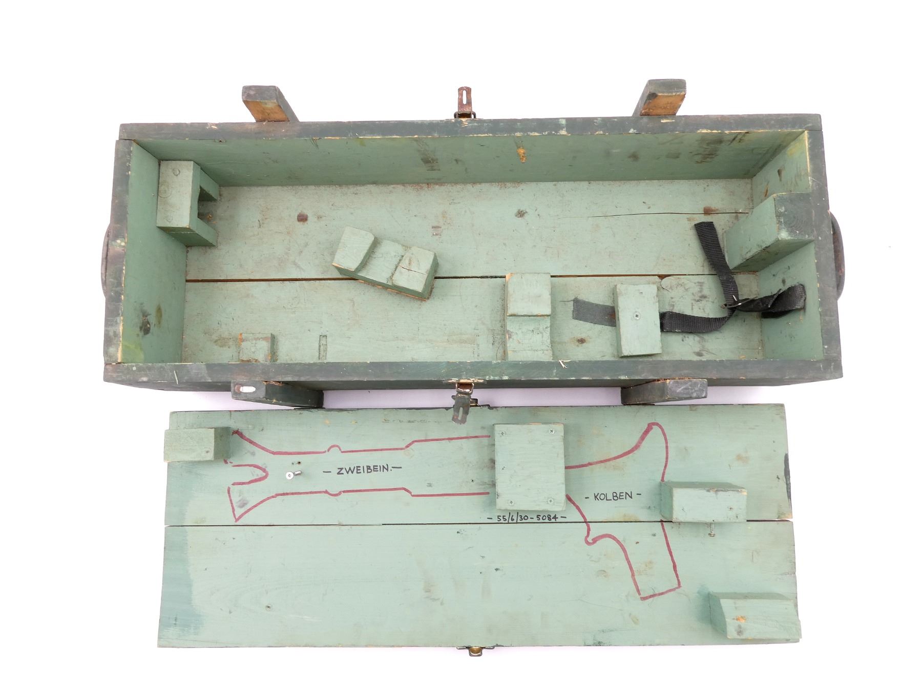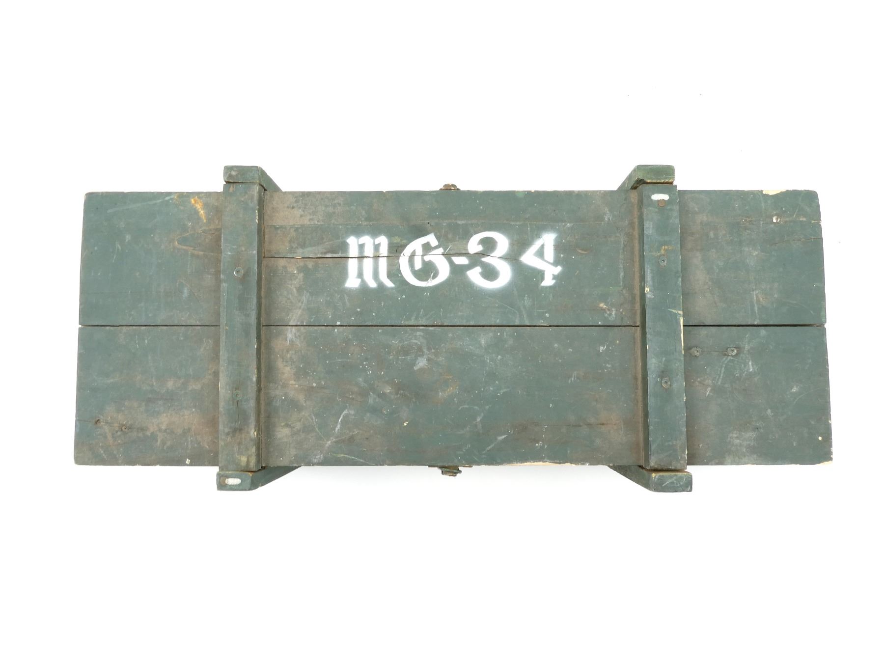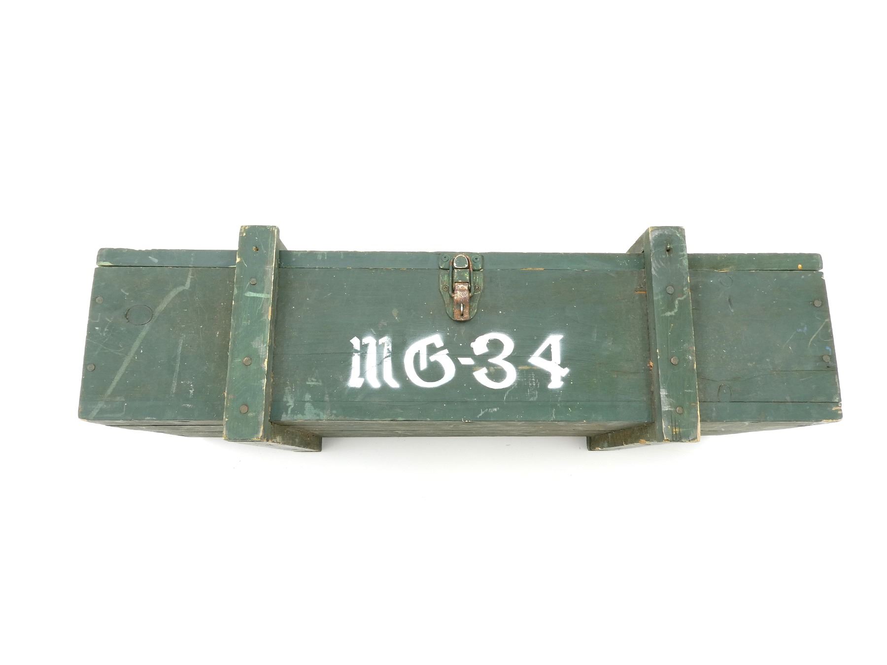 (1) GREEN PAINTED WOODEN TRANSIT CASE, MARKED: "MG-34" & VARIOUS HAND-WRITTEN MARKING INSIDE, DOUBLE LATCH CLOSURE OF LID, METAL CARRY HANDLES ON THE SIDES, STRAP WITH METAL BUCKLE INSIDE, VARIOUS WOODEN BLOCKS INSIDE & APPROX. 32.5" X 12.50" X 8.75". SEE PHOTOS.