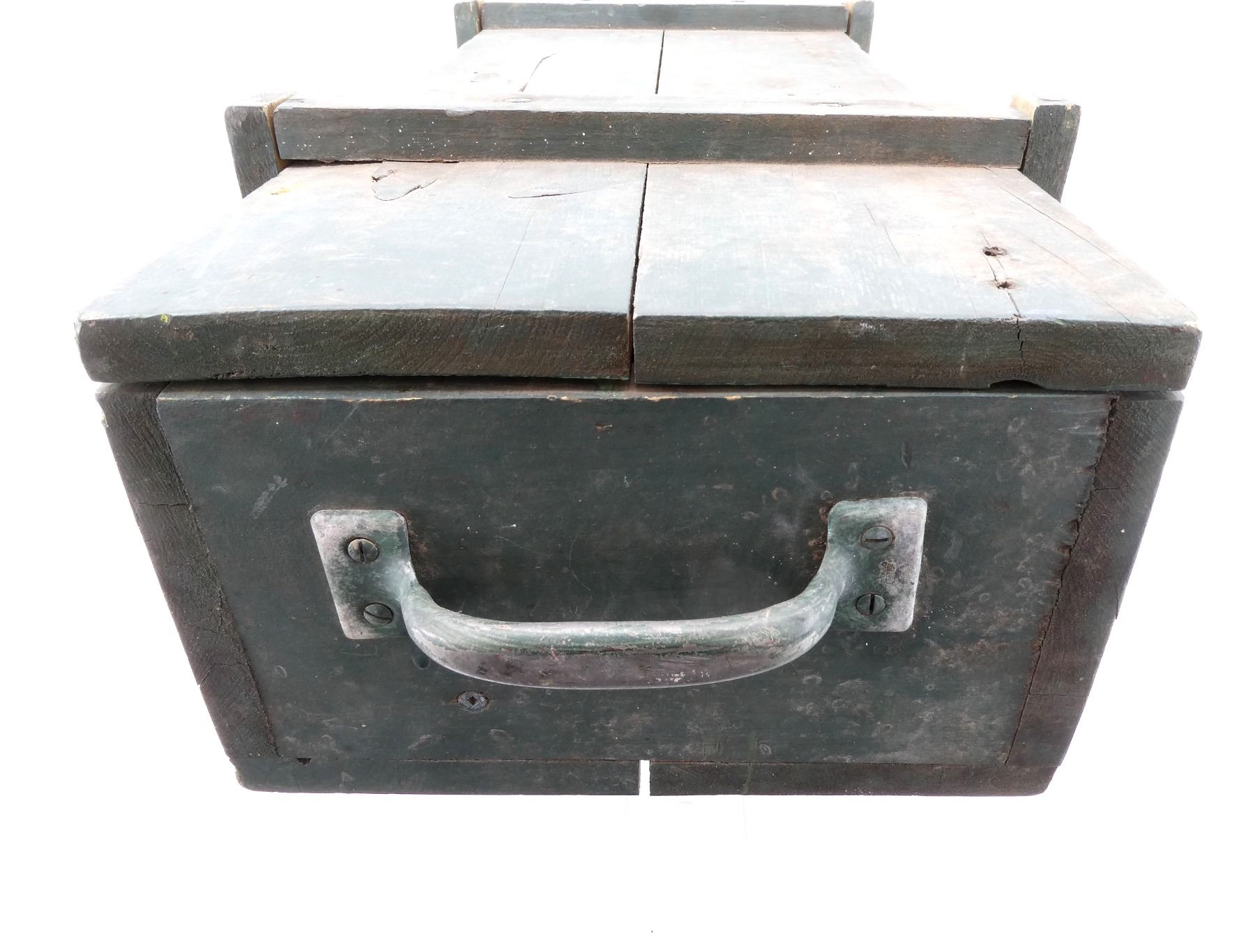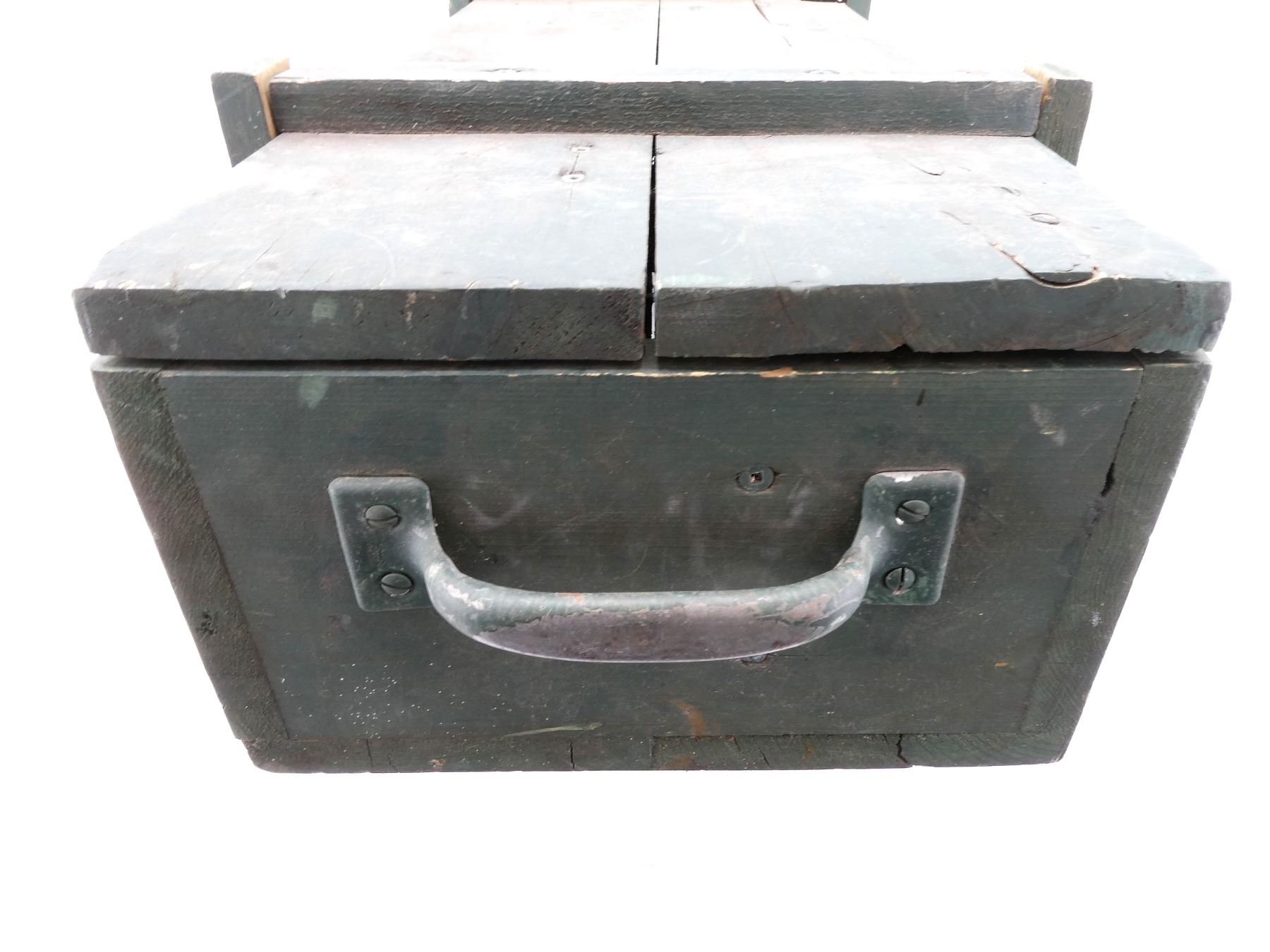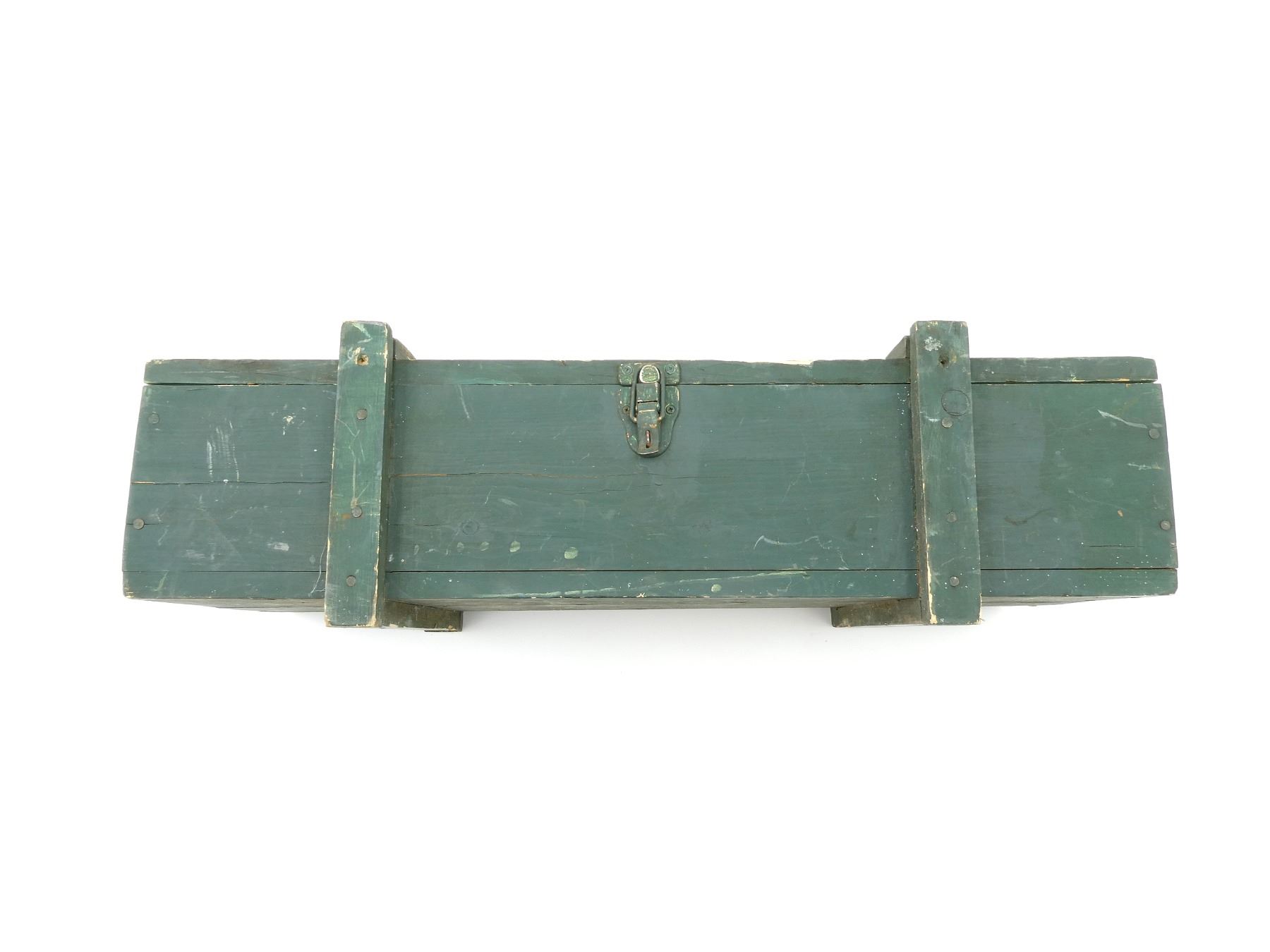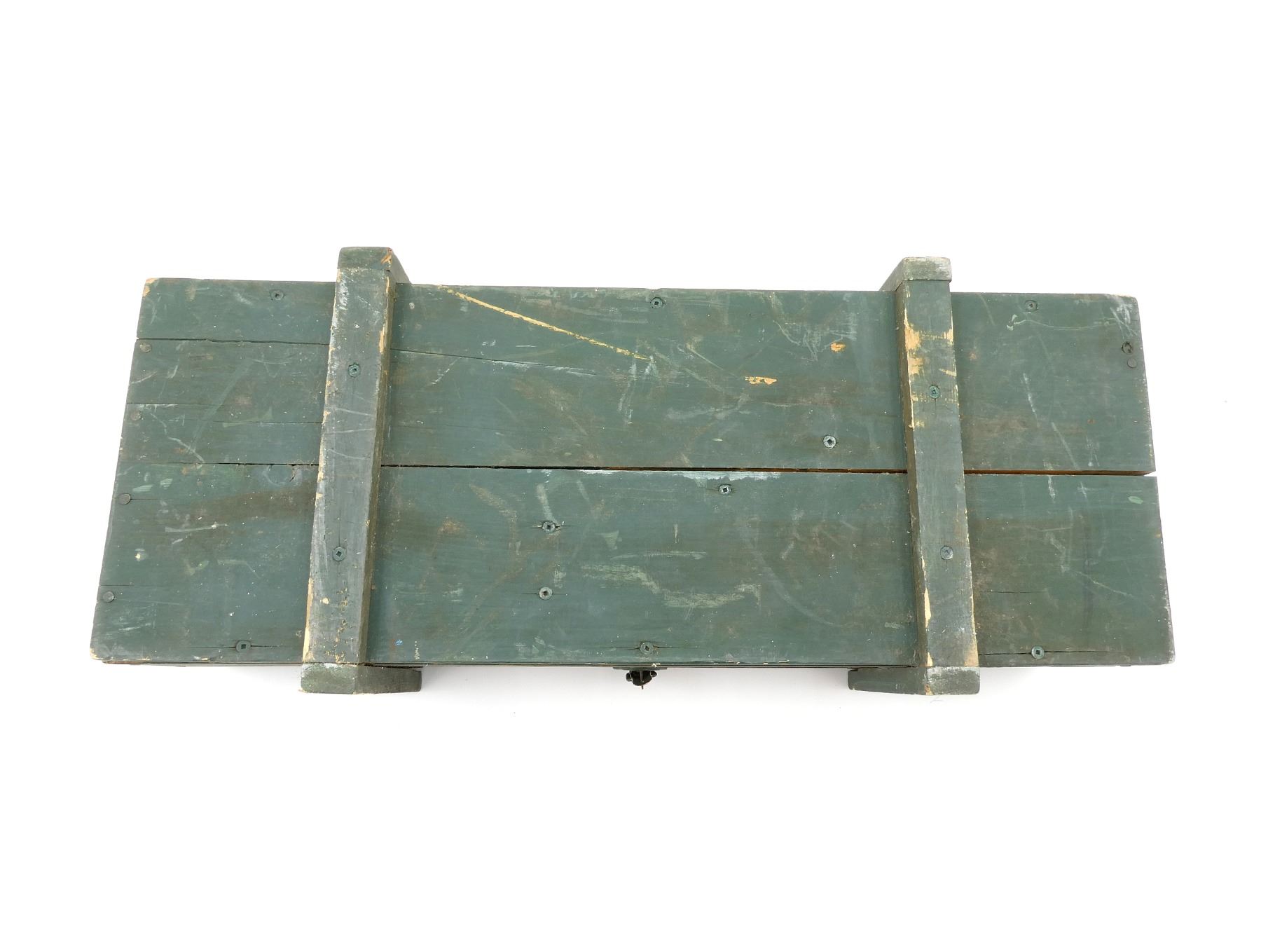 (1) GREEN PAINTED WOODEN TRANSIT CASE, MARKED: "MG-34" & VARIOUS HAND-WRITTEN MARKING INSIDE, DOUBLE LATCH CLOSURE OF LID, METAL CARRY HANDLES ON THE SIDES, STRAP WITH METAL BUCKLE INSIDE, VARIOUS WOODEN BLOCKS INSIDE & APPROX. 32.5" X 12.50" X 8.75". SEE PHOTOS.