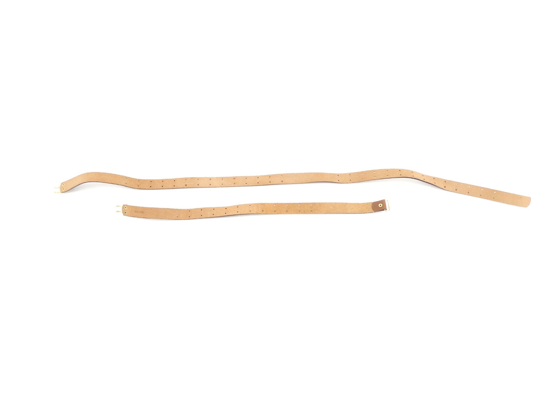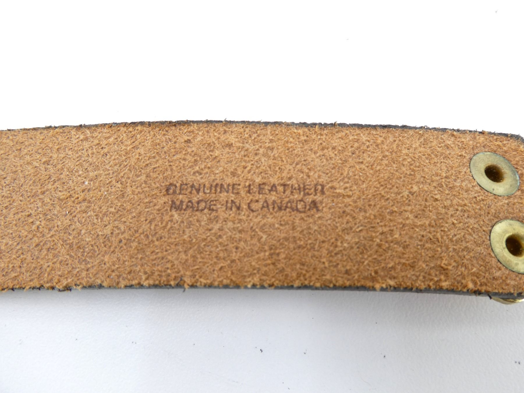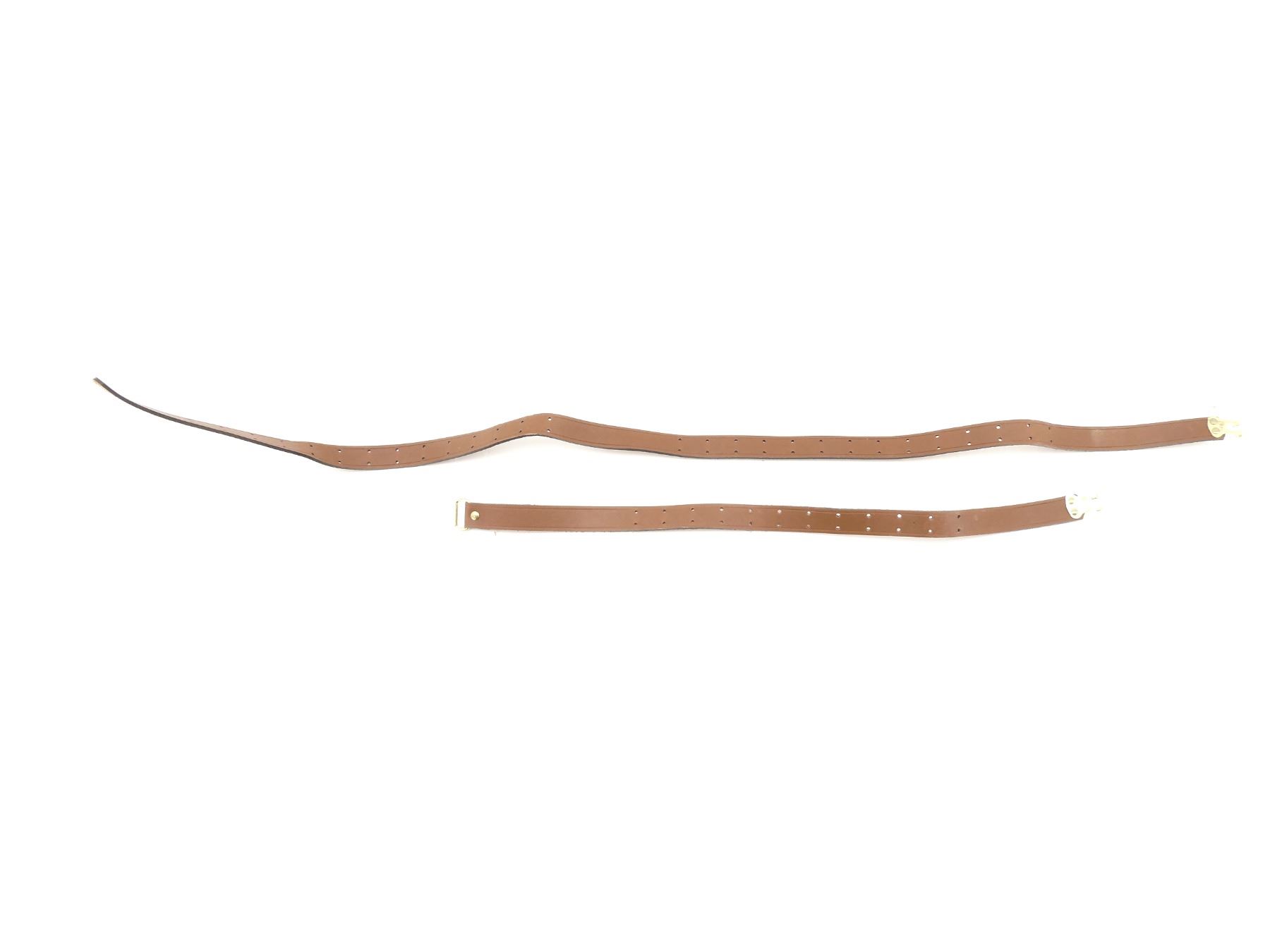 (1) REPRODUCTION 1907 RIFLE SLING, FITS 1903 SPRINGFIELD & M1 GARAND RIFLES, BROWN LEATHER SLING WITH METAL FITTINGS / HOOKS, MARKED: "GENUINE LEATHER, MADE IN CANDA", OVERALL LENGTH APPROX. 70", ADJUSTABLE. SEE PHOTOS.
