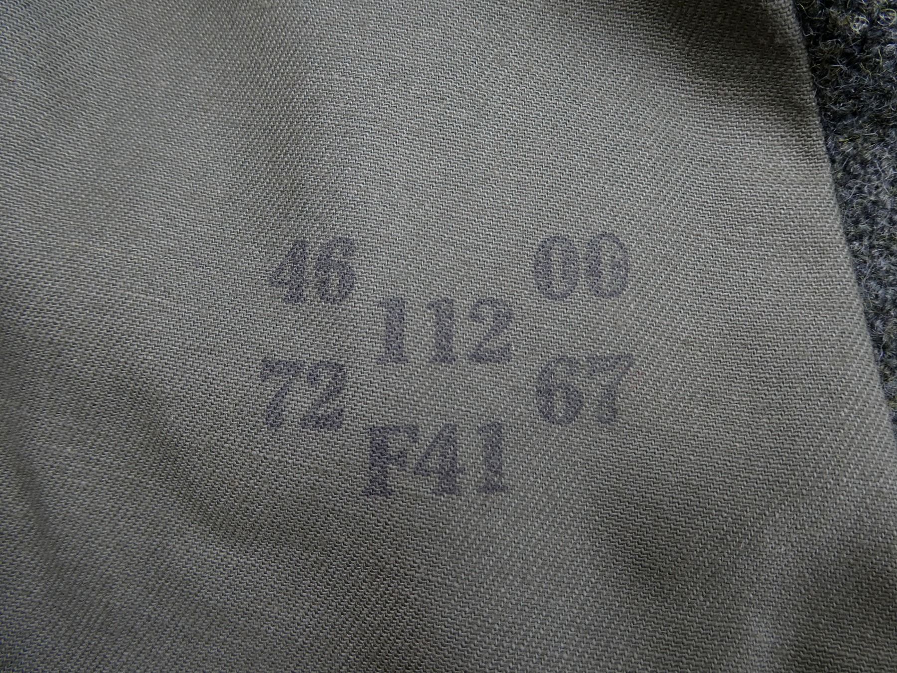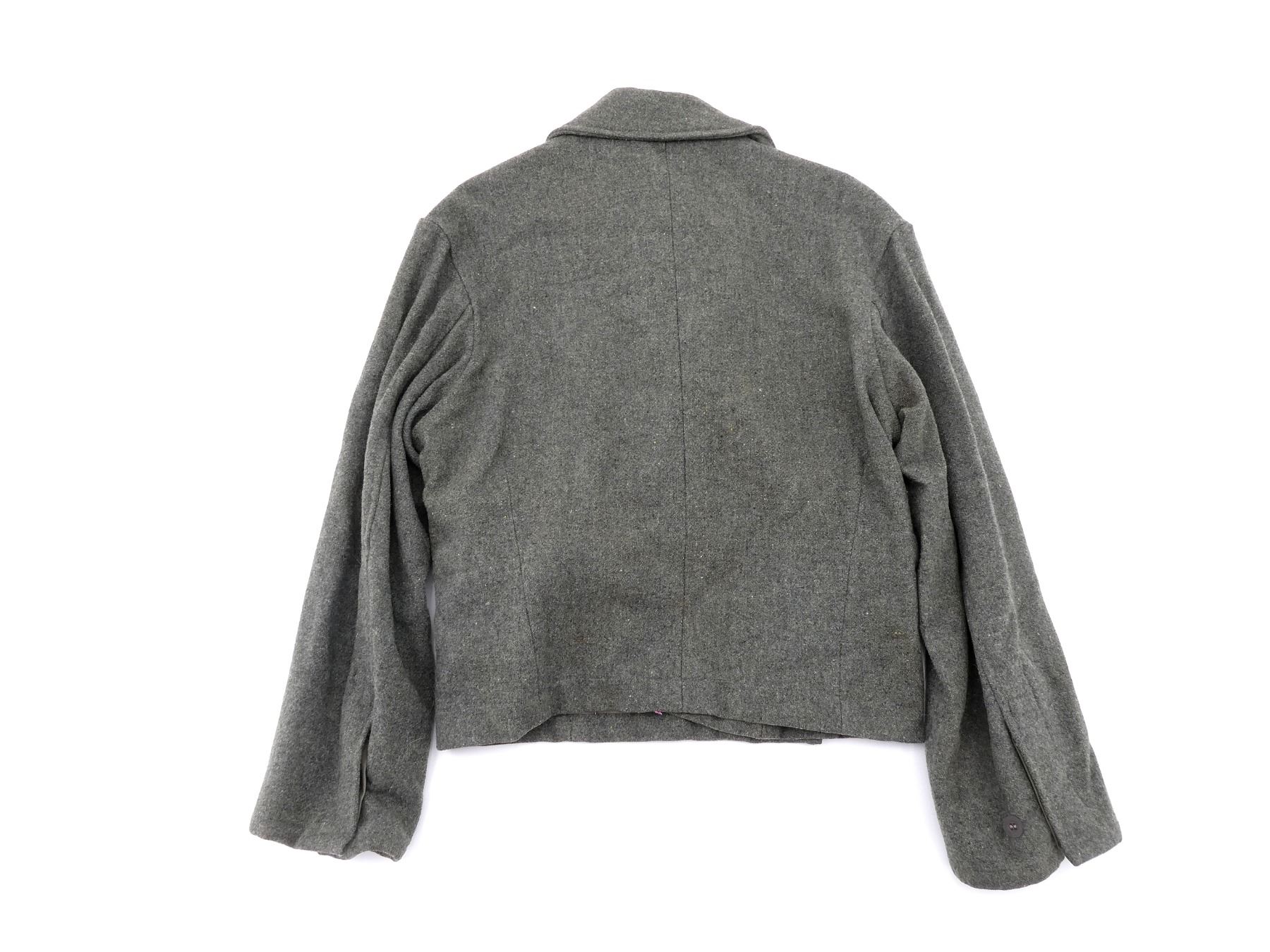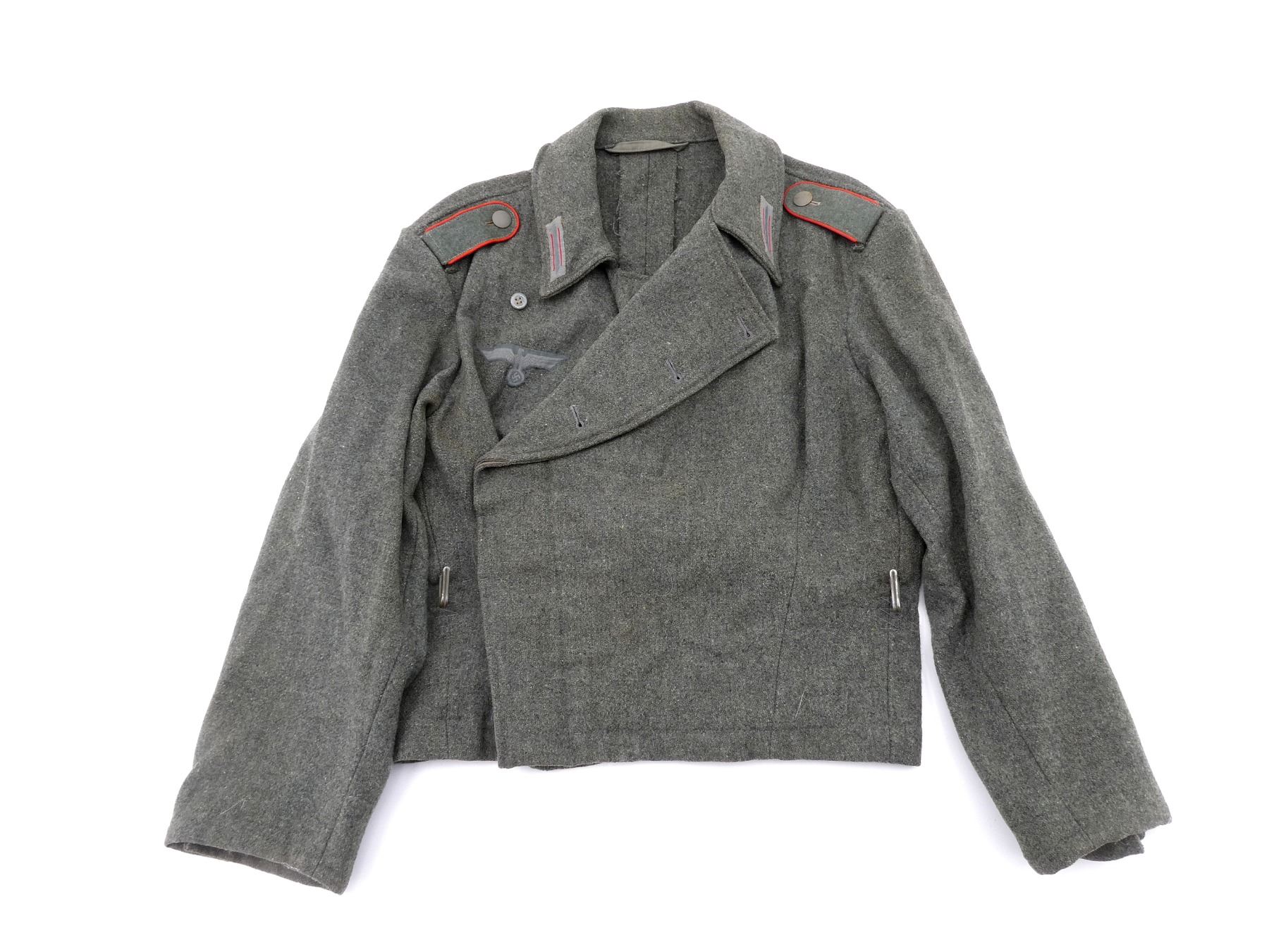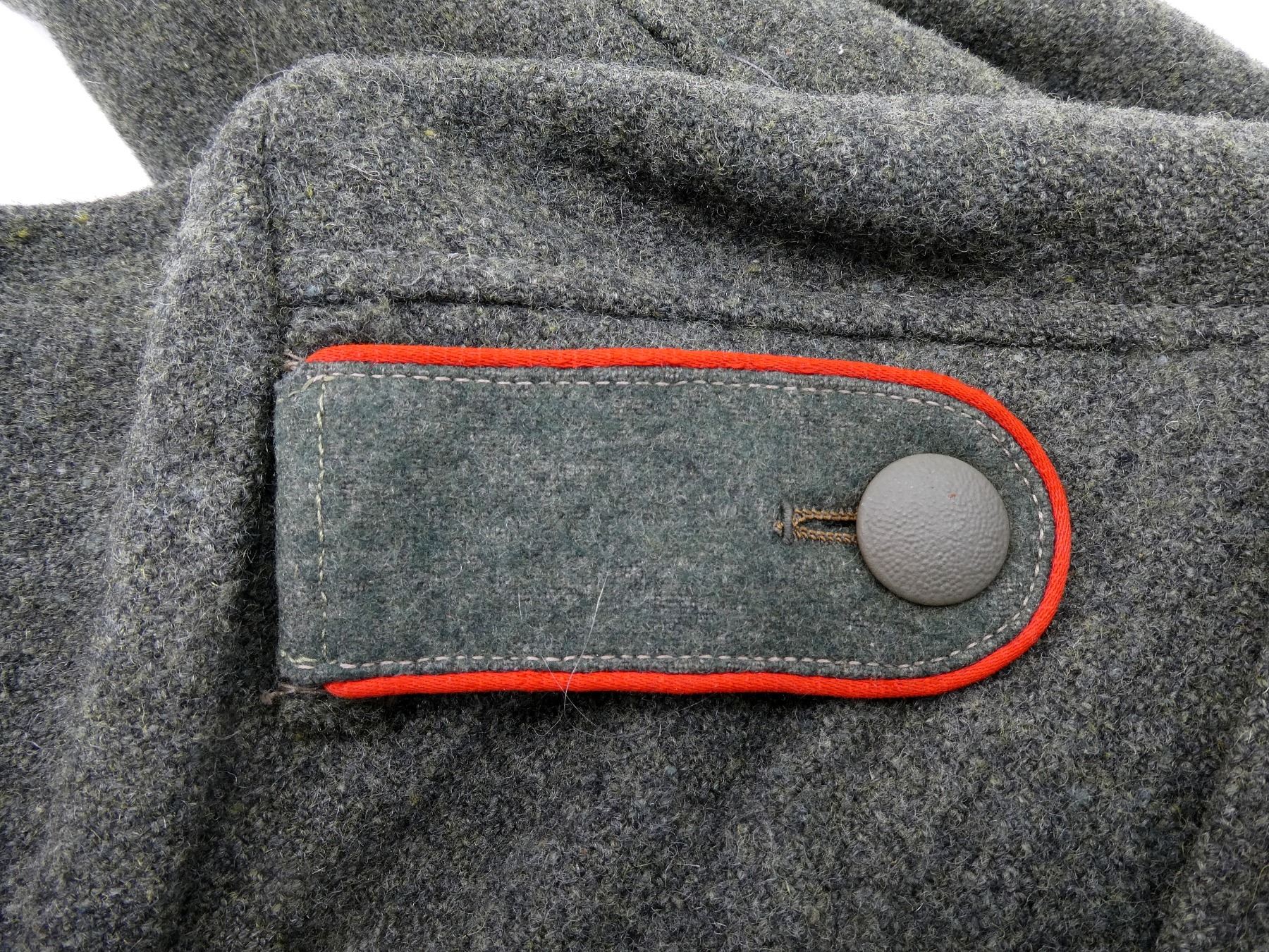 (1) REPRODUCTION ASSAULT GUNNER'S TUNIC, GREYISH GREEN WOOL, RED PIPING ON SHOULDER TABS, ENLISTED ARTILLERY CLOTH COLLAR TABS, GREEN / GREY CLOTH BREAST EAGLE WITH SWASTIKA, SINGLE-BREASTED, NO WAIST BELT, INK STAMPED: "46 00, 112, 72 67, F41", SHOULDER WIDTH APPROX. 18". SEE PHOTOS.