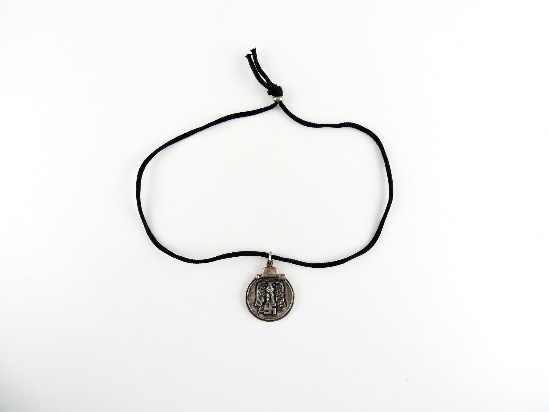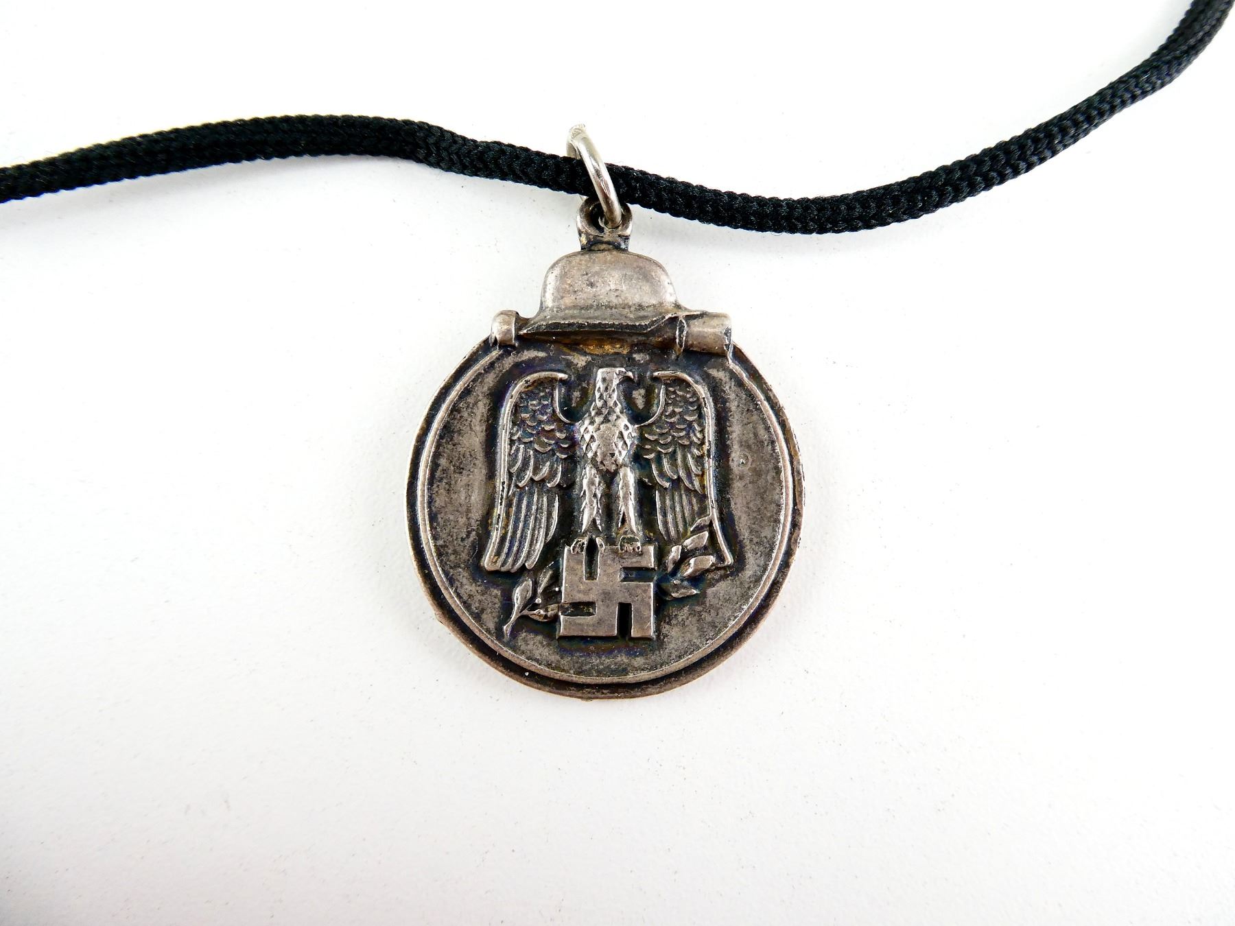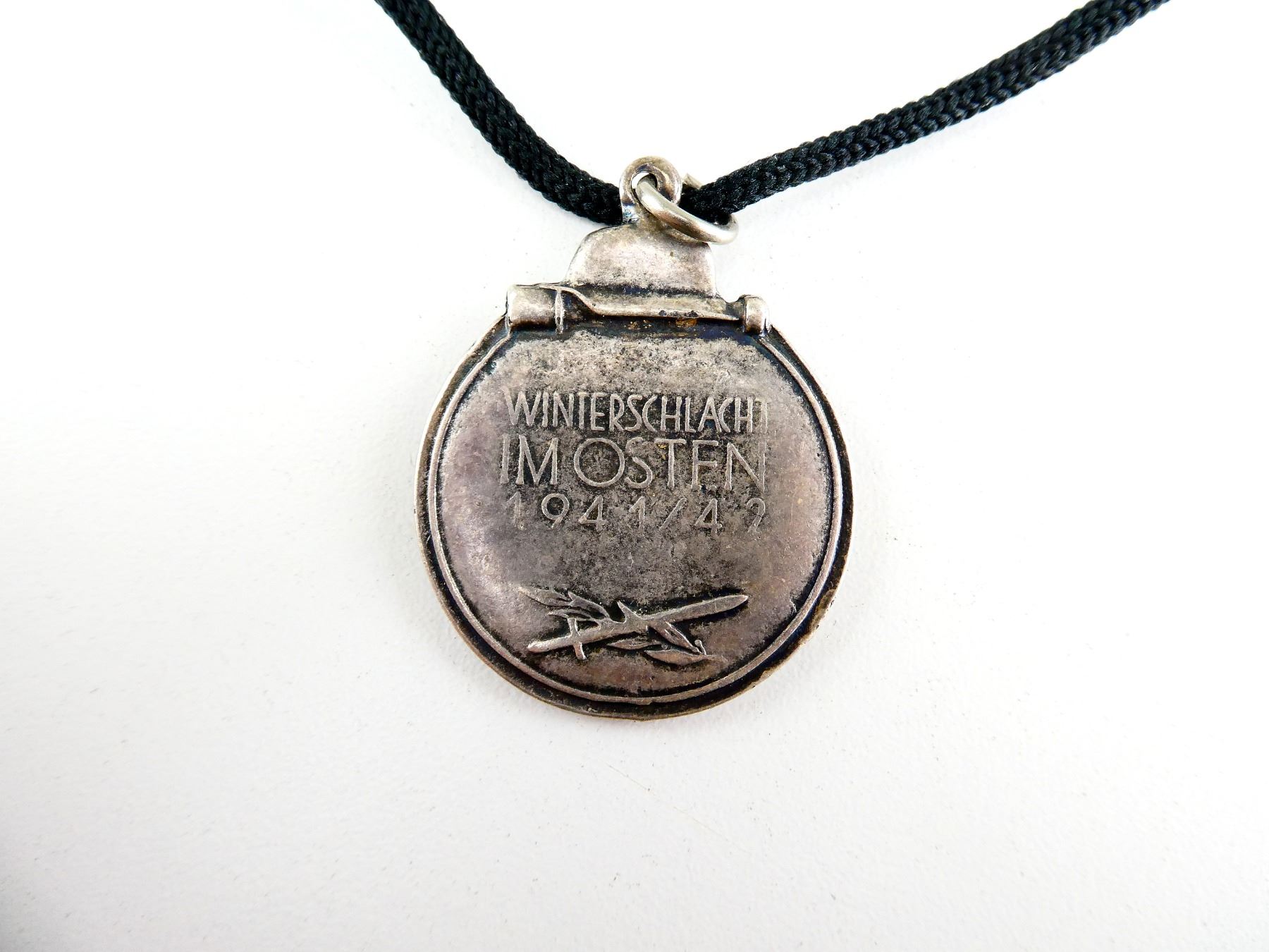 (1) REPRODUCTION EASTERN MEDAL, ALSO KNOW AS / OFFICIALLY THE WINTER BATTLE IN THE EAST 1941-42 MEDAL, MARKED: "WINTERSCHLACHT, IMOSTEN, 1941/42", NO RIBBON, ON LANYARD, NO VISIBLE MARKINGS ON RIBBON LOOP. SEE PHOTOS.