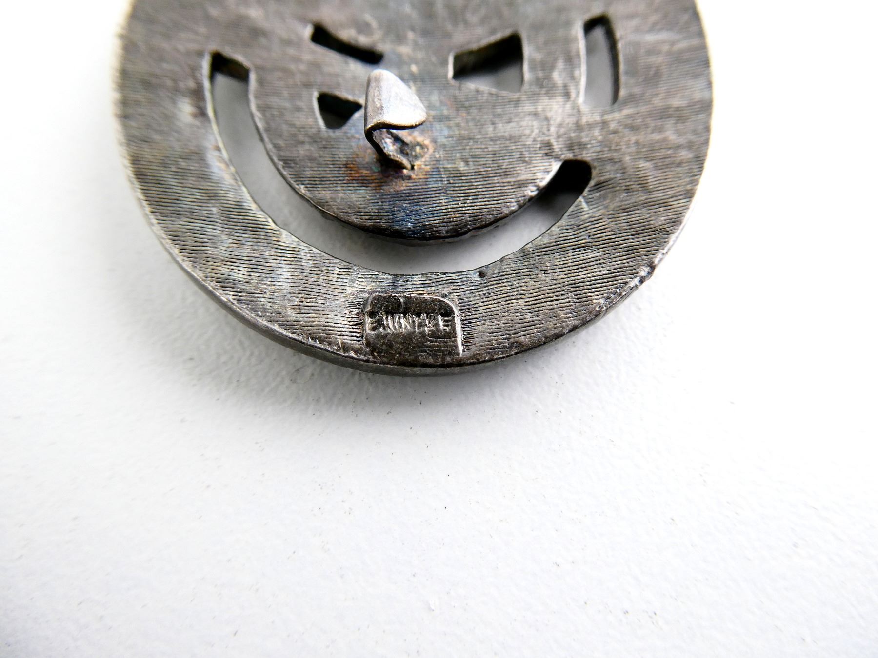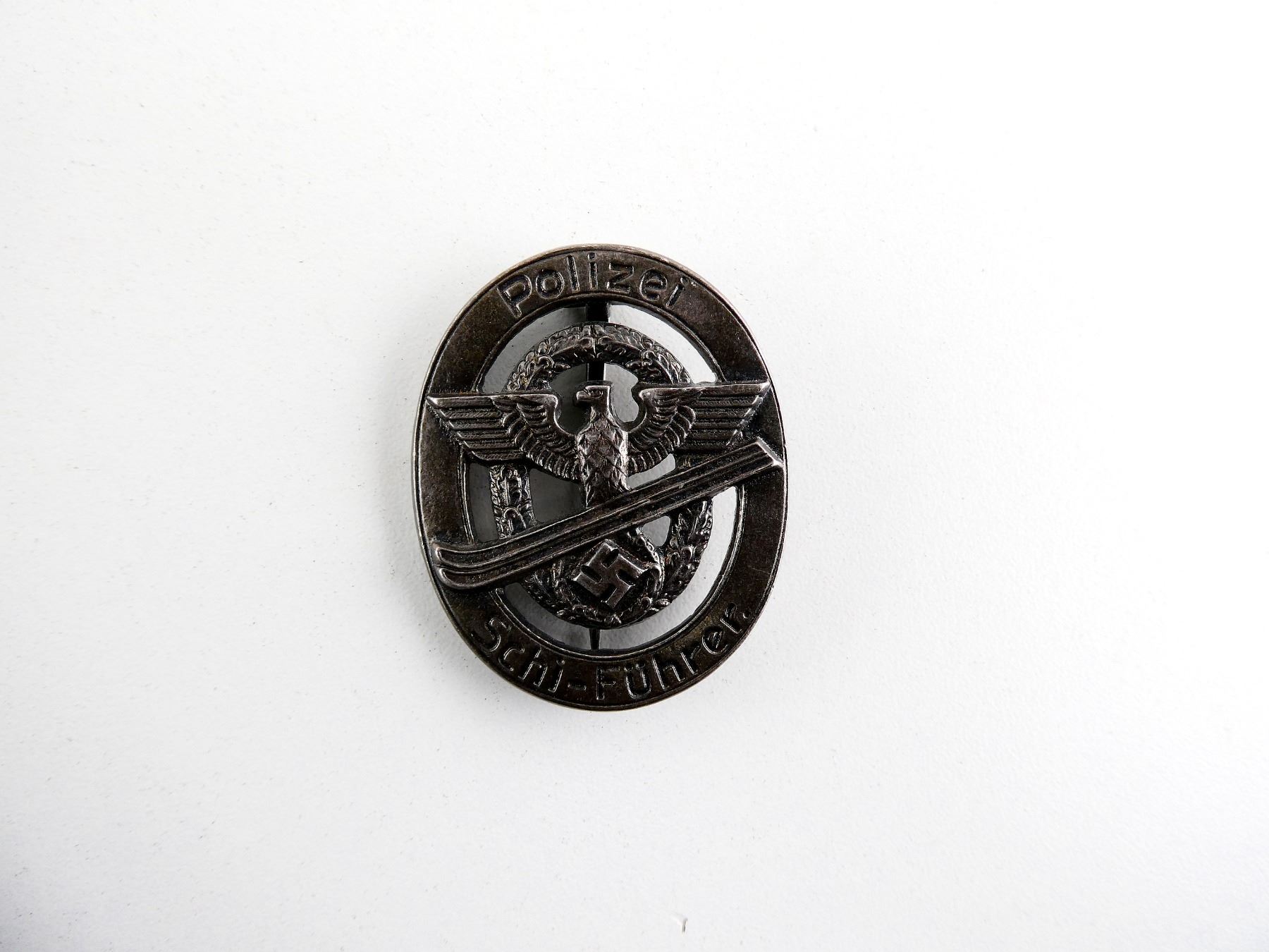 (1) NON-MAGNETIC METAL, FRONT MARKED: "POLIZEI, SCHI-FUHRER", TAPERED FLAT PIN BACKING, FAINT MARKING ON BACK NEAR BOTTOM. SEE PHOTOS.