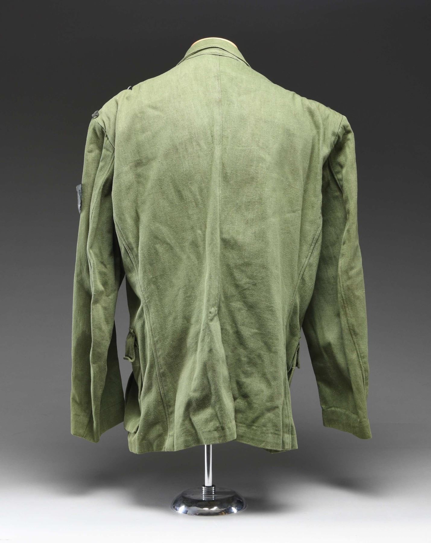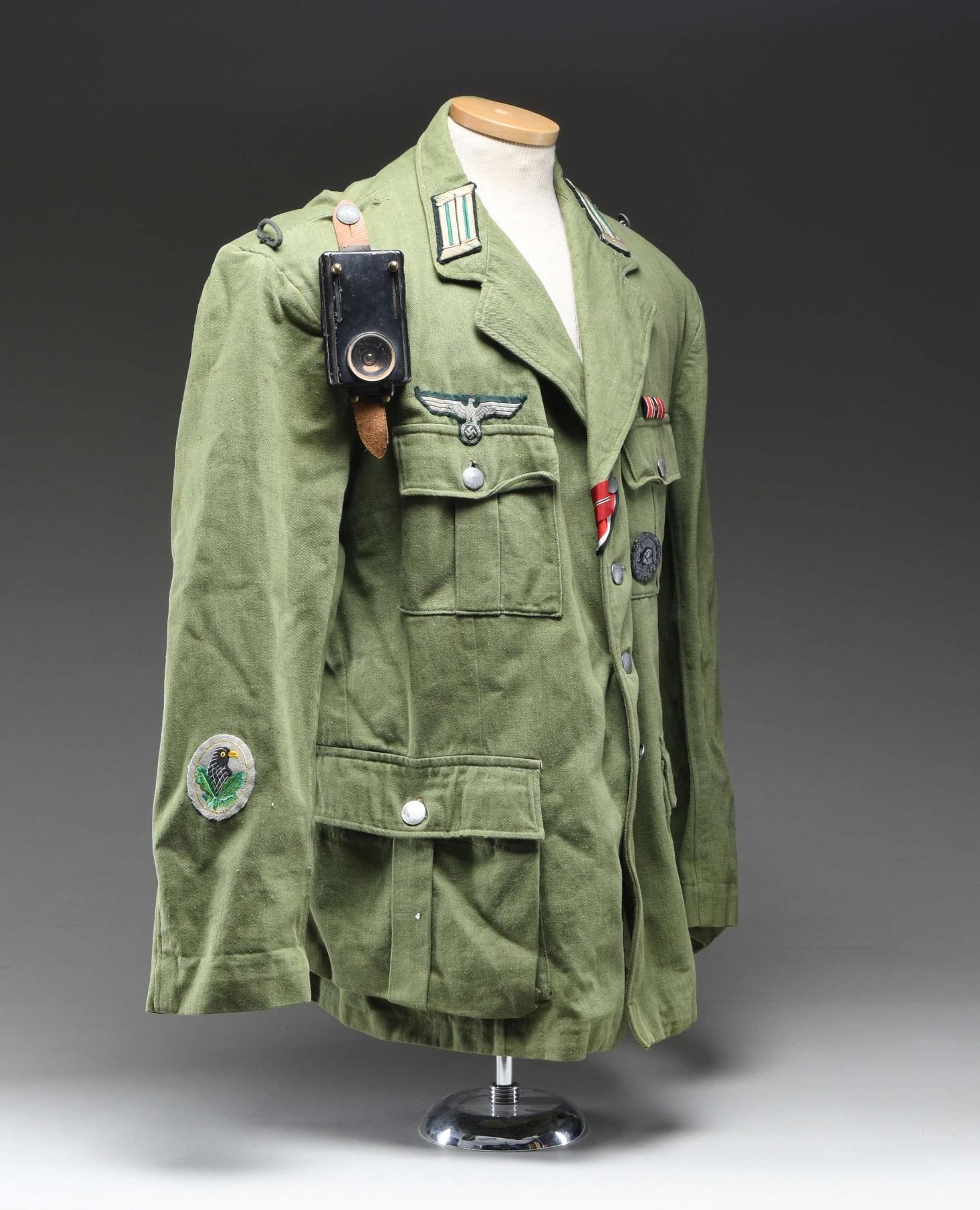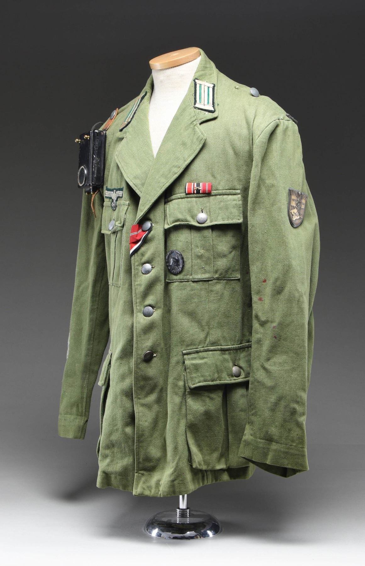 AUTHENTIC ADDITIONS. This uniform was likely made for a reenactor or theatrical purposes. The coat is made of a green denim material with added insignia. Added original insignia include 1 pair of Army collar tabs. / 1 breast eagle. / 1 Krim shield. / 1 black Wound badge. / 1 flashlight attached to a shoulder strap button. Reproduction insignia include 1 sniper's badge. / 2 button hole ribbons. / 1 ribbon bar of 3 awards. CONDITION: coat is very solid with minor ink stains. Original insignia show light wear. (02-24049/BF). $200-400.