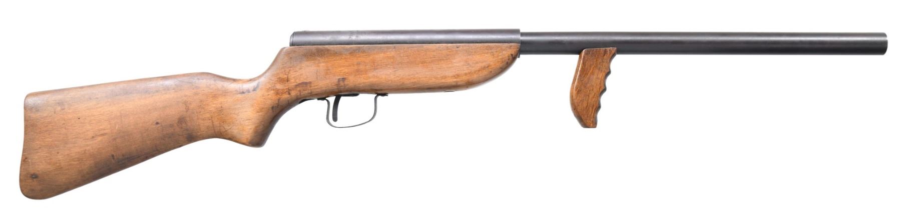 SHOTGUN. Cal. 12 ga. S# 10491. Bbl. 24". Bbl. made w/o sights. These interesting single shot shotguns built on the slam-fire principle were meant to be used at a very short range & would allow the user to hopefully obtain a better weapon from a now incapacitated enemy. Used to a limited extent in the Philippines during WWII. This improved version was marketed by Naval Officer David Richardson. In spite of being manufactured of better materials, the concept did not prove popular & the guns were only sold for a very short time. Receiver is marked on top "RICHARDSON INDUSTRIES, INC. / NEW HAVEN, CONN. / U.S.A. / MODEL R-5-12 GAUGE PAT. PEND / 10491". The trigger of this gun functions only as a latch & is pulled to remove bbl. for loading. Hardwood stock made w/o buttplate. Wooden vertical hand grip w/ finger grooves attached to bbl. CONDITION: stock has moderate to heavy wear w/ areas of added finish. Notable open crack on left side at toe. Metal parts have worn thinning blue w/ areas of very light pitting. Bore has a frosted appearance w/ visible tool marks. (25-2258/RW). CURIO. $200-300.