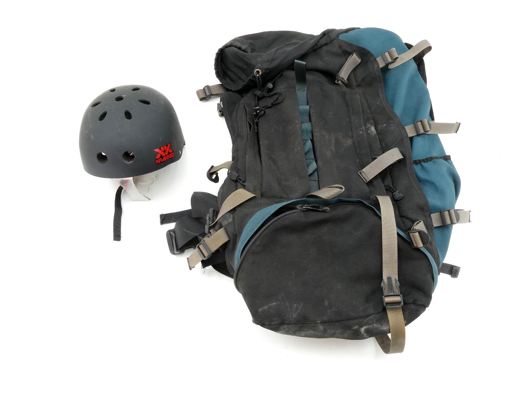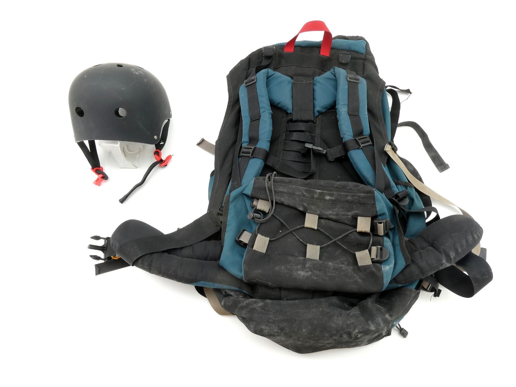 LOT INCLUDES; (1) ROCKWATER DESIGNS YOHO 87 RUCKSACK, TIE CLOSURE, ZIPPER POCKETS, VARIOUS ADJUSTABLE STRAPS, SHOWS WEAR & TEAR / USE MARKS, OVERALL LENGTH APPROX. 17" X 7" X 27" & (1) UNKNOWN SNOW SPORT HELMET, POLYMER EXTERIOR, PADDED INSIDE WITH EPS FOAM, SHOWS WEAR & TEAR / USE MARKS. SEE PHOTOS.