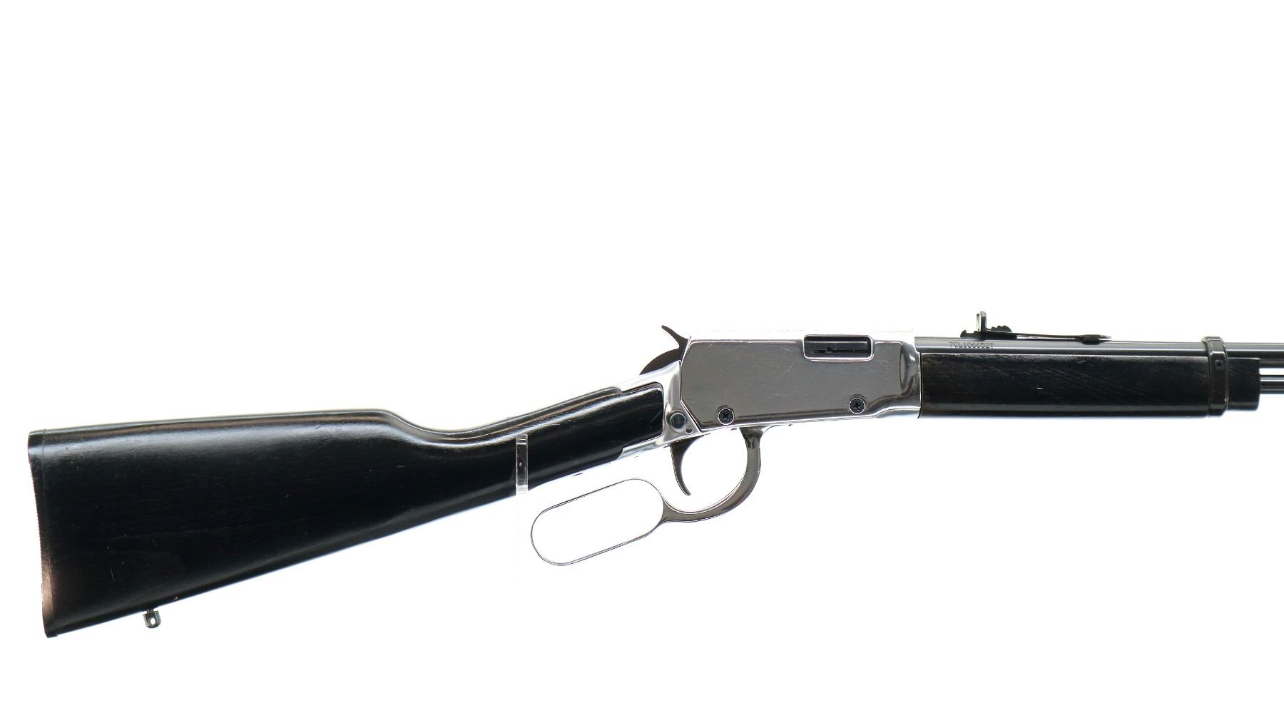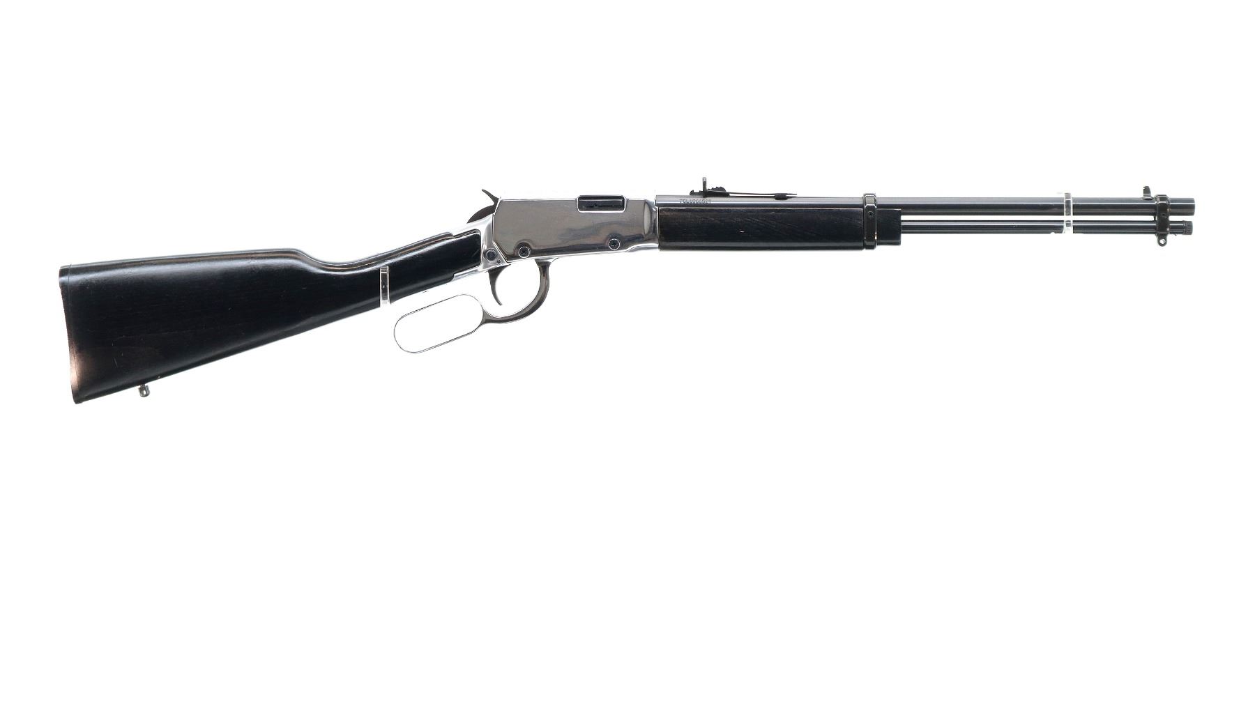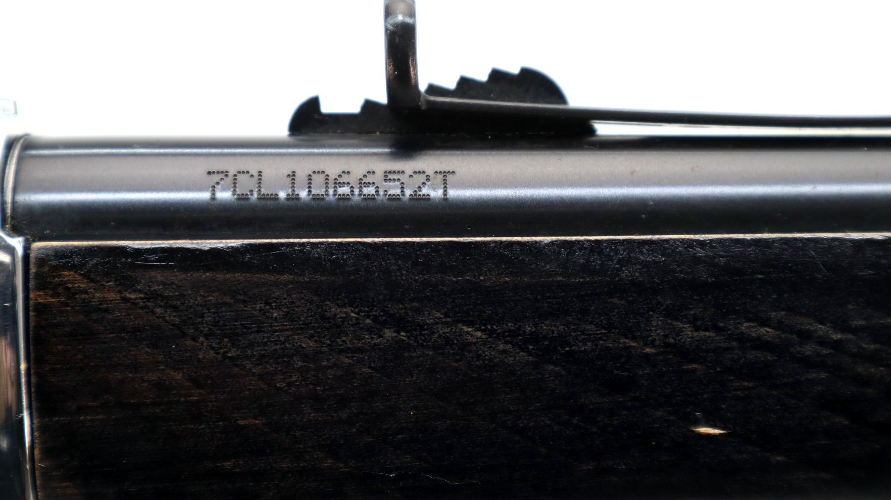 Main Description: Blade front sight, adjustable semi buckhorn u notched rear sight, blued round barrel and outer magtube, grooved Nickel receiver, grooved spur hammer. Two piece black painted wood stocks, straight grip, grooved black polymer butt plate, swivel studs.