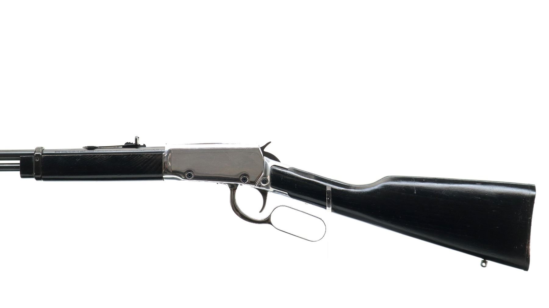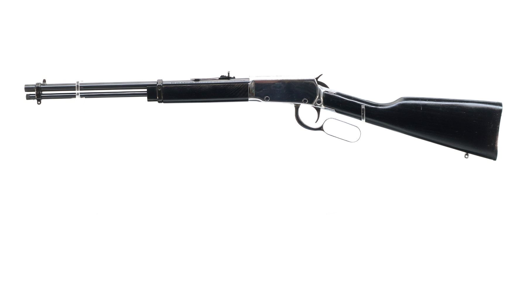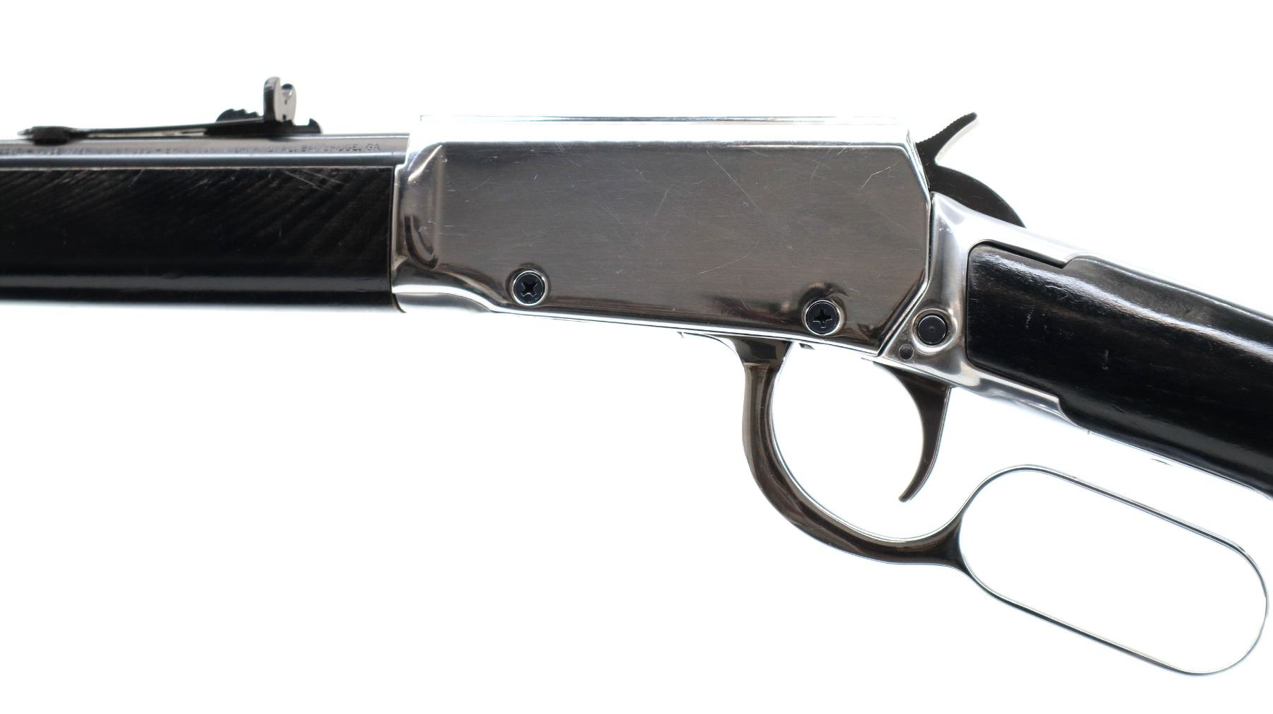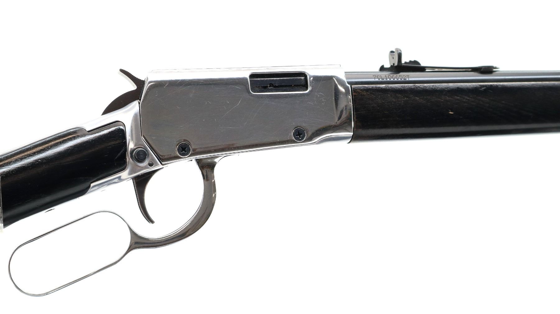 Main Description: Blade front sight, adjustable semi buckhorn u notched rear sight, blued round barrel and outer magtube, grooved Nickel receiver, grooved spur hammer. Two piece black painted wood stocks, straight grip, grooved black polymer butt plate, swivel studs.