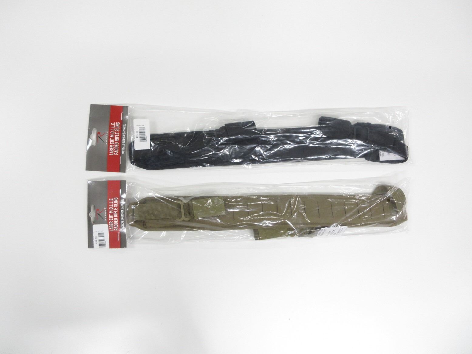 ROTHCO LASER CUT MOLLE PADDED RIFLE SLING LOT. LOT INCLUDES; (1) RIFLE BLACK TACTICAL PADDED SHOULDER SLING, MOLLE COMPATIBLE, .25" THICK PADDING, INTERNAL BUNGEE SYSTEM FOR STABILITY, 600D POLYESTER, ADJUSTABLE LENGTH, NOS, IN ORIGINAL PACKAGING, (1) RIFLE OLIVE GREEN TACTICAL PADDED SHOULDER SLING, MOLLE COMPATIBLE, .25" THICK PADDING, INTERNAL BUNGEE SYSTEM FOR STABILITY, 600D POLYESTER, ADJUSTABLE LENGTH, NOS, IN ORIGINAL PACKAGING