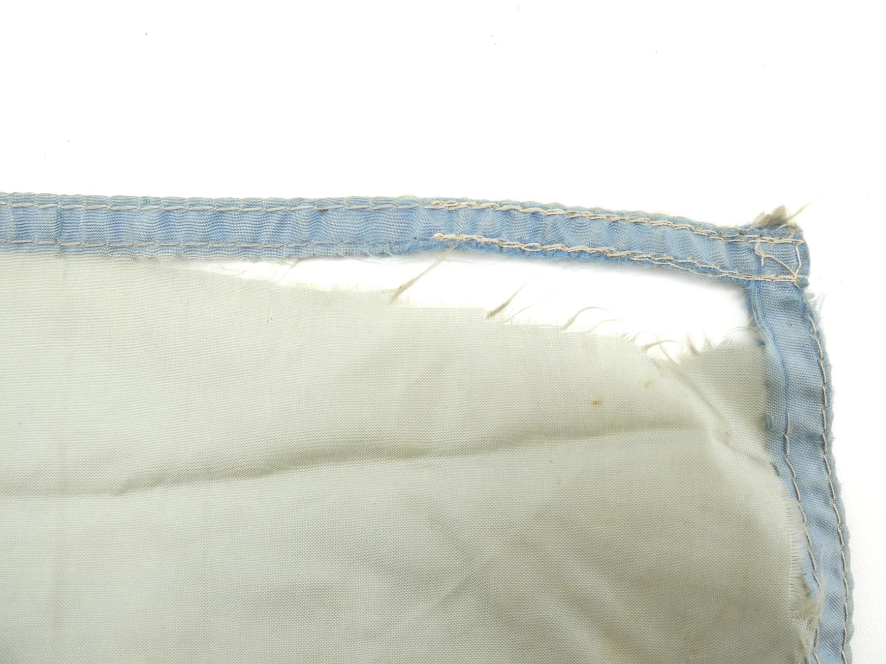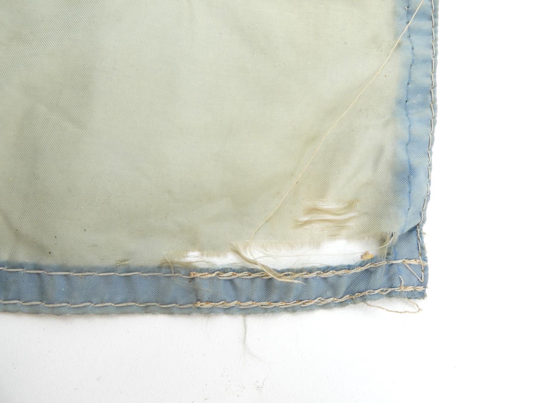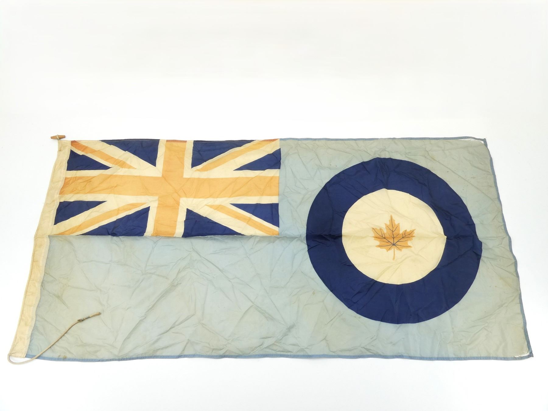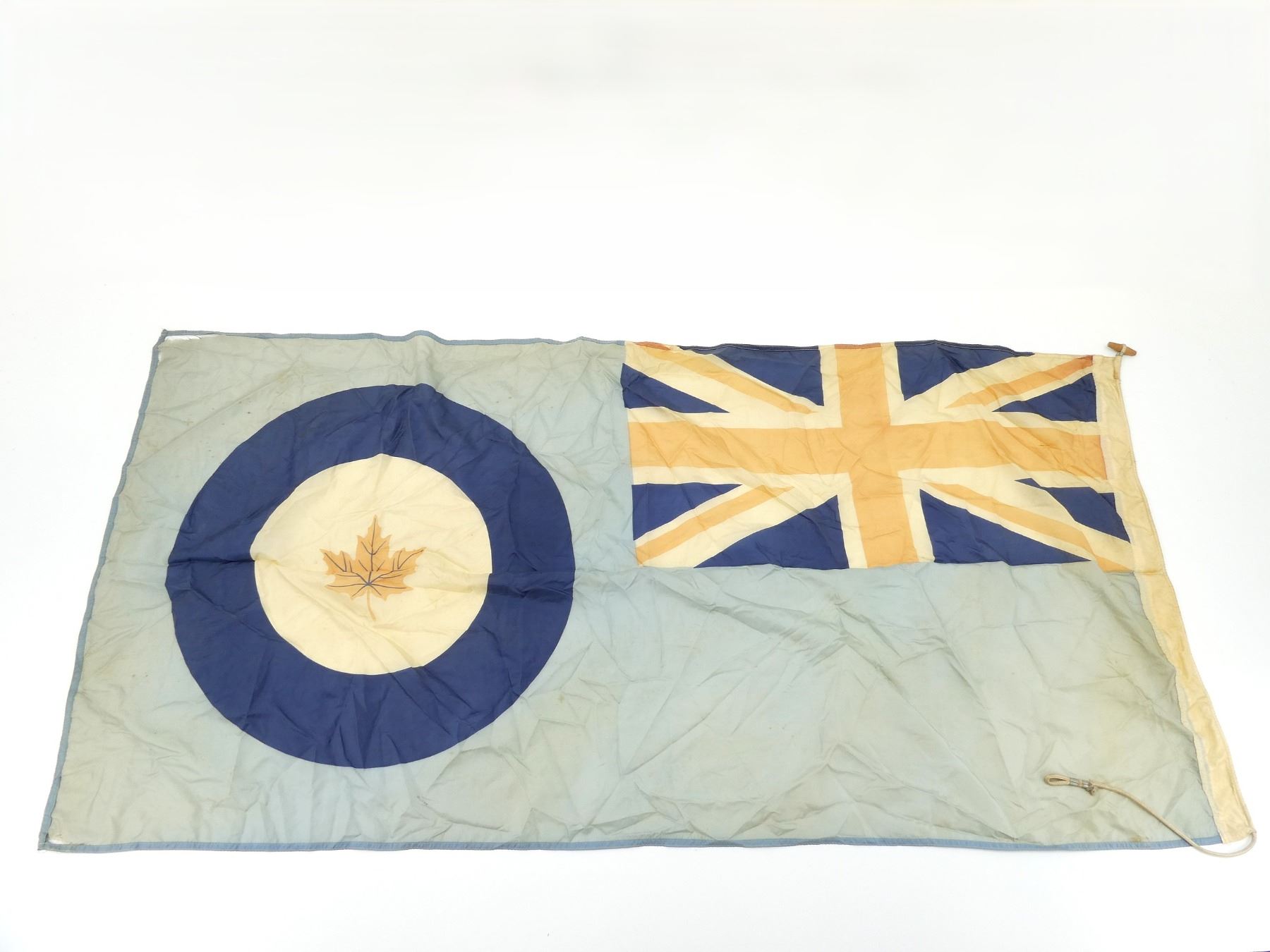 (1) BLUE NYLON FLAG WITH UNION JACK & RCAF EMBLEM, NO VISIBLE MARKINGS, SHOWS AGE / WEAR / TEAR, APPROX. 72.5" X 36". SEE PHOTOS.