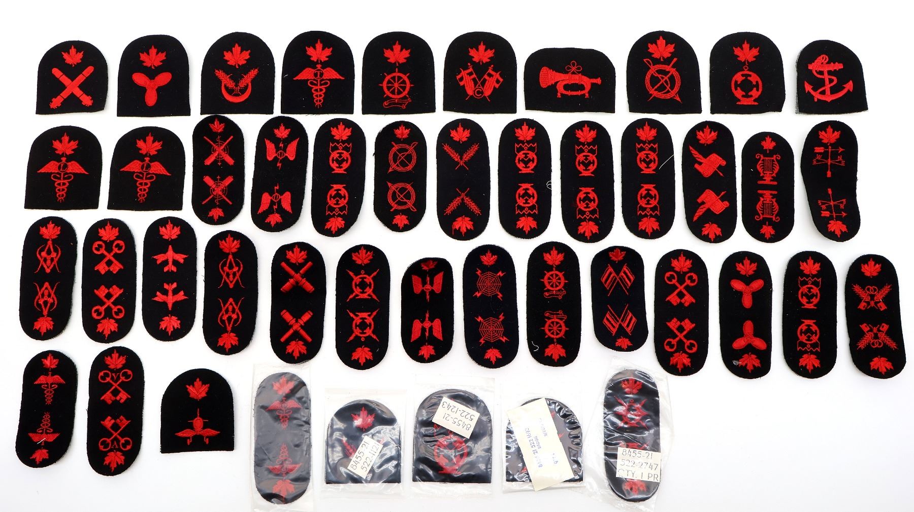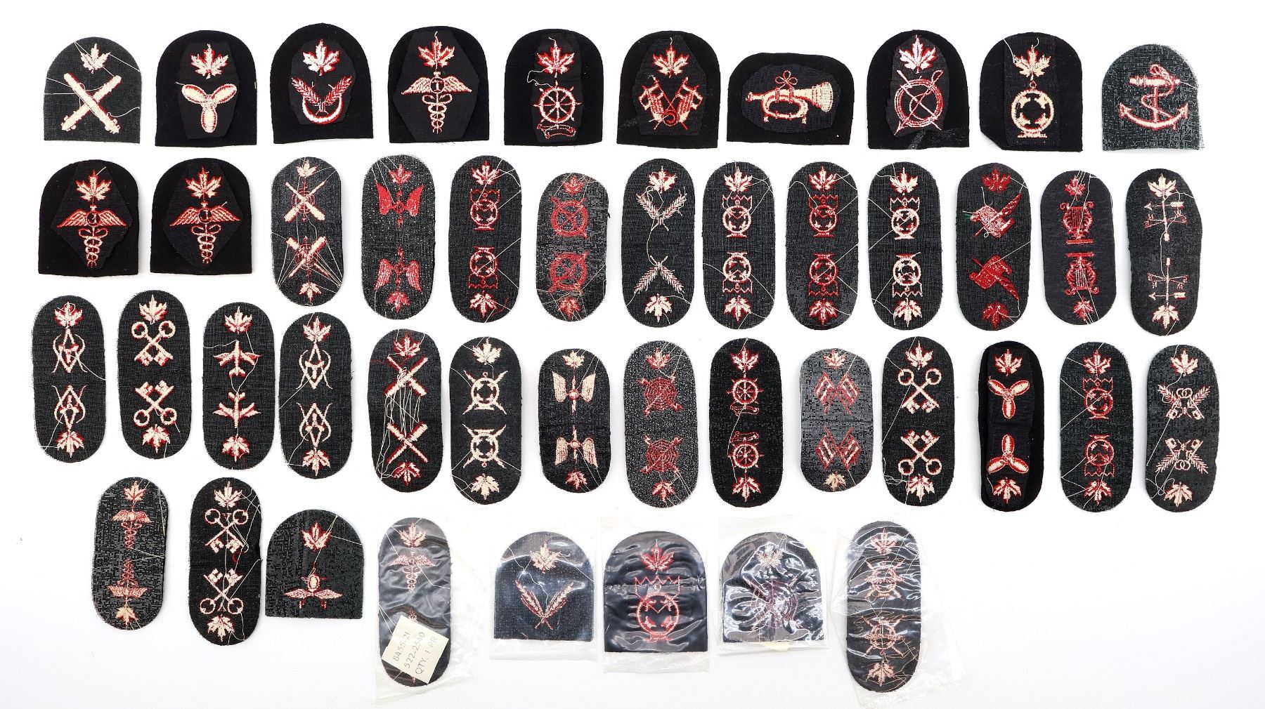 APPROX. (45) PIECES, VARIOUS SIZES, RED / BLACK, SOME NEW OLD STOCK, INCLUDES; SHIP'S STORESMAN, SIGNALMAN, PHARMACIST (NEW OLD STOCK), MEDICAL ASSISTANT, AIR RIGGER (NEW OLD STOCK), AVIATION TECHNICIAN, COMMISSARY MAN (NEW OLD STOCK), BANDSMAN, ENGINEERING MECHANIC, WEAPONMAN UNDERWATER, ETC. SEE PHOTOS.