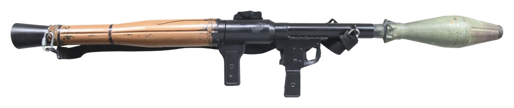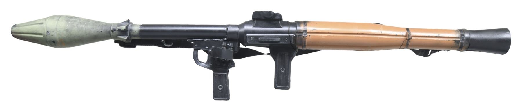 Non-firing dummy prop of the famous Soviet RPG-7 rocket propelled grenade. Prop appears to unmarked & measures 48" from tip of rocket to rear of launcher. Rocket does indeed detach. RPG features black & tan paint finish with green rocket. Black nylon sling present. CONDITION: RPG shows scattered non-structural cracks, chipping, flaking paint & some oxidation. (02-24346/MJC). $500-800.