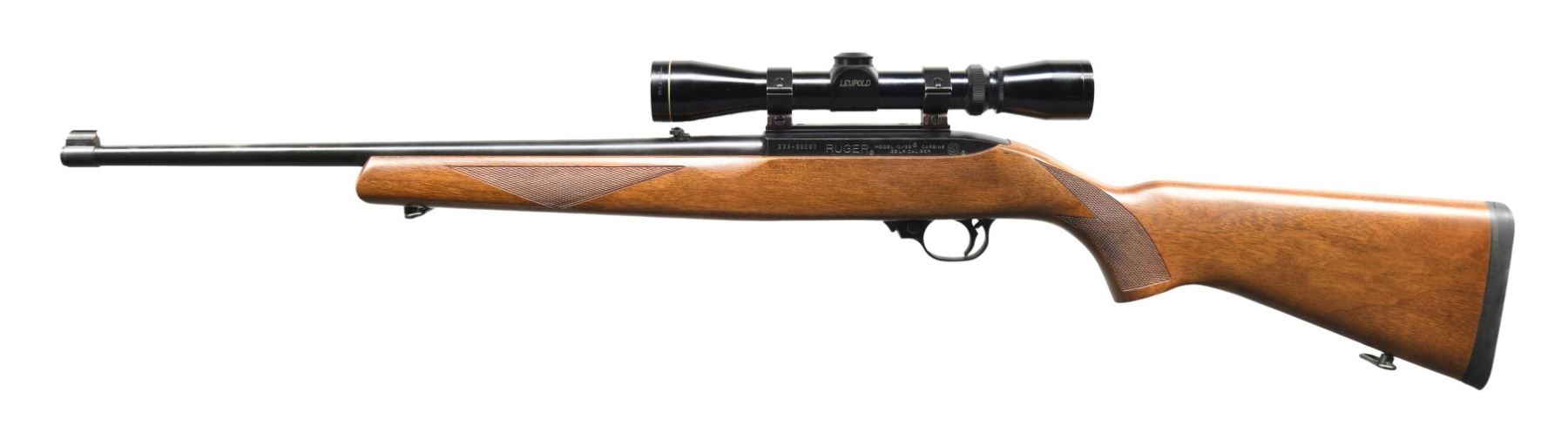 Cal. 22 LR. S# 236-39280. Mfg. 1992  as Model 1102 & Catalog No. 10/22DSP. Barrel 18.5". Bead front & folding rear sights. D&T receiver has Leupold VX-I 2-7x33mm scope with duplex reticle on Alloy tip off rings & base. Deluxe Sporter Stock with checkering, sling swivels & black pad. MAGS: 1 - 10 rd. CONDITION: very good blue with large area of loss & scattered spots of oxidation. Near excellent wood finish with handling marks. Bright bore with sharp rifling. Scope has very good finish with clear optics. Mag. seems to periodically be unable to be release from action. 2 Hairline grain checks on right side of stock. (24-4283/MD). MODERN. $300-450.