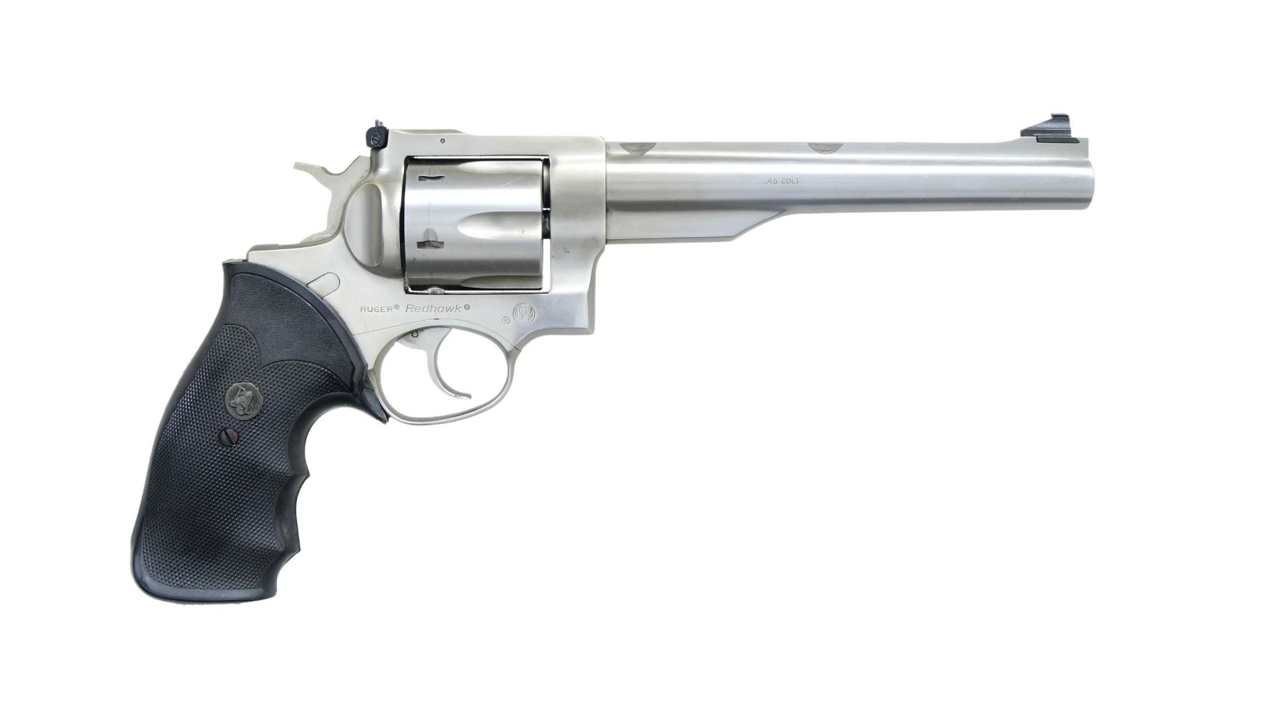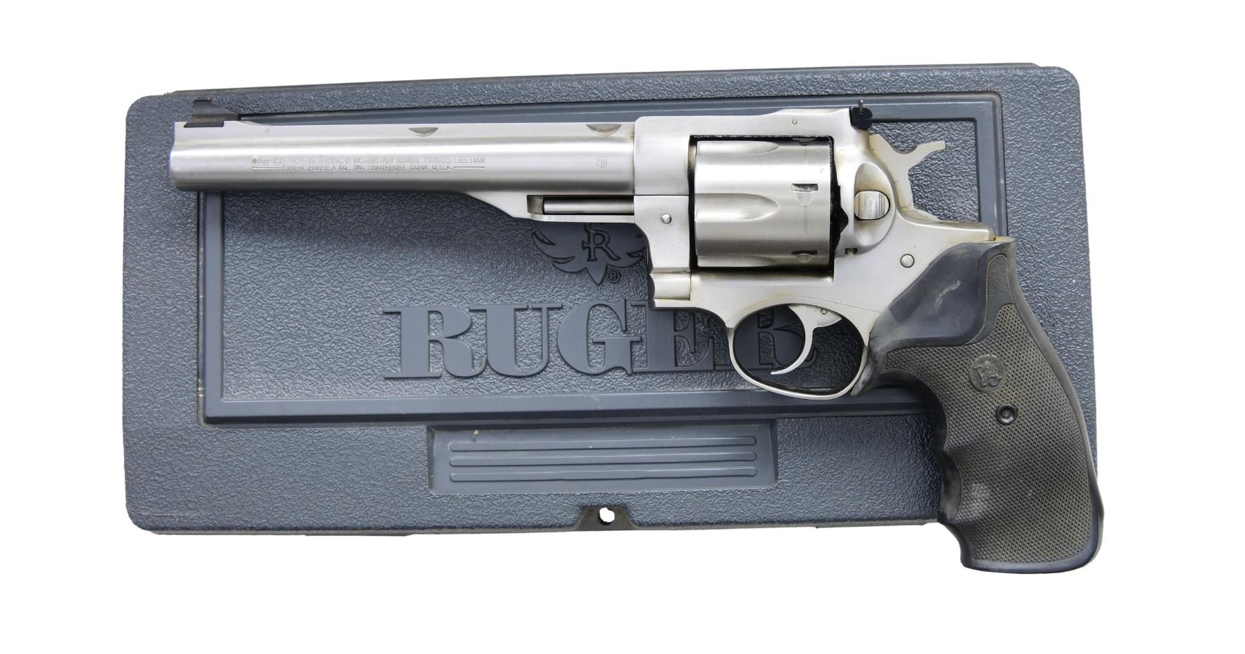 MATCHING FACTORY BOX. Cal. 45 Colt (45 LC). S# 503-25596. Mfg. 1998 as Model 05024; Catalog # KRH-45R. Satin stainless finish. Bbl. 7.5". Bead front sight w/ adjustable rear sight. Fluted 6 shot cyl. Top strap machined for Ruger integral ring system. Factory finger grooved black rubber grips of Hogue style with pebble grained texture. UNATTACHED ACCESSORIES: factory box with paperwork and Ruger rings; paperwork has evidence of water damage. CONDITION: near excellent overall. (25-951/MD). MODERN. $450-650.