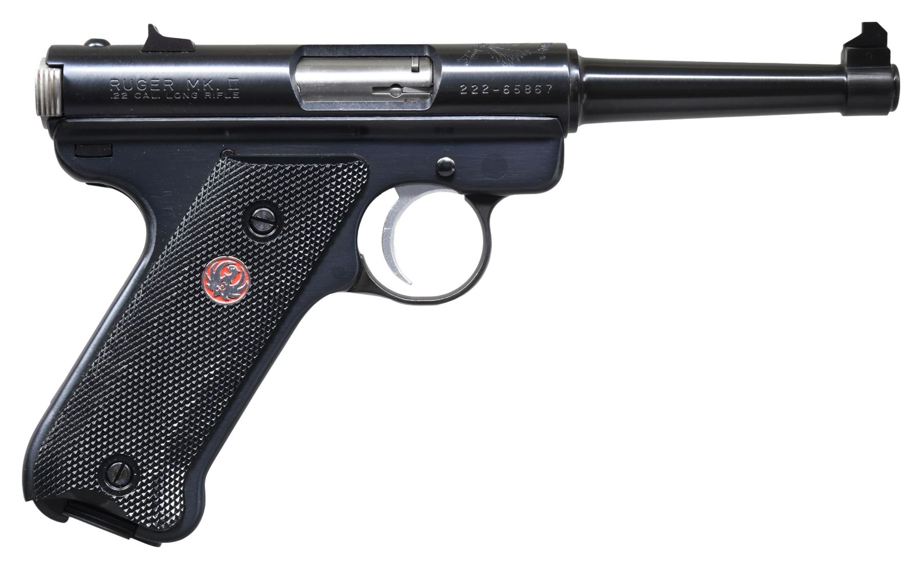 Cal. 22 LR. S# 222-65867. Bbl. 4 3/4" with banded Patridge blade; windage drift adjustable rear sight on receiver. Mfg. 1999 (1982-2005 for all MK II's) as MK450 with Model number 00149. 50th Anniversary Model with special anniversary logo stamped over chamber area ("Chamber Seal Model"), checkered black plastic grips having red eagle medallions, serrated silver trigger and stainless bolt with Ruger eagle at rear. MAGS: 2 factory 10 rd. with red eagle push button bases. UNATTACHED ACCESSORIES: red 50 year plastic case with packaging. CONDITION: all aspects near excellent appearing new and unfired. (25-1180/NW). MODERN. $250-400.