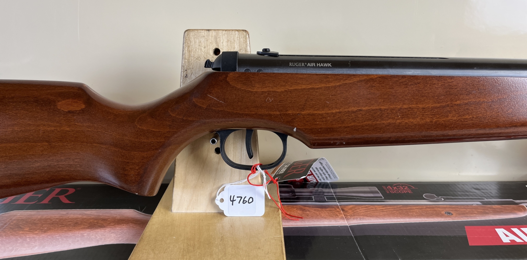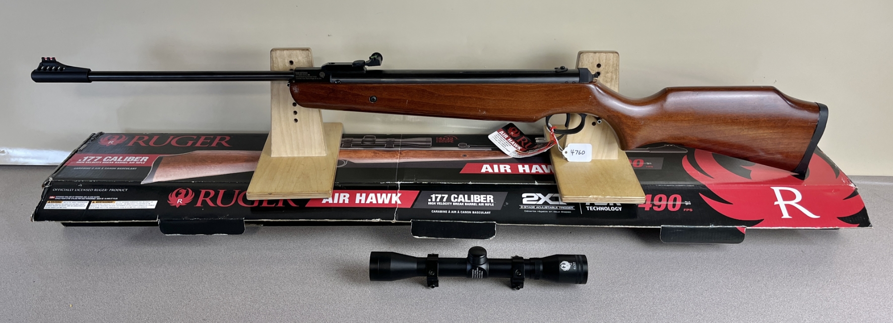 CONDITION: F-G OVERALL VG BORE. SPECS: 19IN BBL WITH FIBRE OPTIC SIGHTS. <500 FPS. EXTRAS: ORIGINAL BOX, 4X32 SCOPE CLEAR WITH CROSSHAIRS. S/N: AD703523