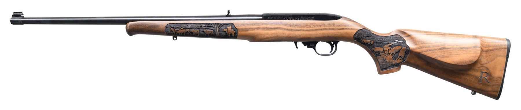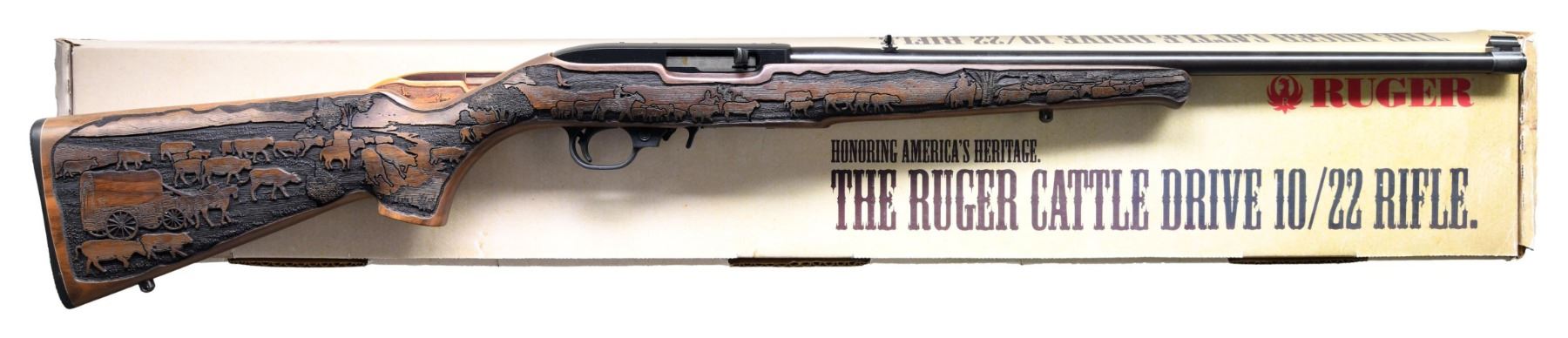 Cal. 22 LR. S# RCD-00104. Bbl. 20" with banded brass bead front sight and folding leaf rear. Mfg. 2012 (1964 to date for all 10/22's) as 10/22-CD (Model 11103) for Talo Distributors with cattle drive scenes deeply laser engraved into its walnut stock having straight comb, raised cheekpiece, schnable tip, sling studs and special Ruger logo synthetic buttplate. First of 3 in Ruger Americana Series that was limited to 3,300 units and is now sold out. Factory extended magazine release. Very classy special edition for those with an attachment to the old west. MAGS: 1 factory 10 rd. UNATTACHED ACCESSORIES: original Cattle Drive box with scene on lid and packaging. CONDITION: all aspects near excellent appearing new and unfired. (24-3588/NW). MODERN. $400-600.
