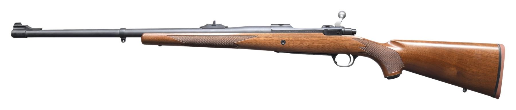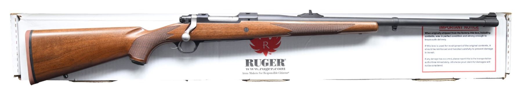 Cal. 223 Rem. S# 711-20151. Bbl. 23". Ramped white bead front sight. Adjustable rear sight. Integral scope bases. Ruger catalog #HM77RS & model # 17199 M77 Hawkeye African rifle made in 2010. Matte blue finish with Ruger logo on floorplate. Checkered walnut pistol grip stock with bottom mounted sling studs & factory recoil pad. LOP: 13 1/2". UNATTACHED ACCESSORIES: matching numbered factory box with manual, paperwork, set of blued factory rings & trigger lock. CONDITION: all aspects near excellent. (24-3706/MJC). MODERN. $400-600.