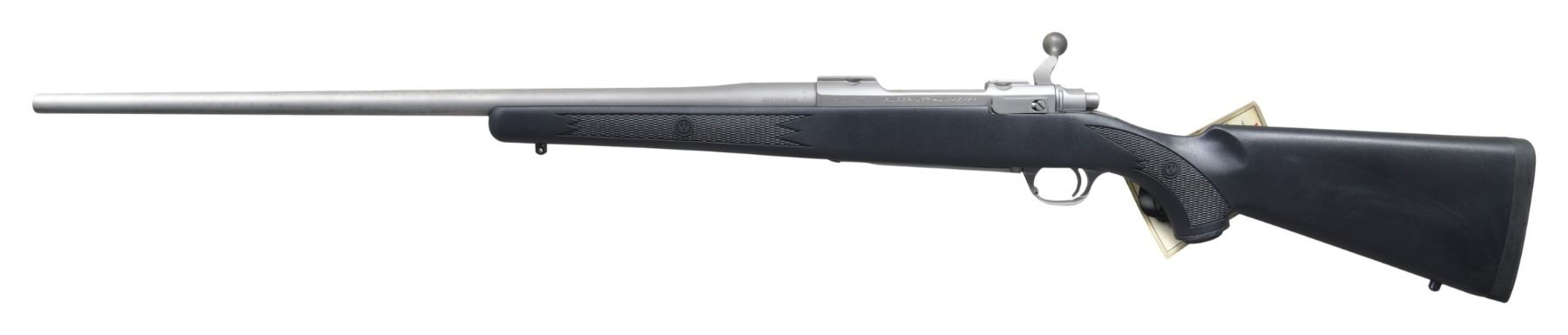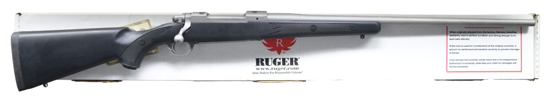 Cal. 264 Win Mag. S# 710-64779. Bbl. 24". Receiver has integral scope bases. Ruger catalog #HKM77RFP All Weather M77 Hawkeye rifle made in 2008. Matte stainless finish. Checkered black synthetic stock with bottom mounted sling studs & factory recoil pad. LOP: 13 1/2". UNATTACHED ACCESSORIES: matching numbered factory box with manual, set of stainless Ruger rings & trigger lock. CONDITION: stock shows light handling wear. Bbl. shows light oxidation staining spots. Action functions properly when hand cycled. Bright near excellent bore. (25-3548/MJC). MODERN. $400-600.
