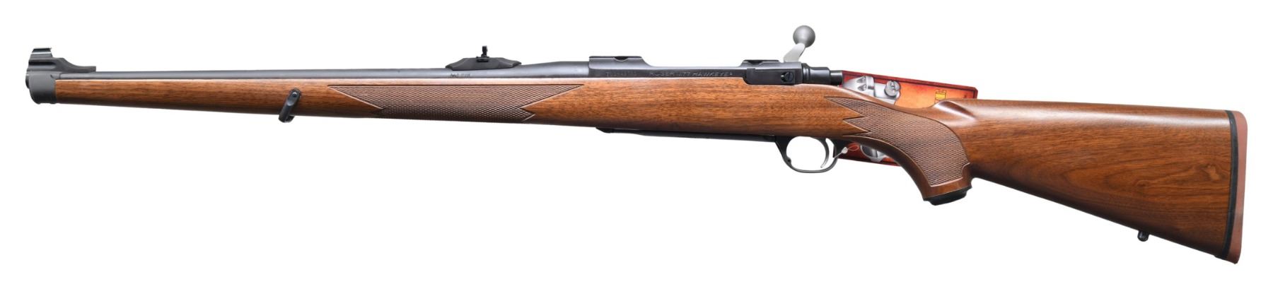 Cal. 270 Win. S# 711-49785. Bbl. 18 1/2". Ramped gold bead front sight. Ramped flip up rear sight. Receiver has integral scope bases. Ruger catalog #HM77RSI & model #17142 RSI made in 2012. Satin blue finish with Ruger logo on floorplate. Mannlicher style walnut stock with bottom mounted sling hardware & factory recoil pad. LOP: 13 1/2". UNATTACHED ACCESSORIES: matching numbered factory box that is missing one of its ends & a few tears. Also included are a manual, set of blued Ruger rings & trigger lock. CONDITION: all aspects near excellent with factory hang tag present on trigger guard. (24-3584/MJC). MODERN. $400-600.