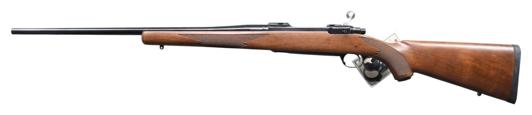Cal. 257 Roberts. S# 791-89770. Bbl. 22". Integral scope bases. Ruger catalog # M77R MKII & model # 07877 M77 Mark II made in 2006. Blued finish. Checkered walnut pistol grip stock with bottom mounted sling studs & factory recoil pad. LOP: 13 1/2". UNATTACHED ACCESSOIRES: matching numbered factory box with set of blued Ruger rings, manual, paperwork & trigger lock. CONDITION: all aspects near new in the box with factory hang tag present on trigger guard. (24-3744/MJC). MODERN. $500-800.