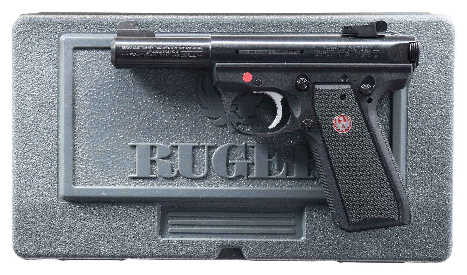 PISTOL WITH MATCHING BOX. Cal. 22 LR S# 228-27495 (2006). Catalog No. P4MKIII. Bbl. 5.5". This model features a blued finish with fixed sights and checkered grips. The frame includes a left-side safety and magazine release. MAGS: two 10-rd. UNATTACHED ACCESSORIES: factory box, instruction manual, and additional paperwork. CONDITION: near excellent, with 95% finish remaining on the slide and on the frame. Bore is clean with sharp rifling. (25-2008/MD). MODERN. $300-400.