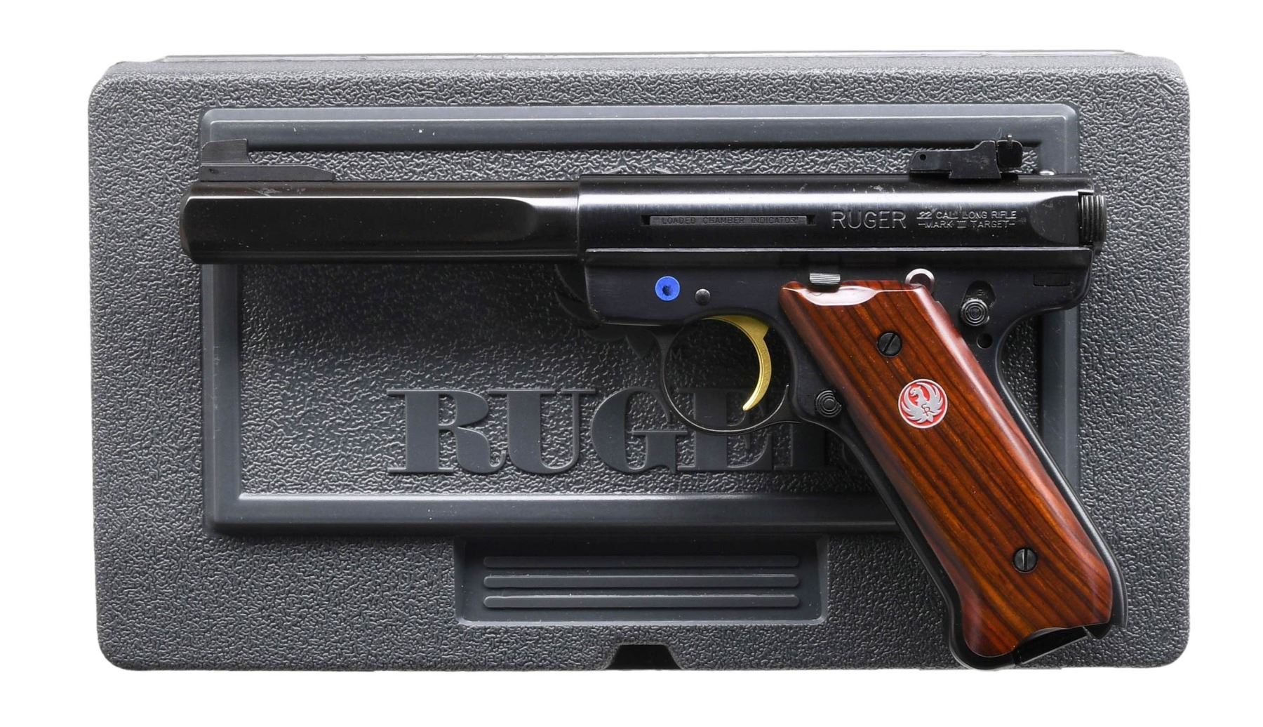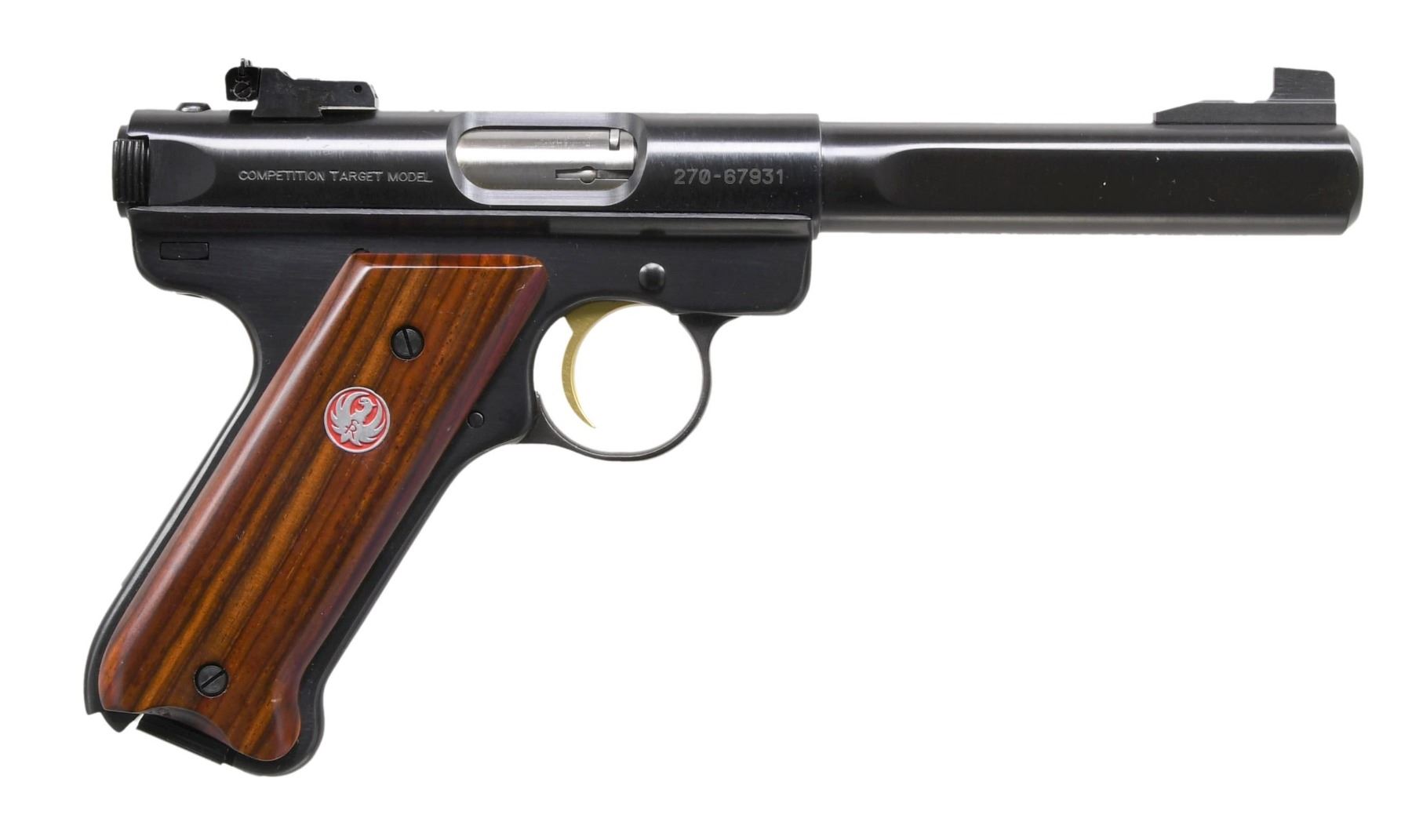 AUTO PISTOL WITH FACTORY BOX. Cal. 22 LR. S# 270-67931 (2009). Model: 10122 / Catalog No. MKIII512GCL. Alloy frame with blued finish. 5.5" Slabside barrel. Standard replacement fixed front sight & adjustable rear sight; Hi-Viz sights included. Single-action with manual safety on the left side of the frame. Cocobolo grips. MAGS: 2-10 Rds. UNATTACHED ACCESSORIES: Factory box, manual, additional accessories. CONDITION: Overall near excellent condition. Slide retains approximately 95% of original blued finish. Frame retains about 95% finish. Bore is bright with strong rifling. MODERN (25-2009/MD) $250-$350.