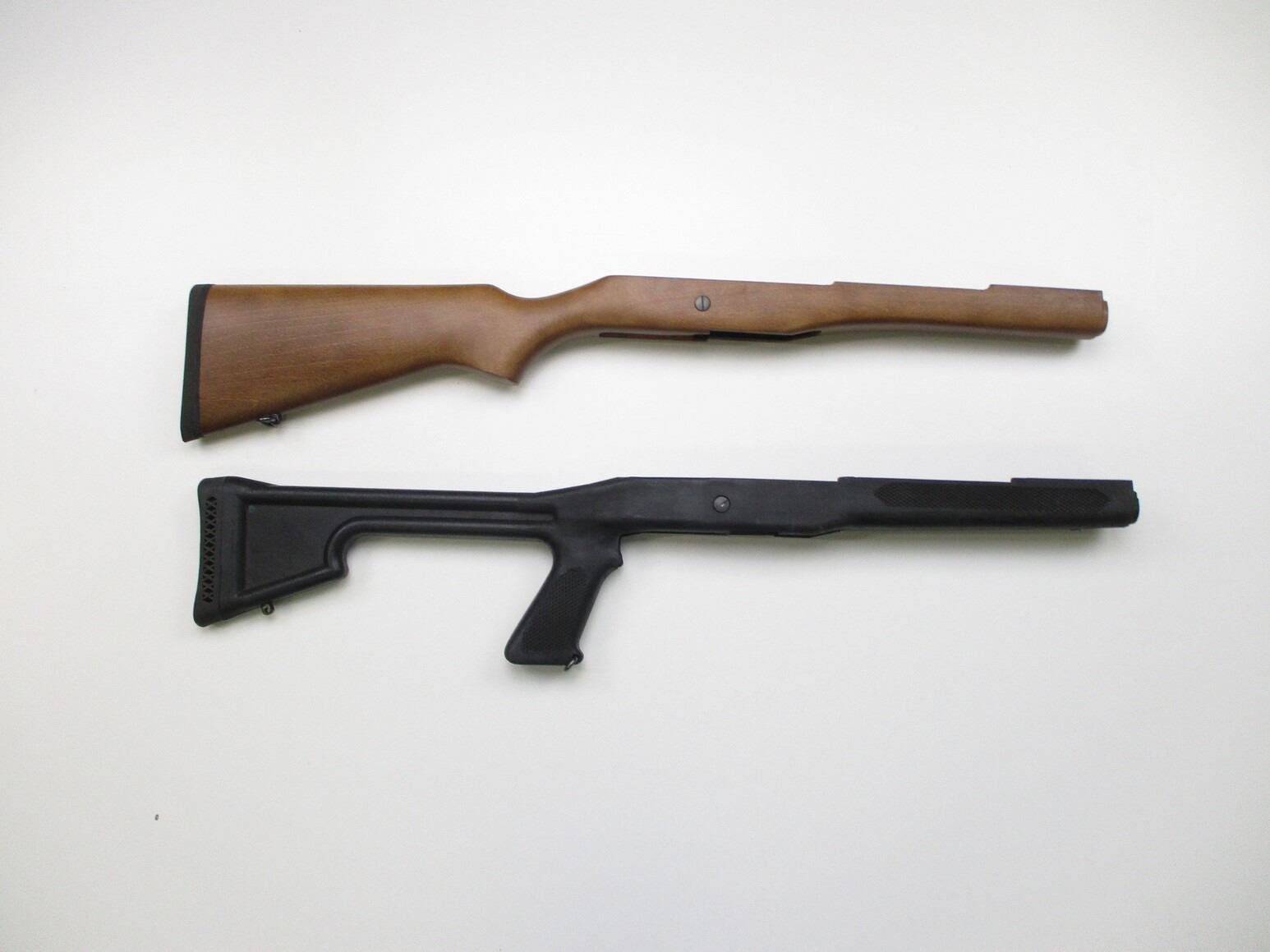 RUGER MINI 14 RIFLE STOCKS . LOT OF 2. (1) WOODEN STOCK, WITH RECOIL PAD, REAR SWIVEL & OTHER METAL PARTS, APPROX. 29" OAL, MAY REQUIRE FITTING, (1) BLACK SYNTHETIC STOCK, WITH PISTOL GRIP, SWIVEL & SWIVEL STUD, WITH OTHER METAL PARTS, FIXED BUTT STOCK, APPROX. 29" OAL. MAY REQUIRE FITTING.