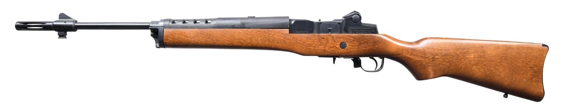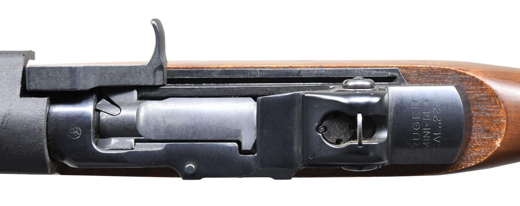 Cal. 223 (223 Rem.). S# 181-78778. Mfg. 1979 as Second "Newport" model with Warning marks on left side of receiver.. Bbl. 18". Band mounted blade front sight has pinned flash hider & bayonet lug. Receiver peep sight. Fiberglass handguard. Walnut stock w/ Celcon buttplate. MAGS: 1 Ruger 5 rd.. CONDITION: all aspects very good showing handling marks. (25-2334/MD). MODERN. $500-900.