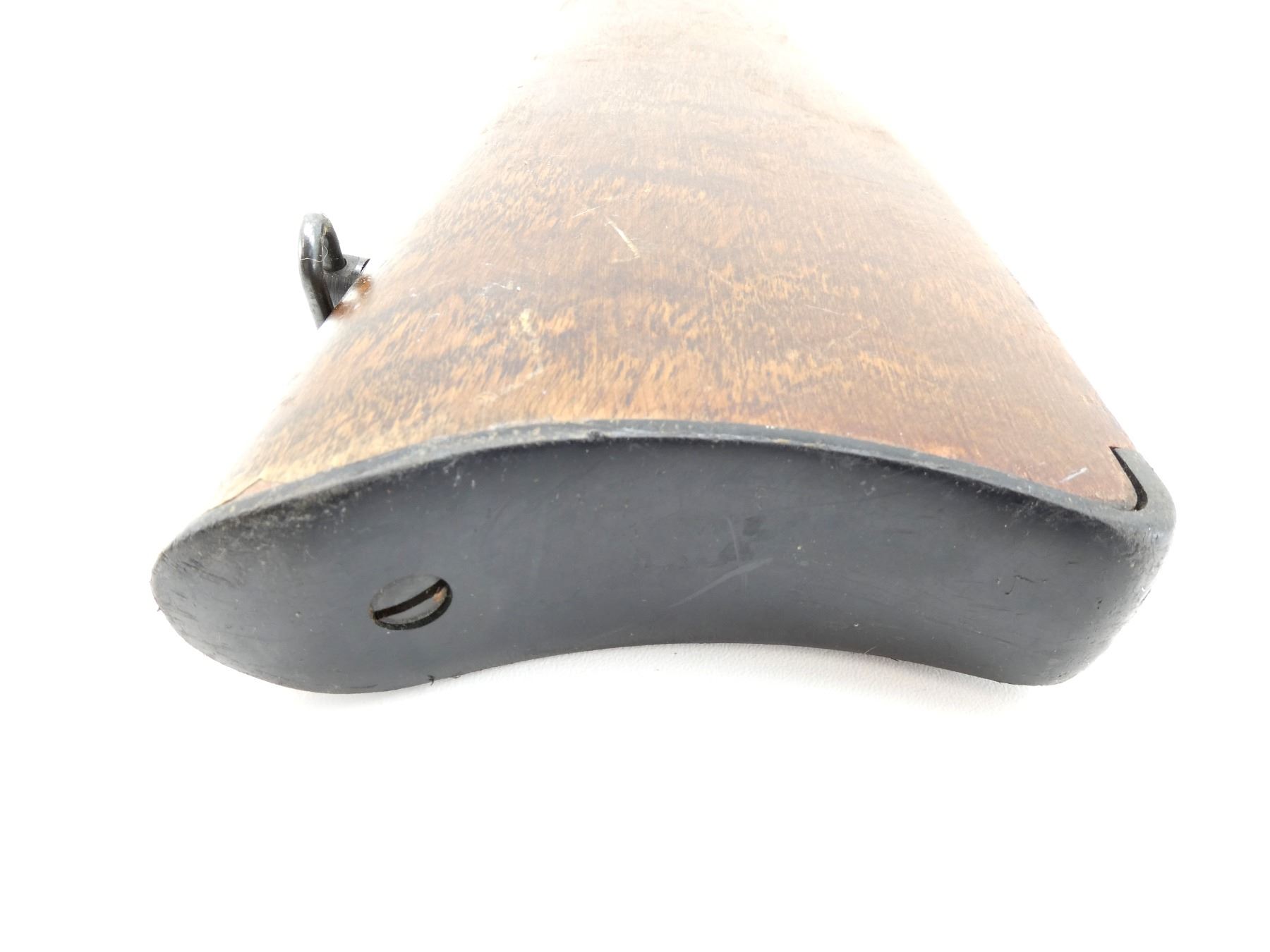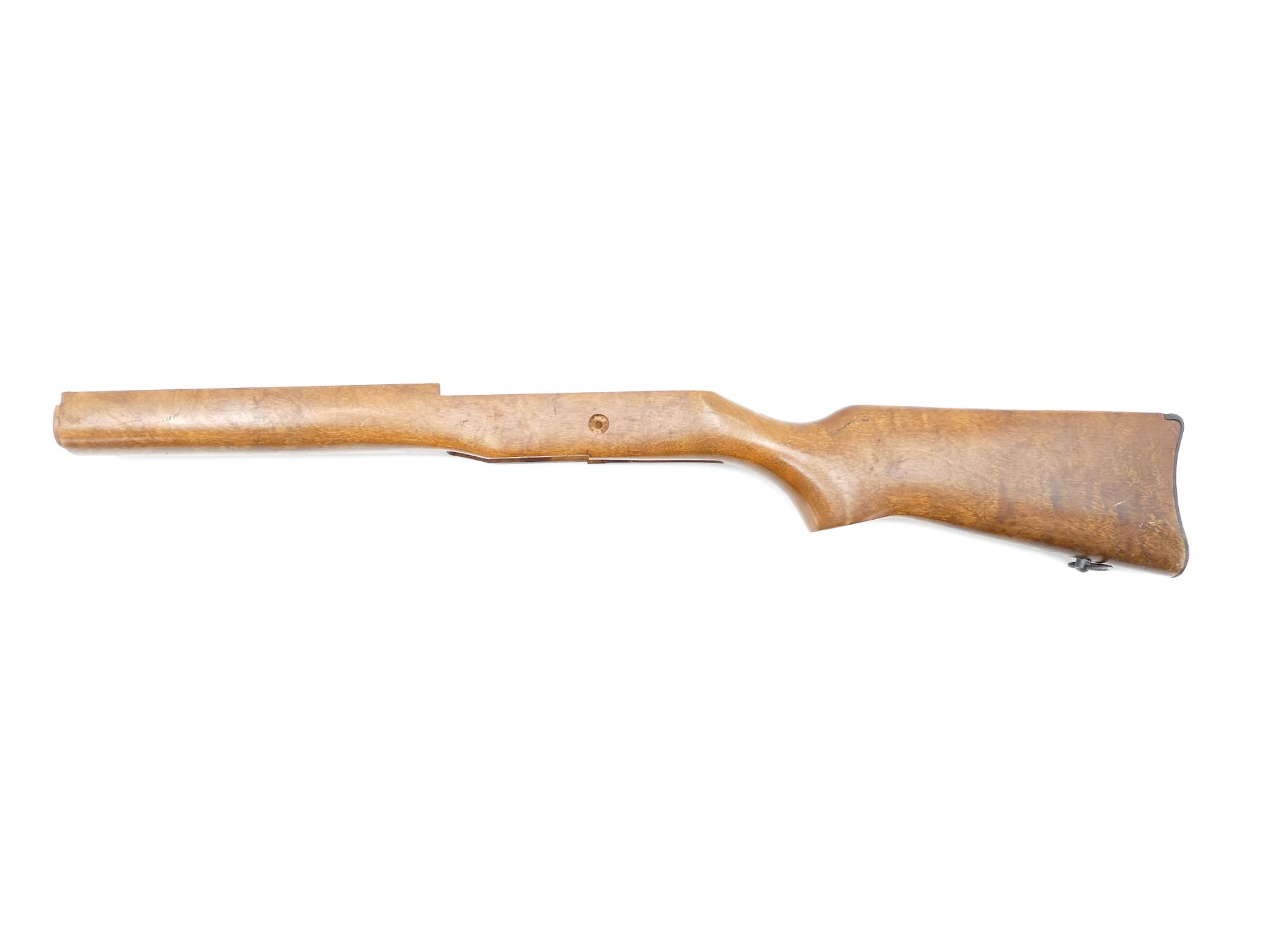 (1) WOODEN CONSTRUCTION, SMOOTH, UNMARKED, WITH REAR SLING SWIVEL, MAY HAVE SMALL CRACKS & CHIPS, OVERALL LENGTH APPROX. 28 3/8". MAY REQUIRE FITTING. SEE PHOTOS.
