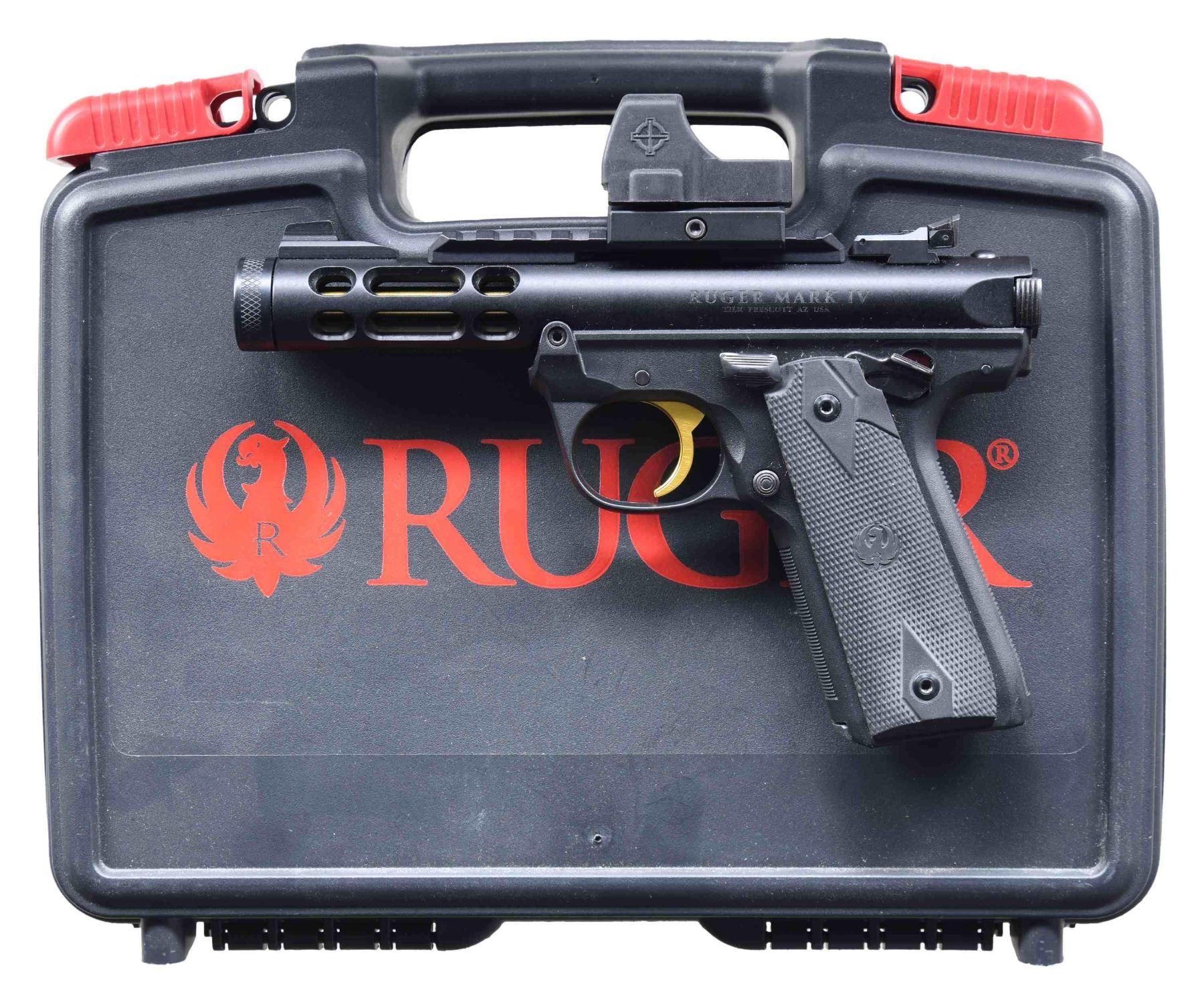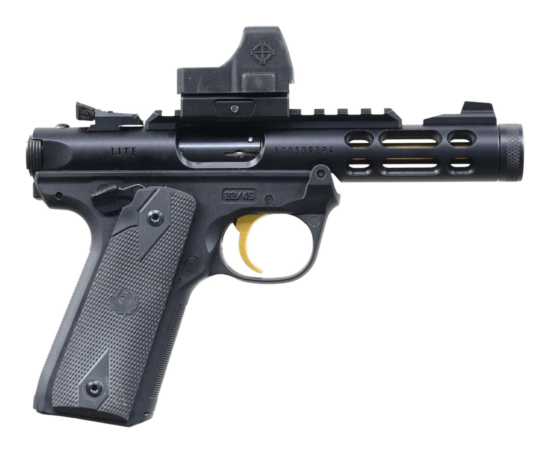 Cal. 22 LR. S# 500309294. Bbl. 4 3/8". Blade front sight. Adjustable square notch rear sight. Sightmark dot sight that does not appear to be turning on. Ambi safety. Gold colored bbl. & trigger. Balance of other parts have black anodized finish. Checkered black rubber 1911 style grips. MAGS: 2-10 rd. UNATTACHED ACCESSORIES: matching numbered factory hardcase & aftermarket softcase. CONDITION: grips show light handling wear. Metal retains nearly all its finish with light handling wear. Action functions properly when hand cycled. Very good + bright bore. (25-2021/MJC). MODERN. $250-400.